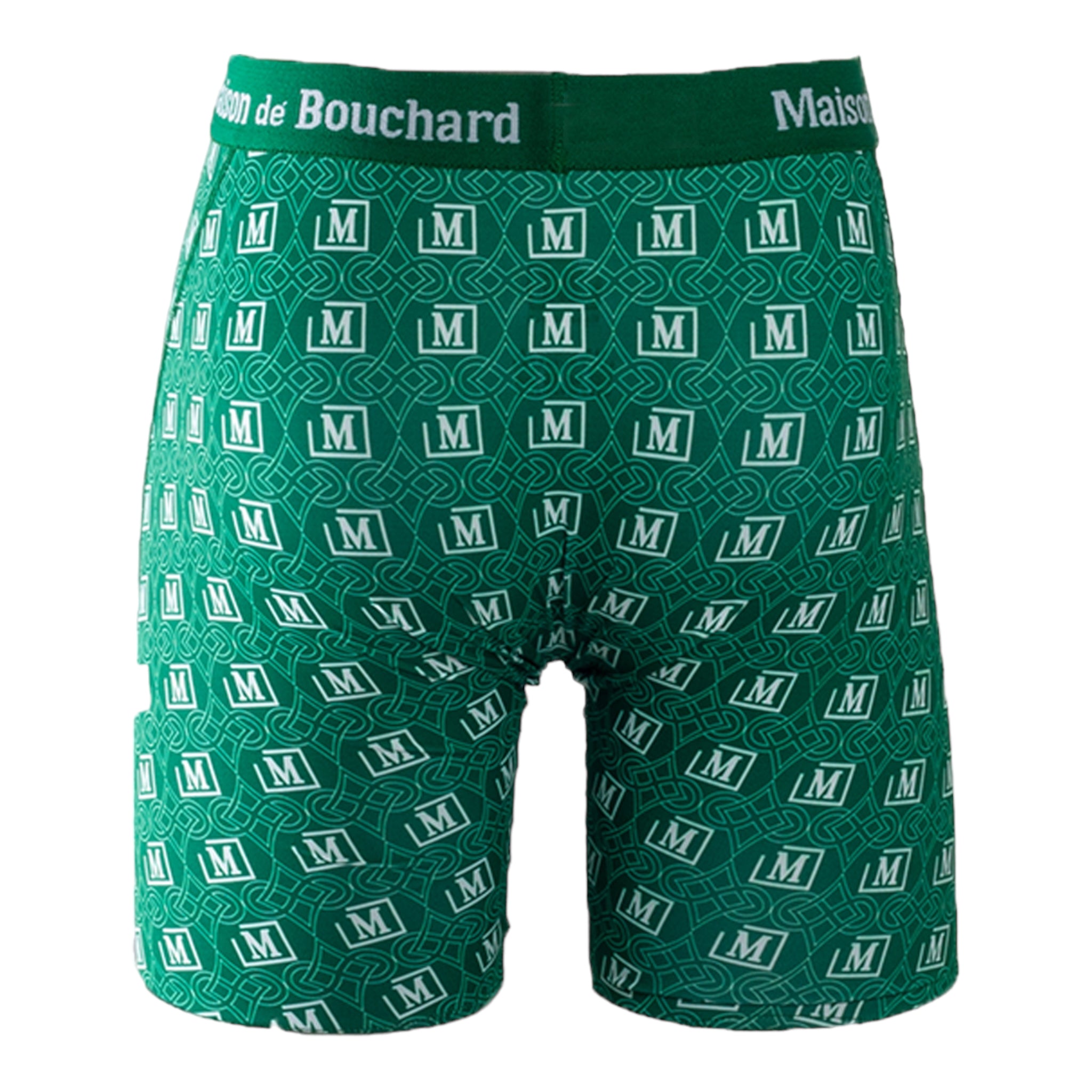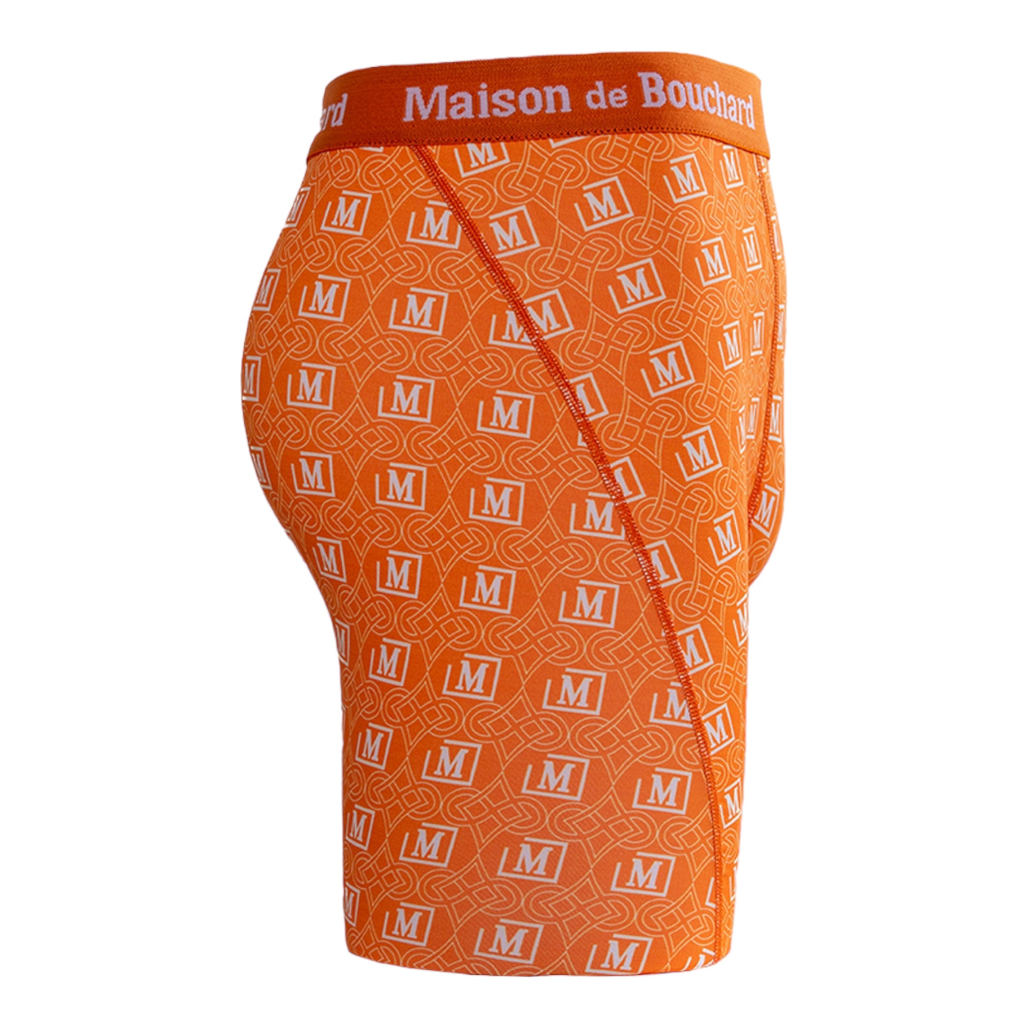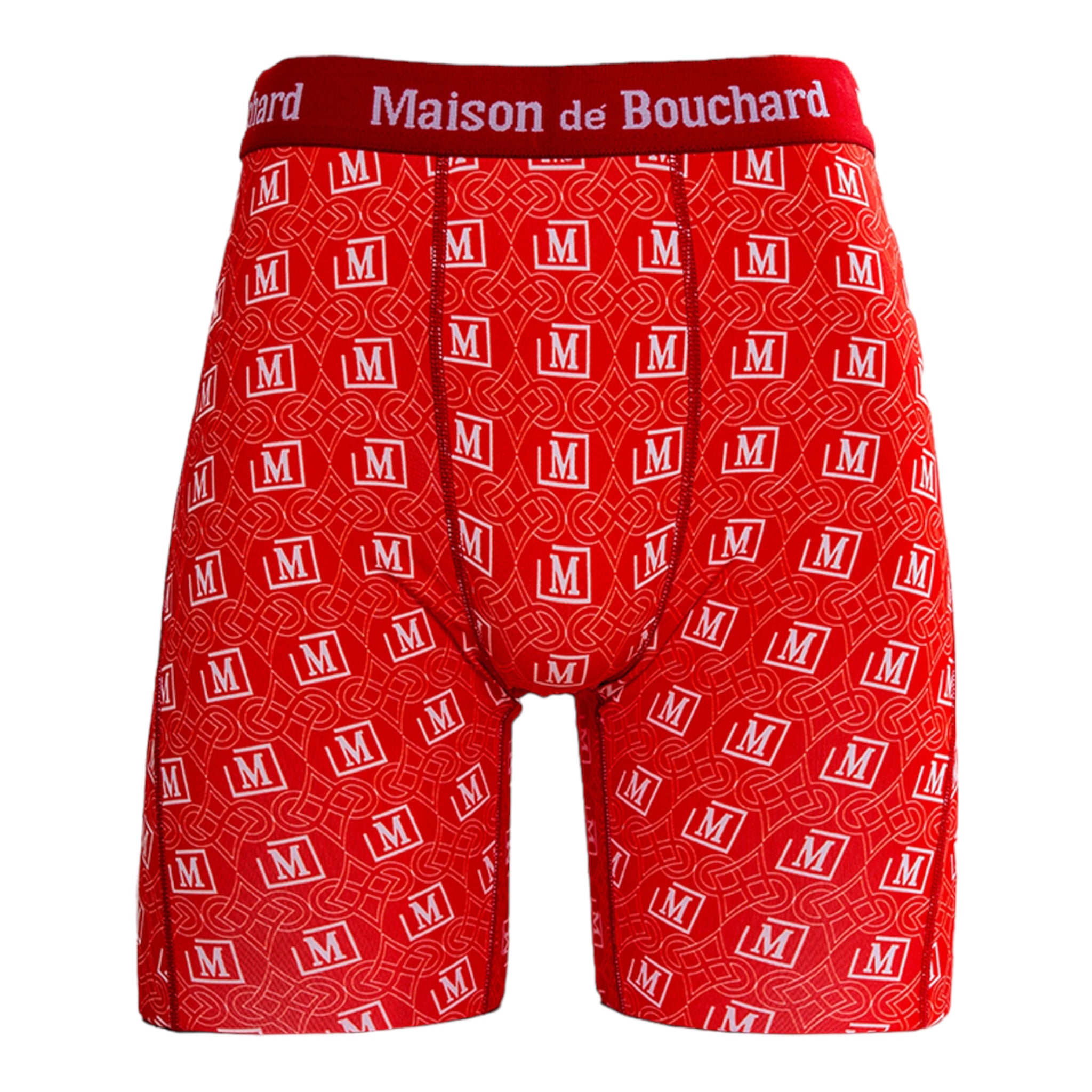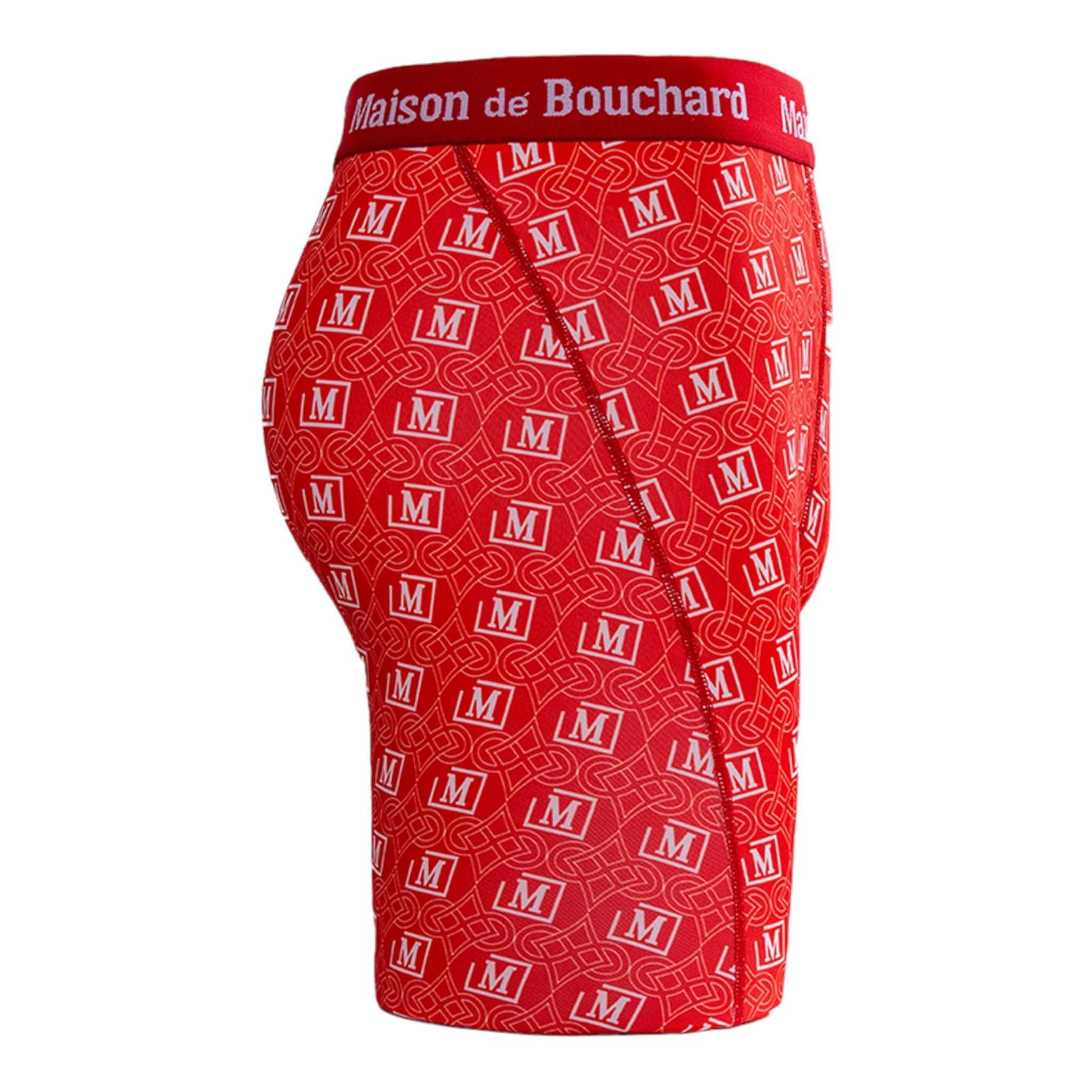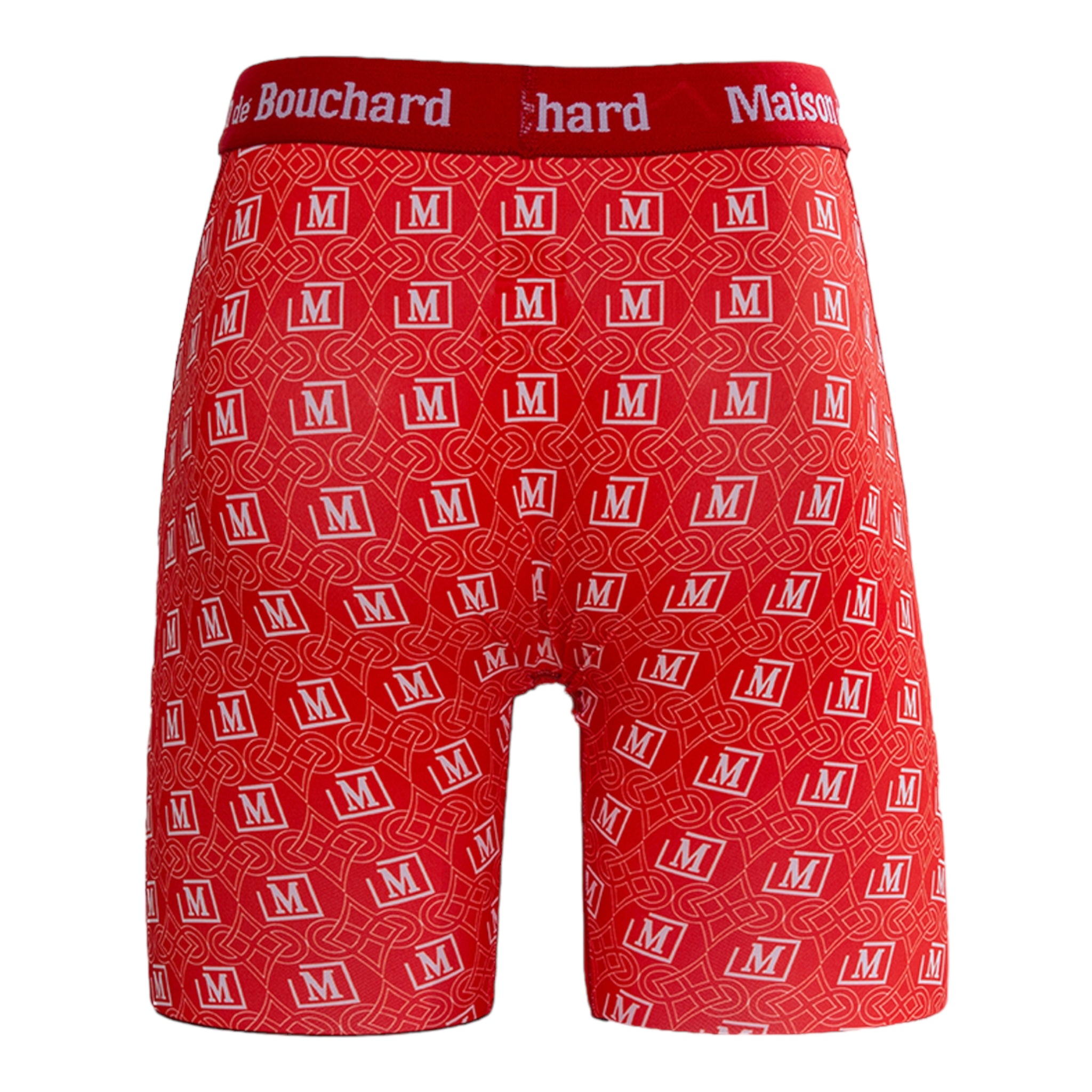 This edition features an all-over red and white monogram print with the iconic Maison de Bouchard “M” logo, paired with a matching branded waistband for a striking, standout look.