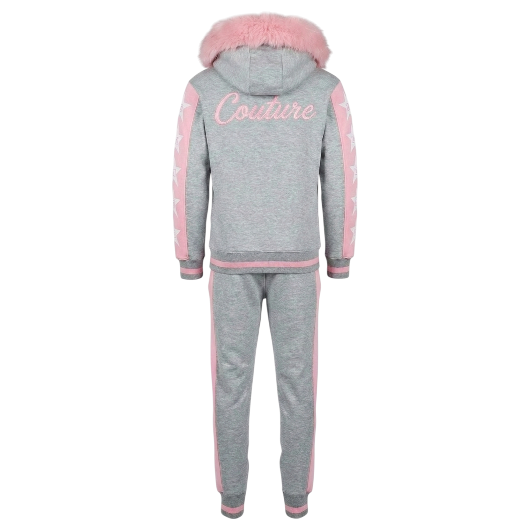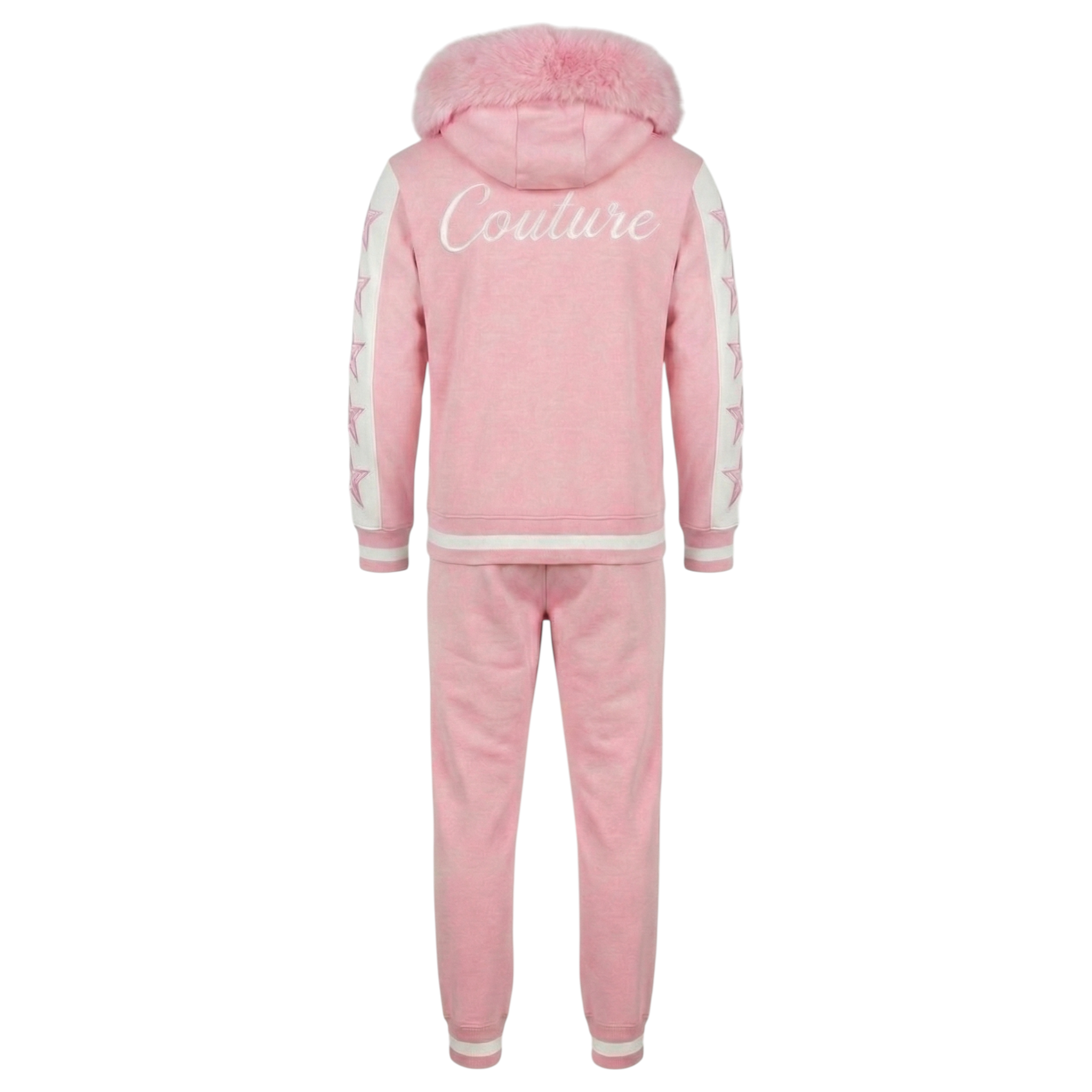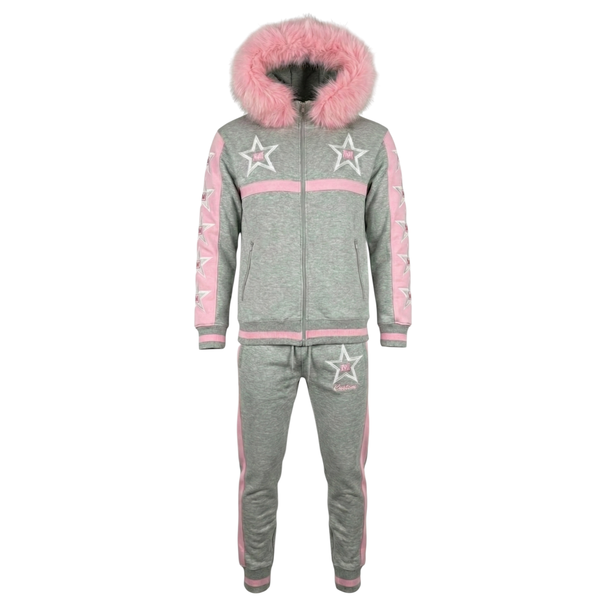 The full-zip hoodie provides a versatile fit, allowing you to layer with ease. For ultimate customization, it features a removable fur hood, letting you switch between a bold, cozy look and a sleek, sporty aesthetic in seconds. The matching drawstring pants ensure a secure, personalized fit around the waist for all-day comfort.