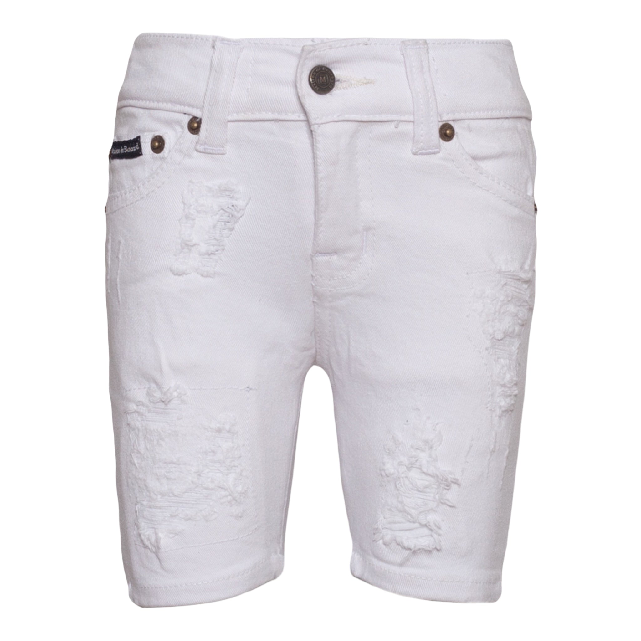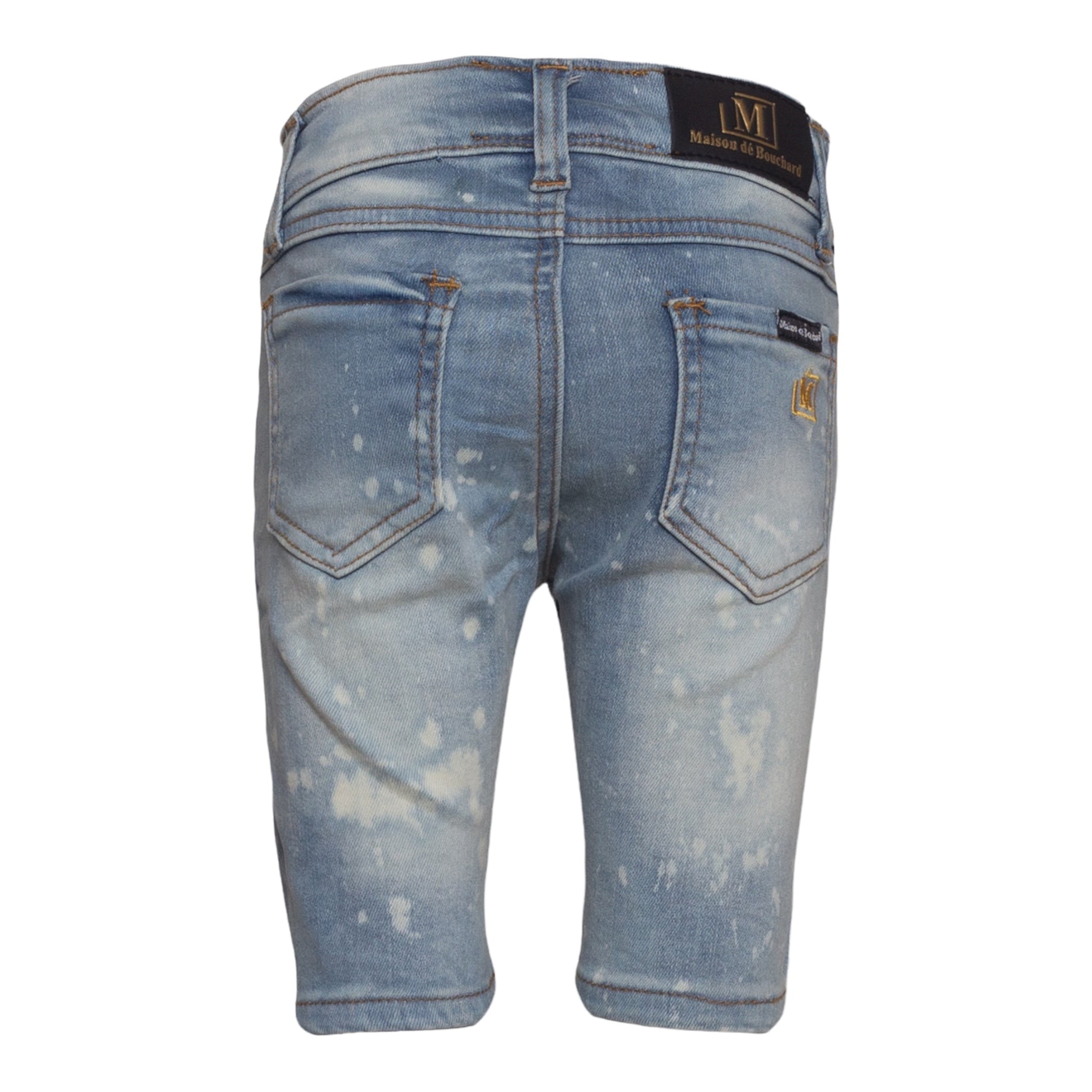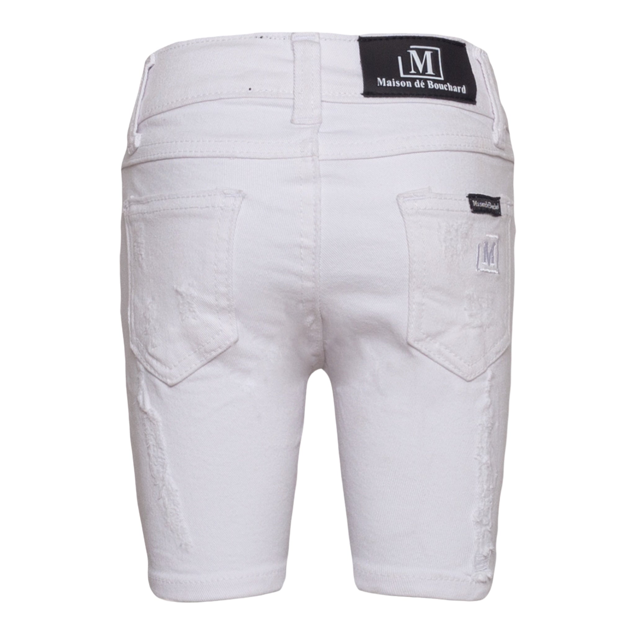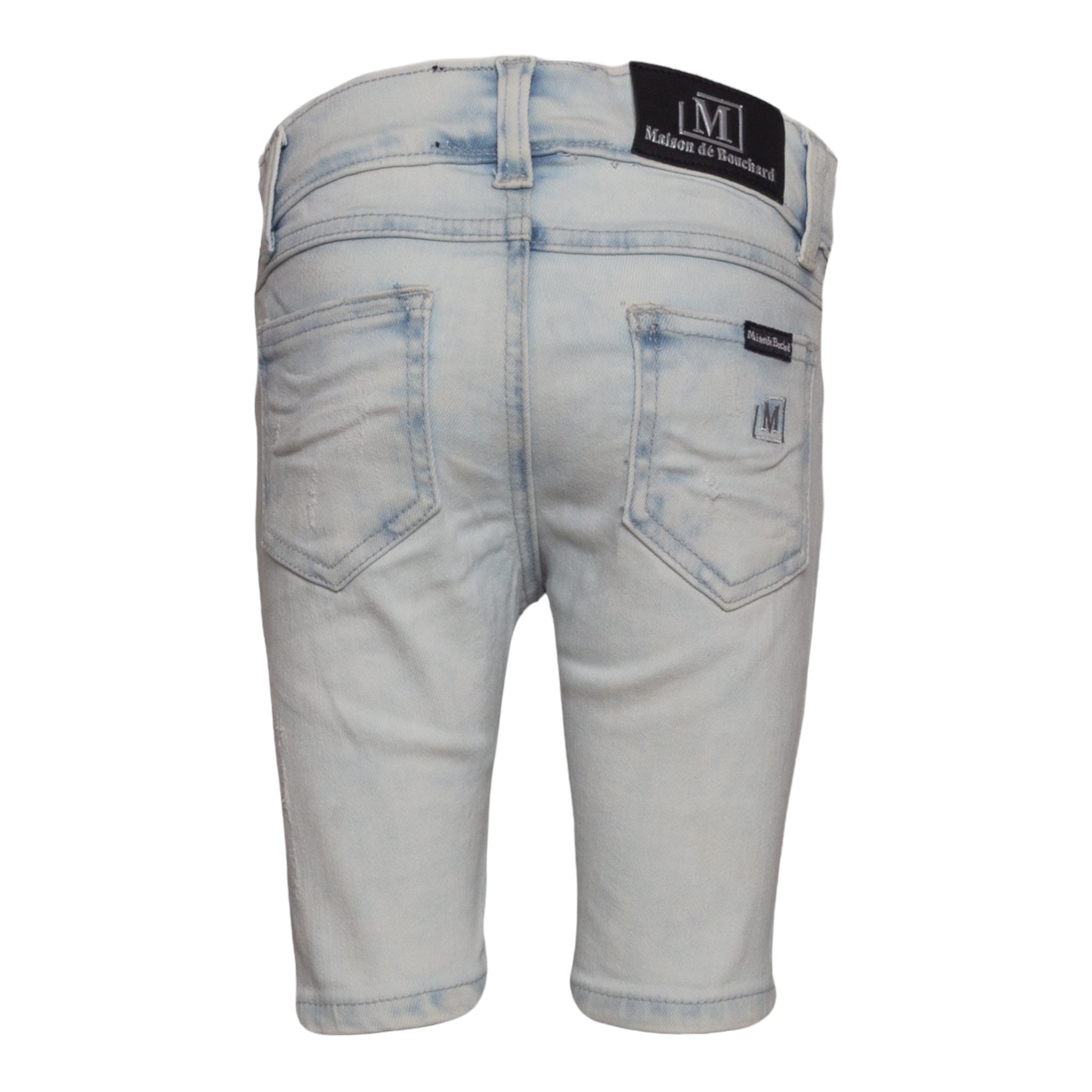 New Denim Shorts by MDB Brand, for kids! Stylish and trendy, these denim shorts each feature tasteful rips as well as interesting patterns. The MDB logo can be found embroidered on the back left pocket.