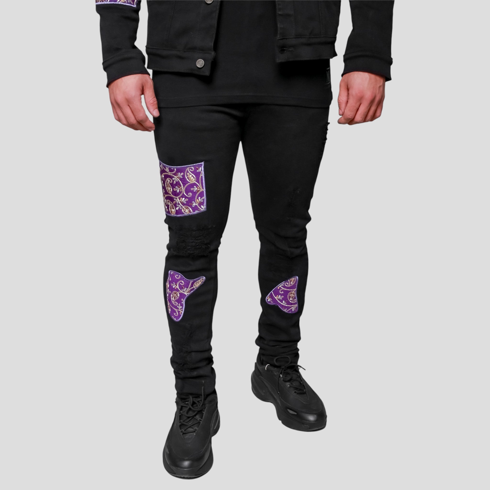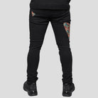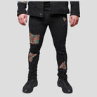 Strategically placed distressed accents and intricately embroidered tapestry patches create a standout luxury aesthetic, adding depth, contrast, and signature MDB edge. Perfect for casual styling or elevated streetwear looks, these jeans pair effortlessly with tees, hoodies, or jackets.