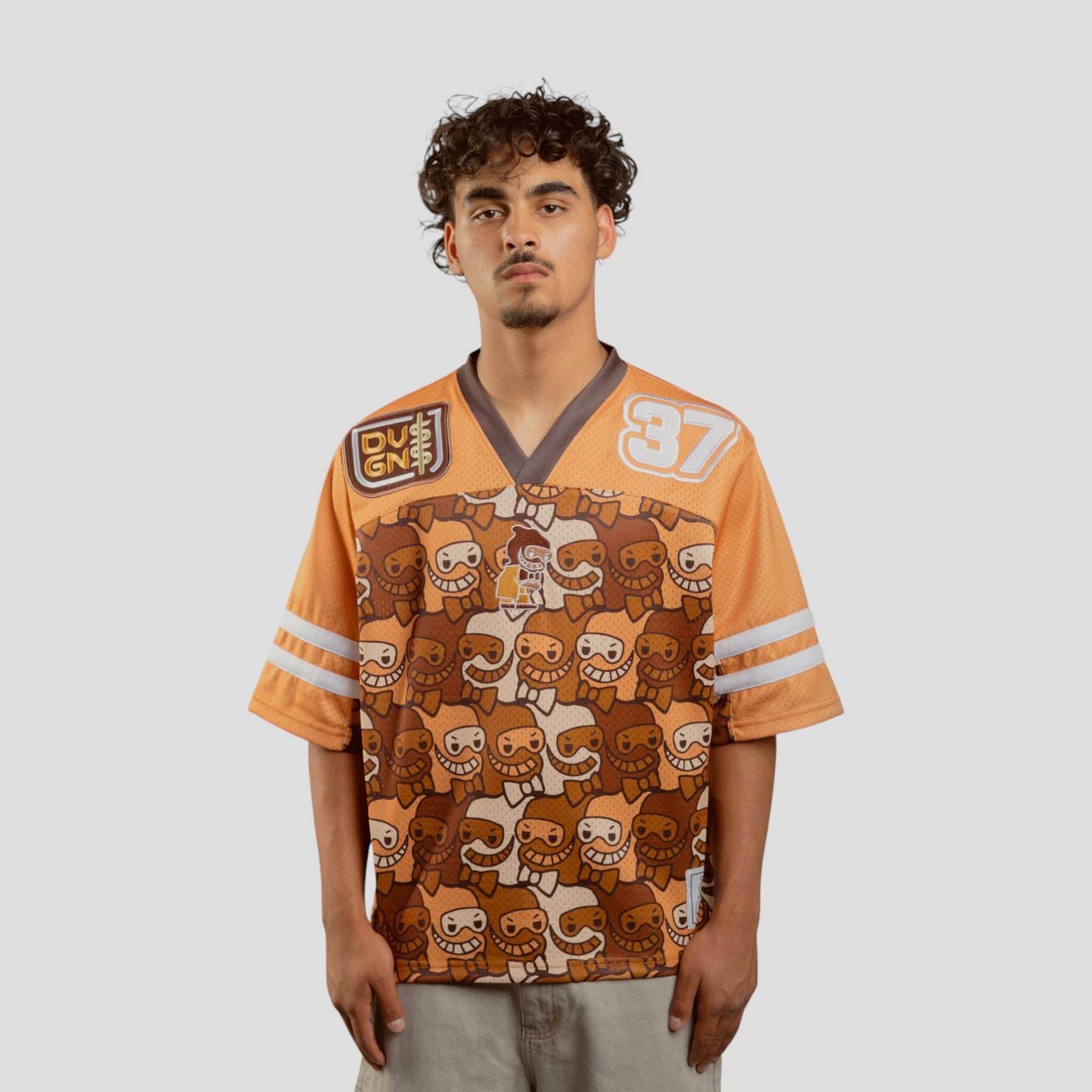 The design features an embroidered DVS GNS logo on the chest for a premium touch, paired with vibrant shoulder detailing that gives the piece a sporty edge. Across the body, an eye-catching all-over camouflage character print showcases DG’s signature playful style, packed with color, personality, and attitude.