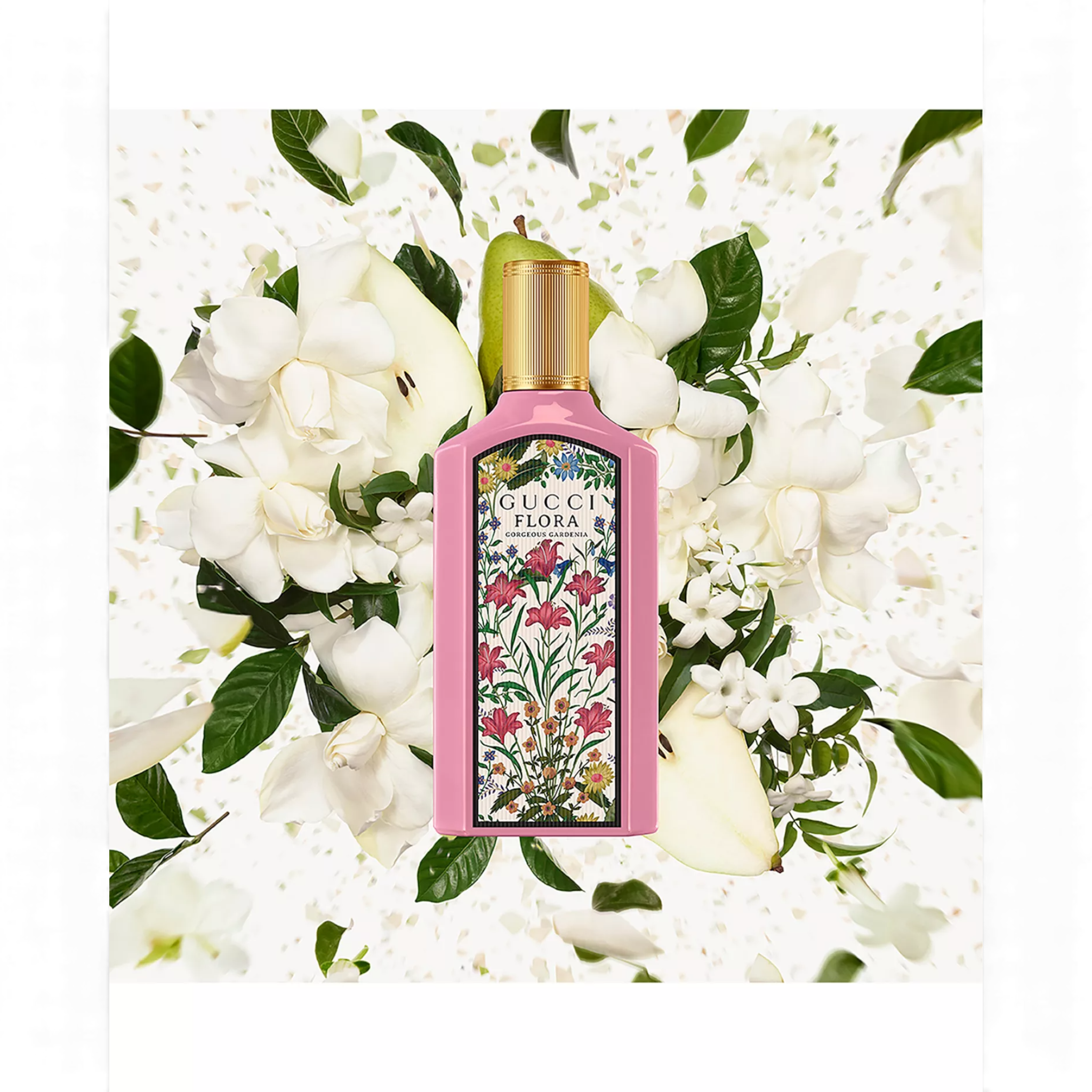 Gucci Flora Gorgeous Gardenia: An intensely feminine rich white floral scent combining an irresistible White Gardenia note with solar Jasmine Grandiflorum absolute. This potion of joy unfolds with Pear Blossom, while Brown Sugar adds subtle sweetness.