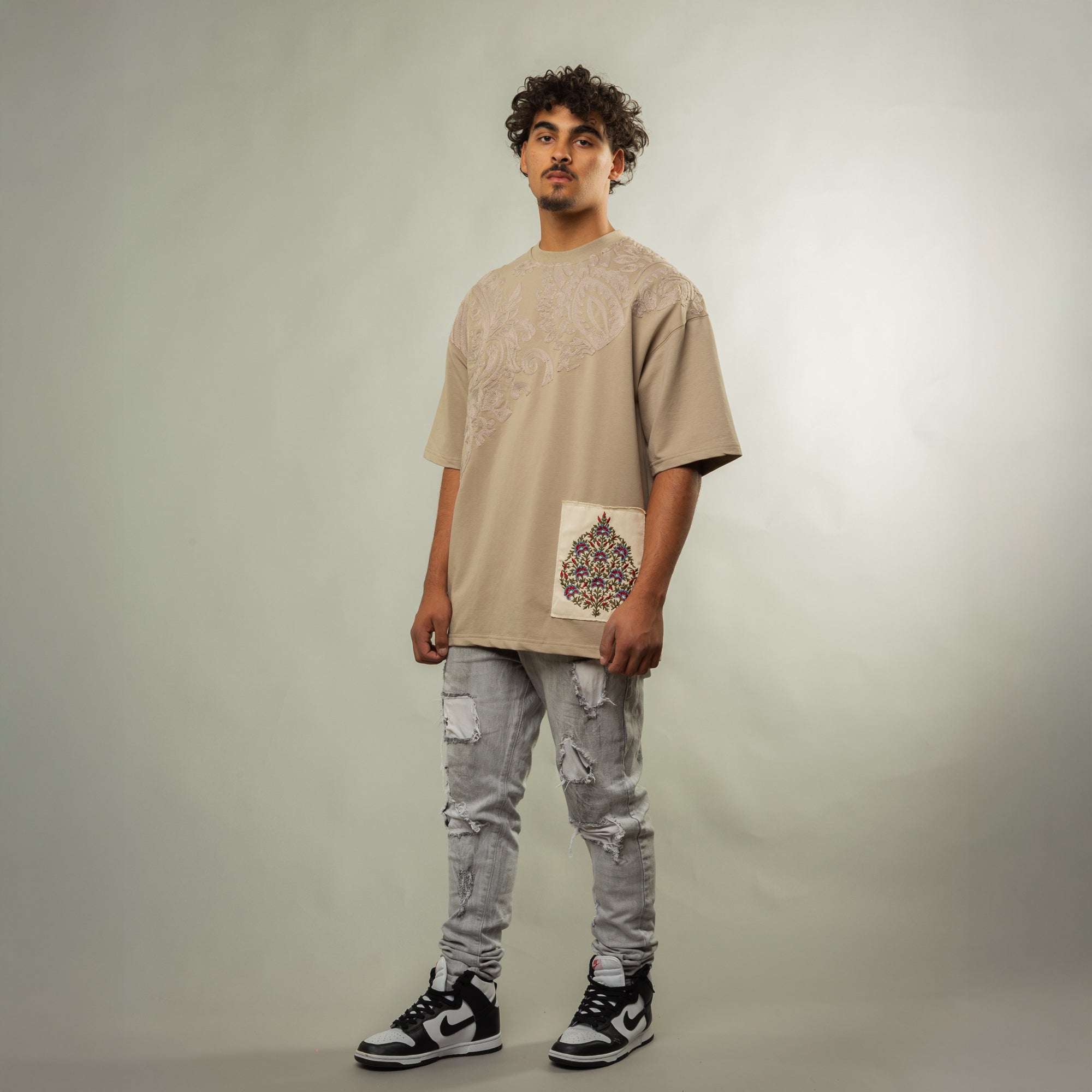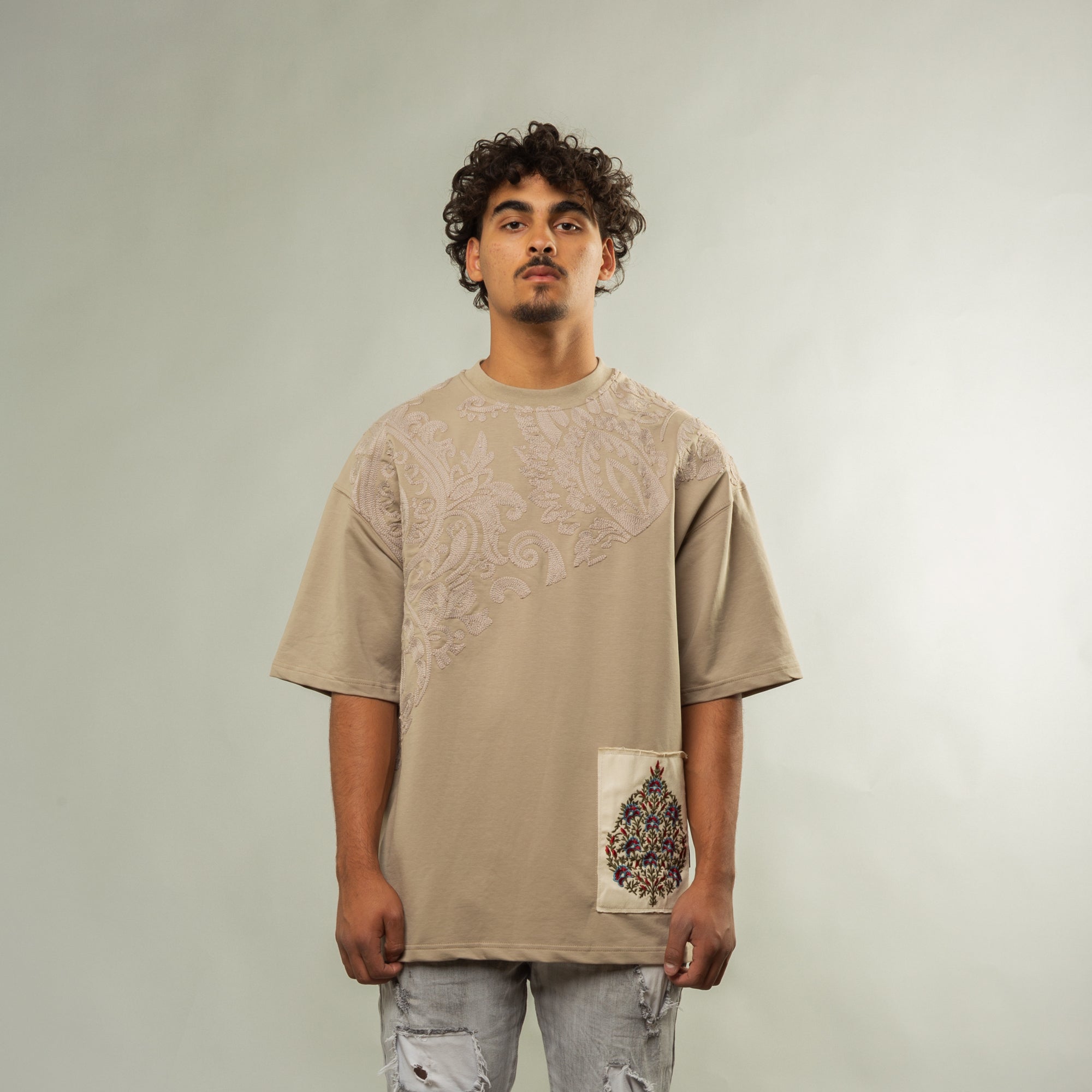 Wrap around embroidered detailing on front and back