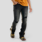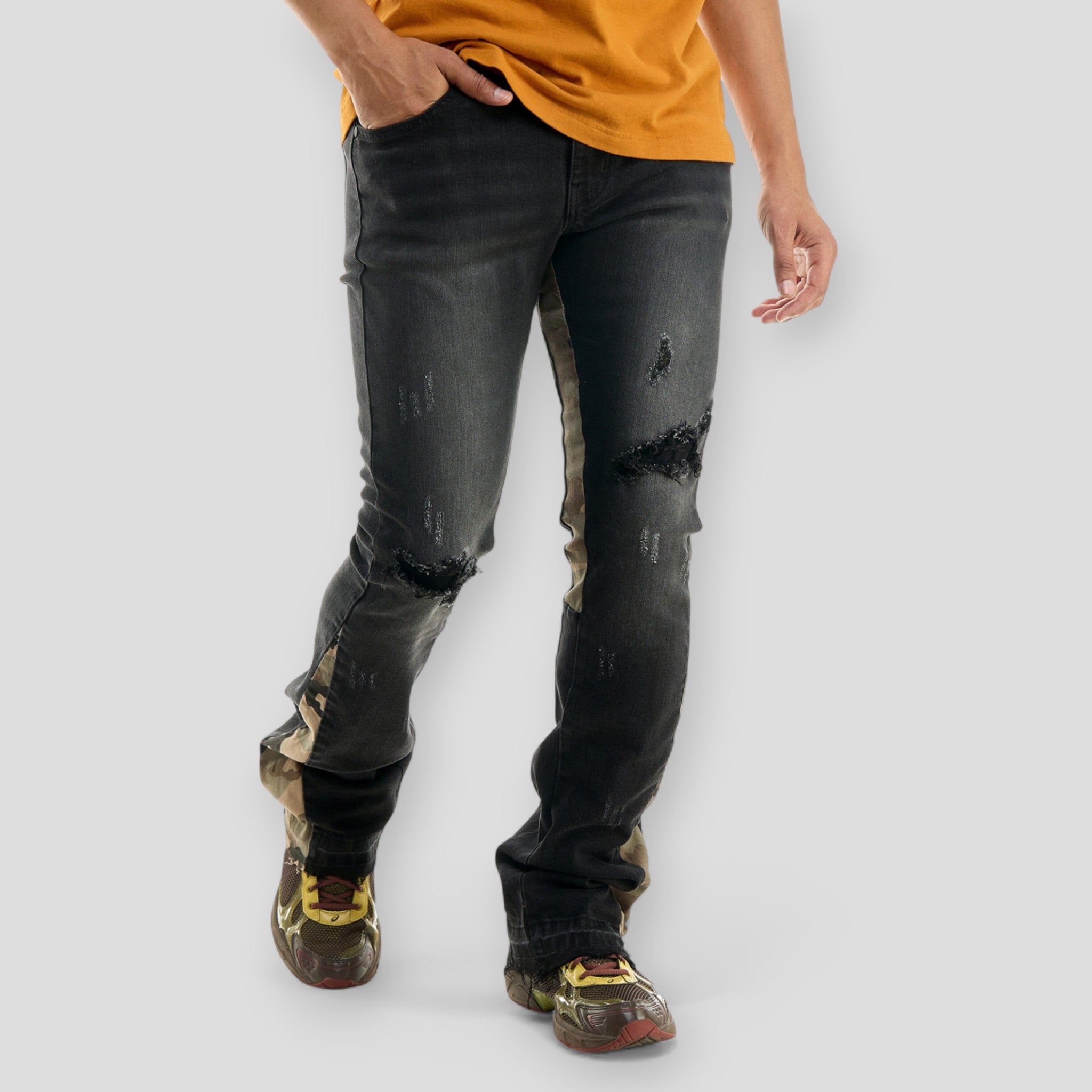 The camo paneling and stacked flare combo make these jeans a unique upgrade from standard distressed denim—perfect for anyone wanting to elevate their streetwear rotation.