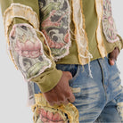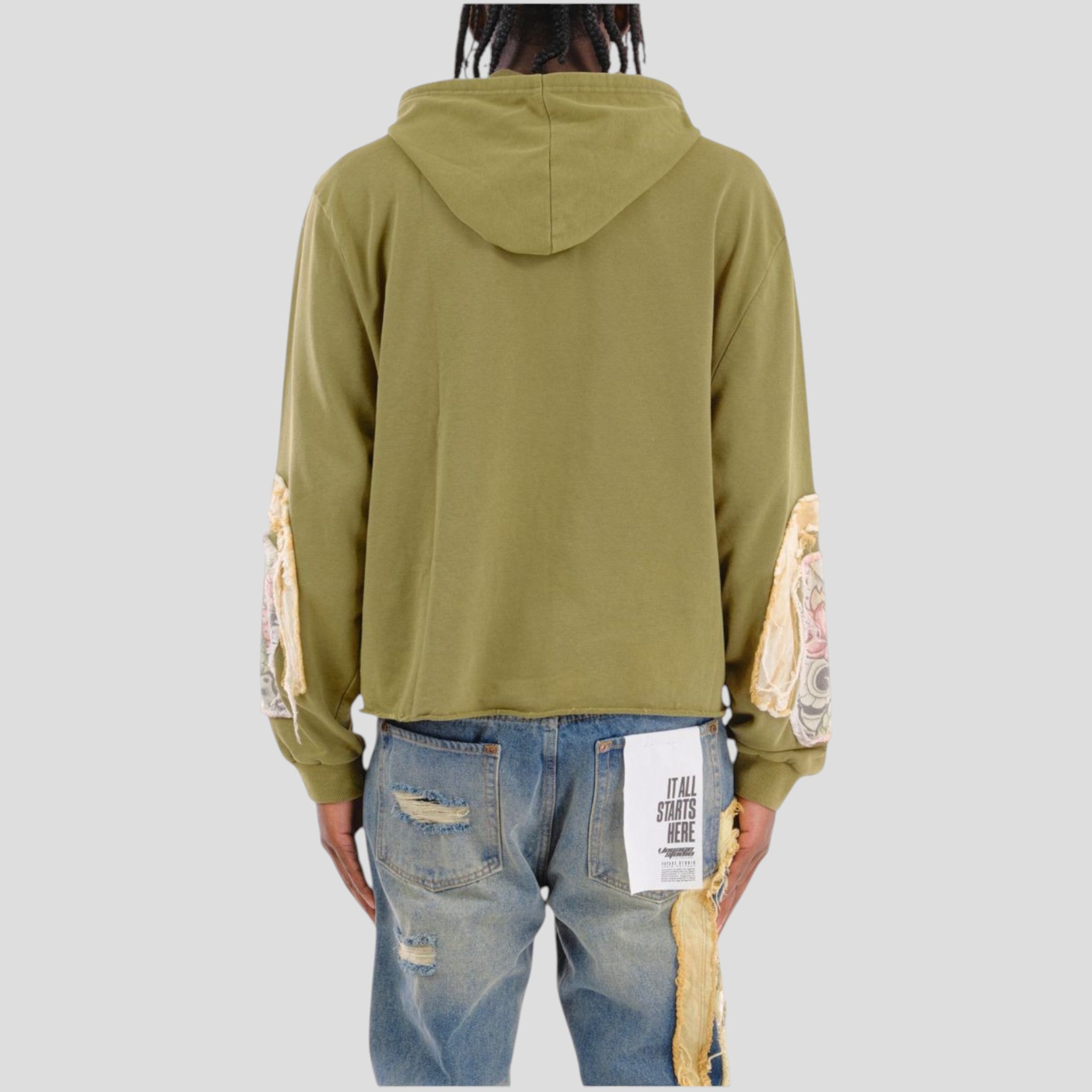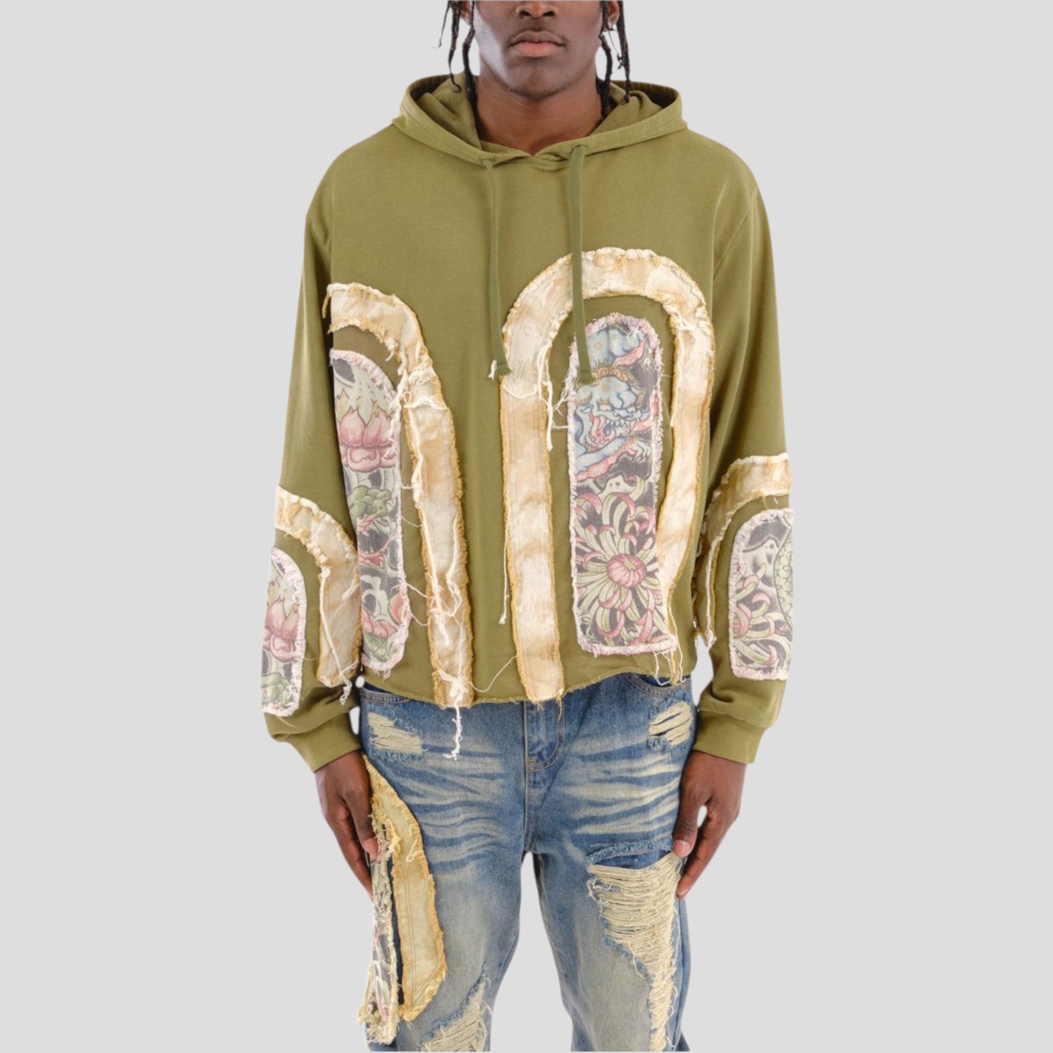 The cropped silhouette gives it a modern edge, while the distressed appliqué panels create a one-of-a-kind, artisan look. Soft cotton-blend fleece ensures comfort without sacrificing the premium feel.