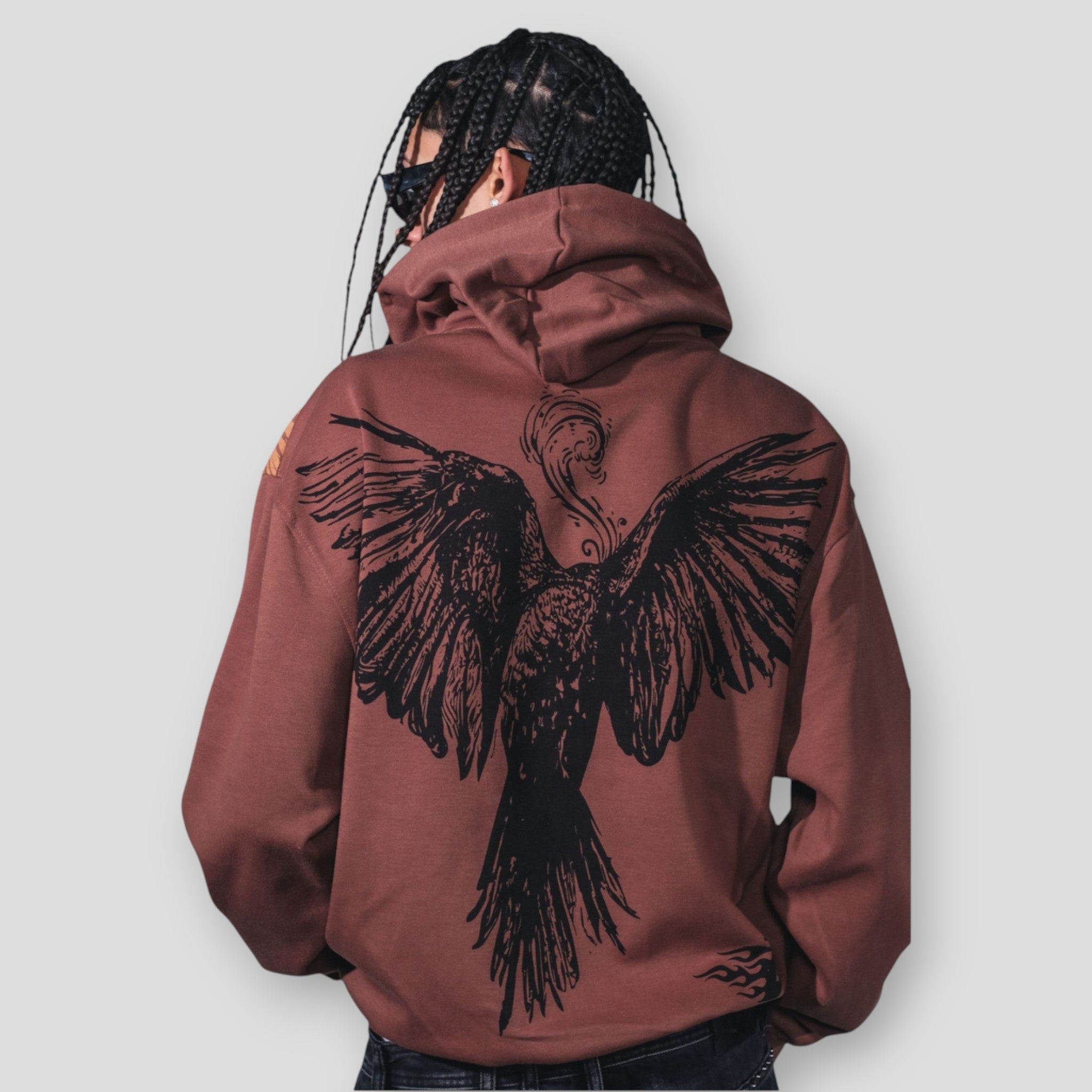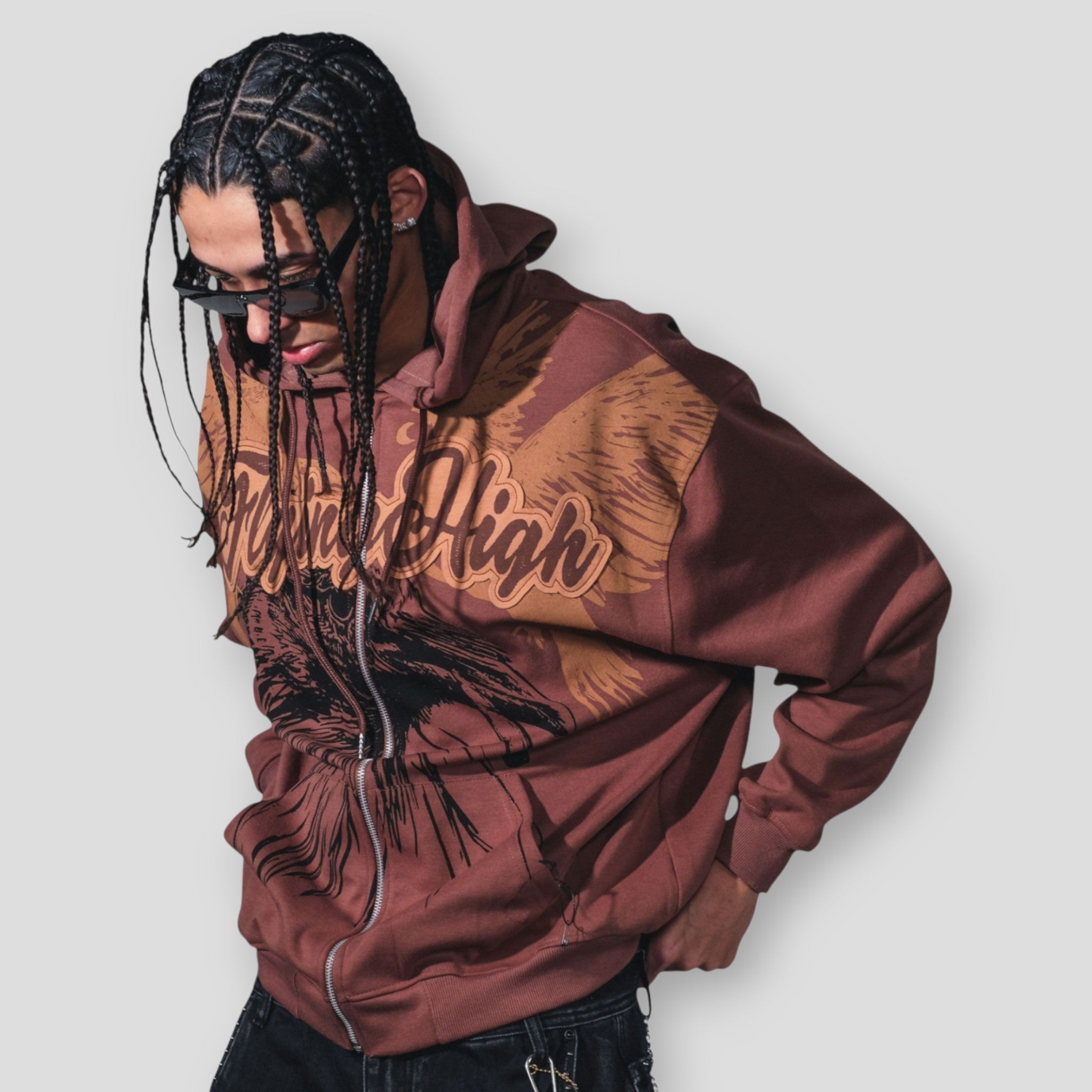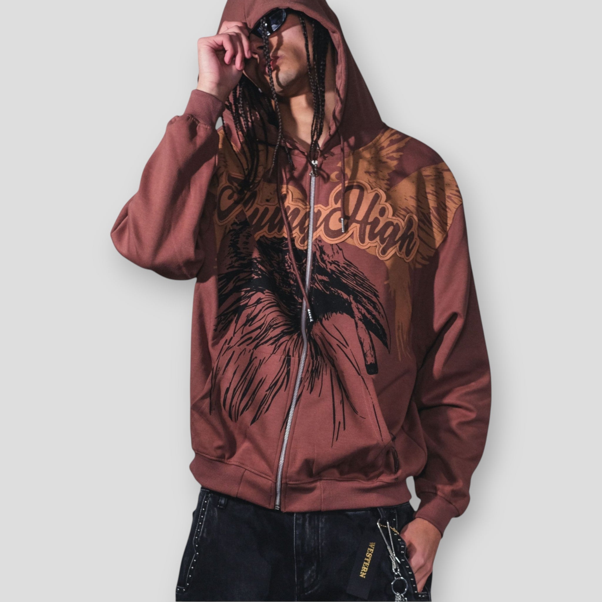Elevate your streetwear game with the Hidden Treasures 'Flying High' graphic hoodie. This statement piece combines vintage aesthetics with everyday comfort, featuring a bold graphic print of eagle wings and the text "Flying High" across the chest. Crafted from a comfortable and durable 60% cotton/40% polyester blend, this full-zip sweatshirt offers the natural softness of cotton with the added resilience of polyester. The rich brown color, often with a distressed or washed finish, adds a trendy, retro touch to any casual outfit.