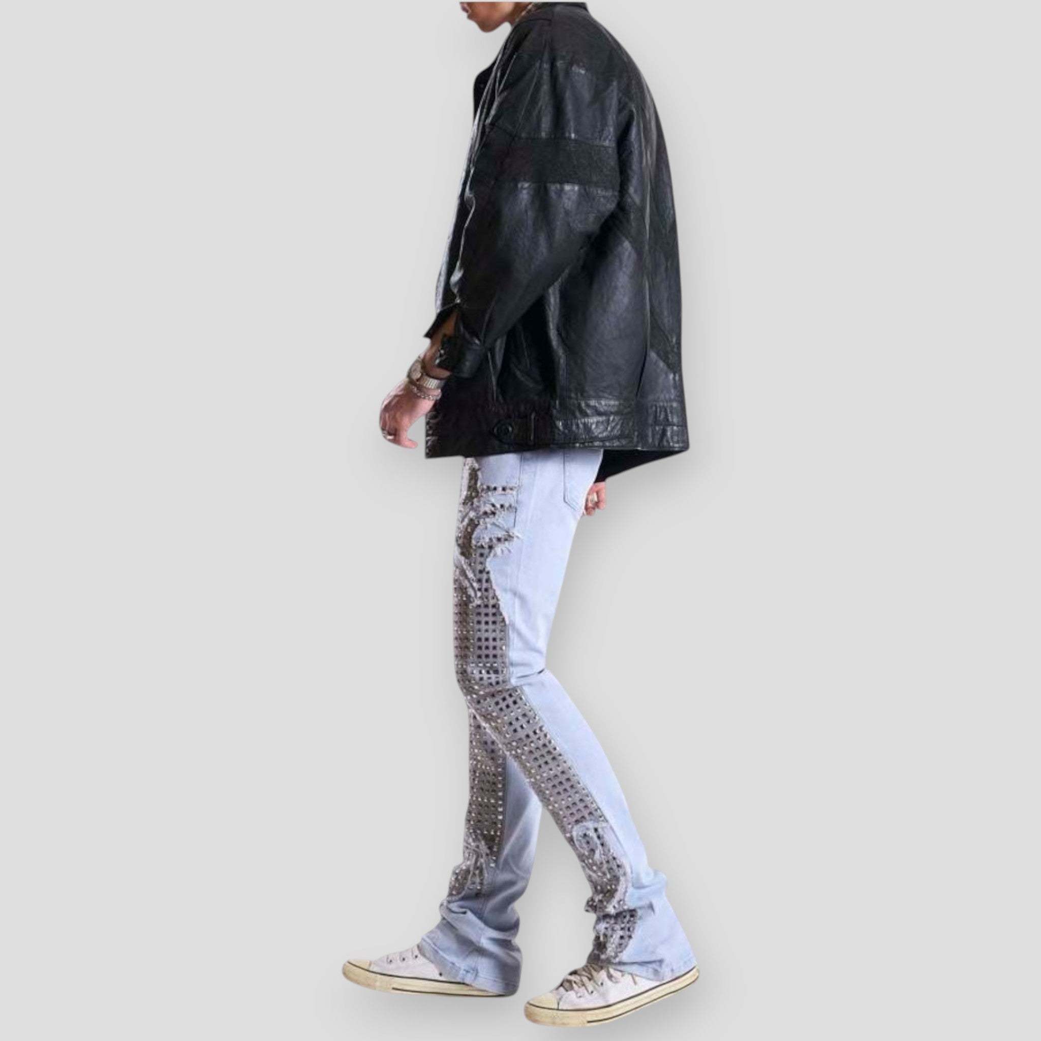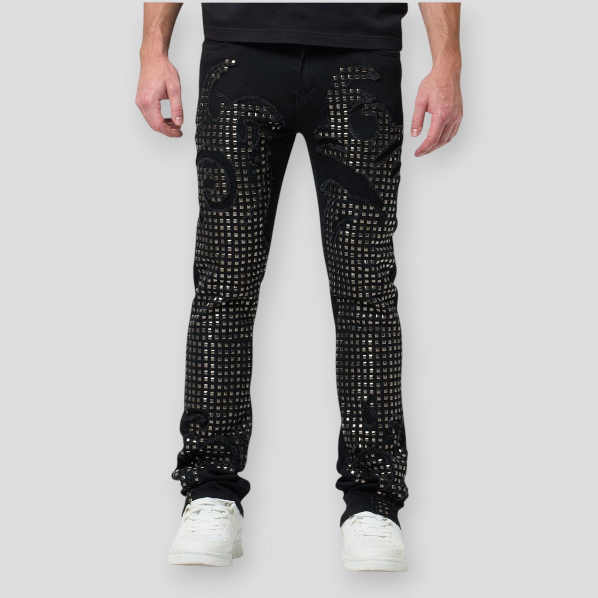 Designed with a slim stacked fit, the silhouette tapers through the leg while stacking naturally at the ankle for a modern street-ready look. The denim features an all-over geometric grid stud pattern with flowing heritage-inspired motifs, creating depth, texture, and a strong visual statement throughout the leg.