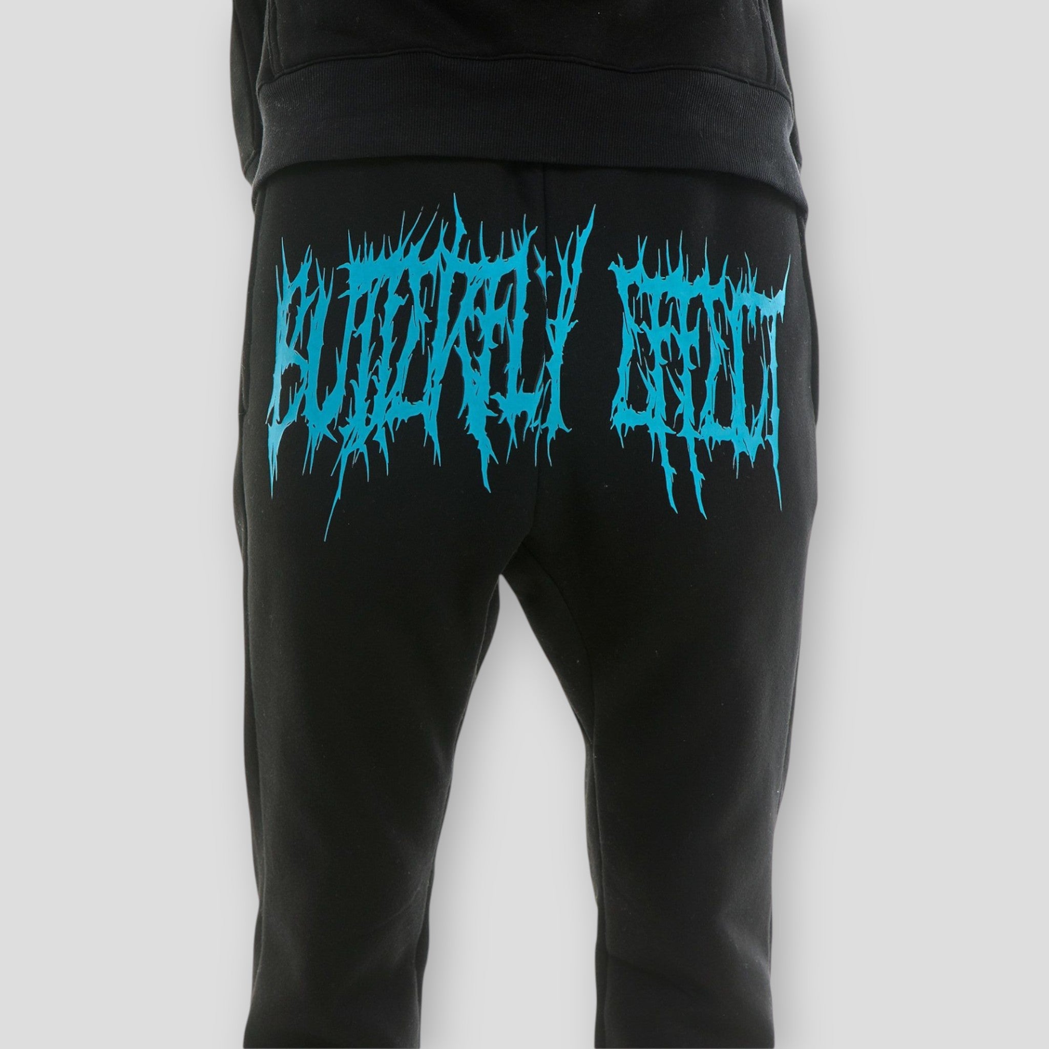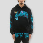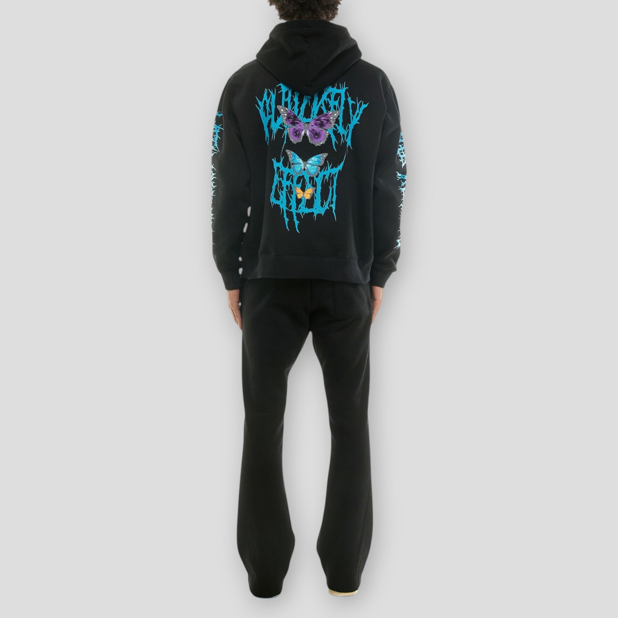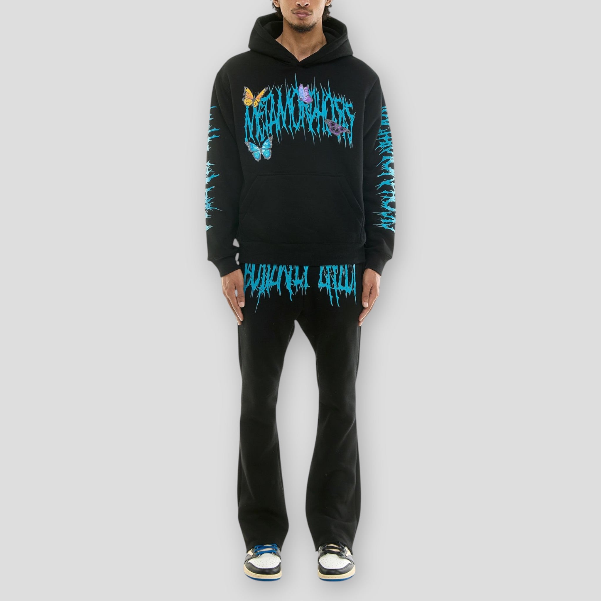 Experience a radical transformation in style with the exclusive Hidden Treasures "Metal Morphose" Hoodie Sweat Set. This striking black tracksuit features unique, vibrant blue graphic prints that mimic melted metal or a fierce, dripping logo, while delicate blue and purple butterflies add a touch of contrasting life to the edgy design. This set captures a bold, heavy metal aesthetic and is made with a comfortable fabric blend (often 60% cotton/40% polyester), perfect for streetwear enthusiasts who want to make a statement