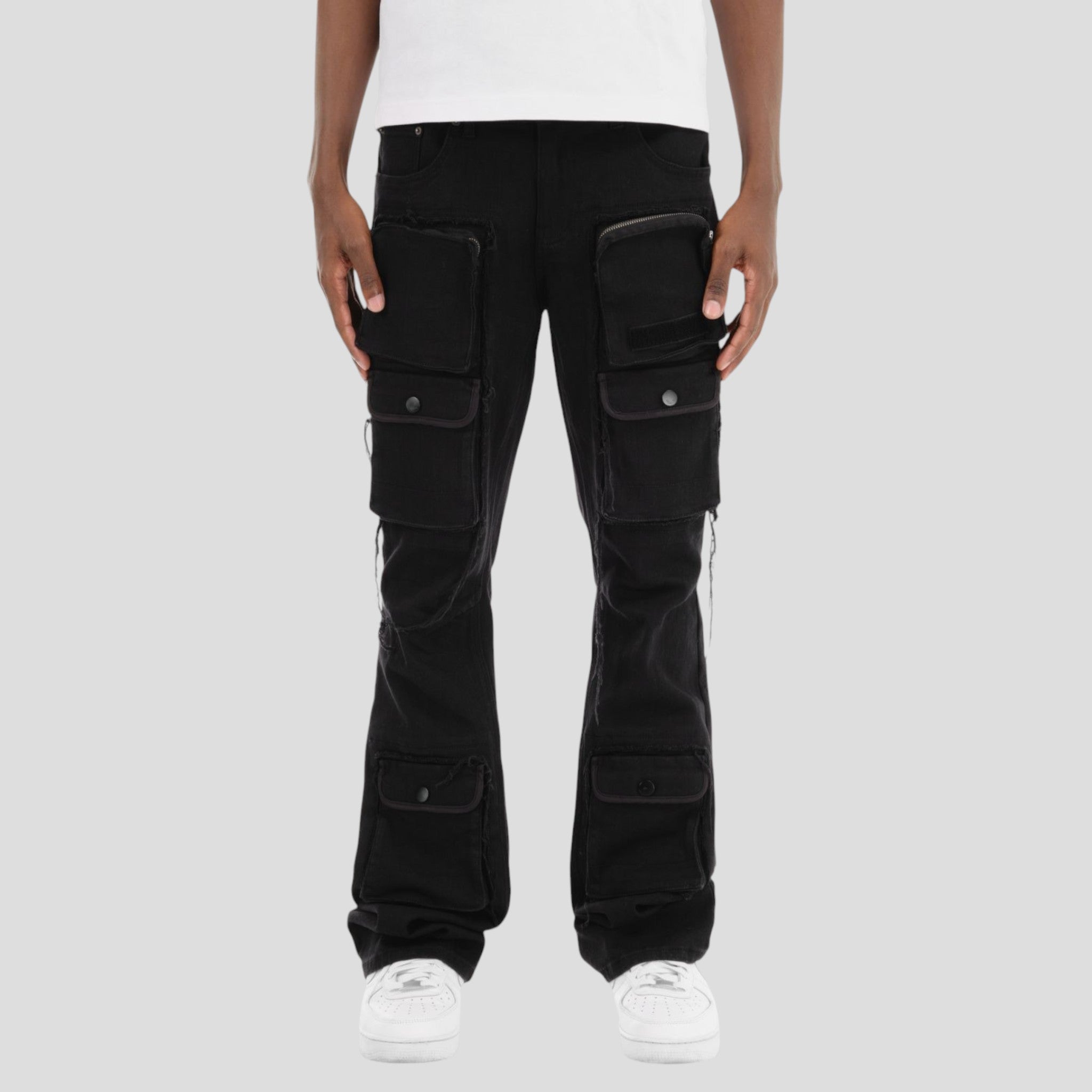 Command attention with tactical style in the Hidden Treasures “Utility Stacked” Multi-Pocket Cargo Jeans — a bold fusion of streetwear function and elevated design. Built for creators, movers, and trend-setters, these jeans bring a rugged aesthetic with their stacked silhouette, oversized cargo pockets, and raw distressed edges.