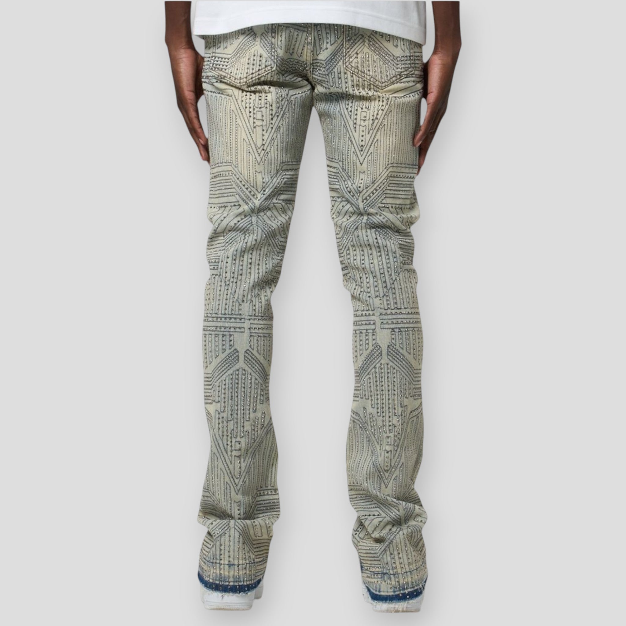 Designed with an all-over heritage-inspired stud pattern, the detailing features symmetrical linework and symbolic geometry influenced by traditional Pacific and ancestral art forms—reimagined through a contemporary streetwear lens. The slim stacked fit shapes the leg for a sharp silhouette, while the subtle flared ankle creates a natural stacked look over sneakers.