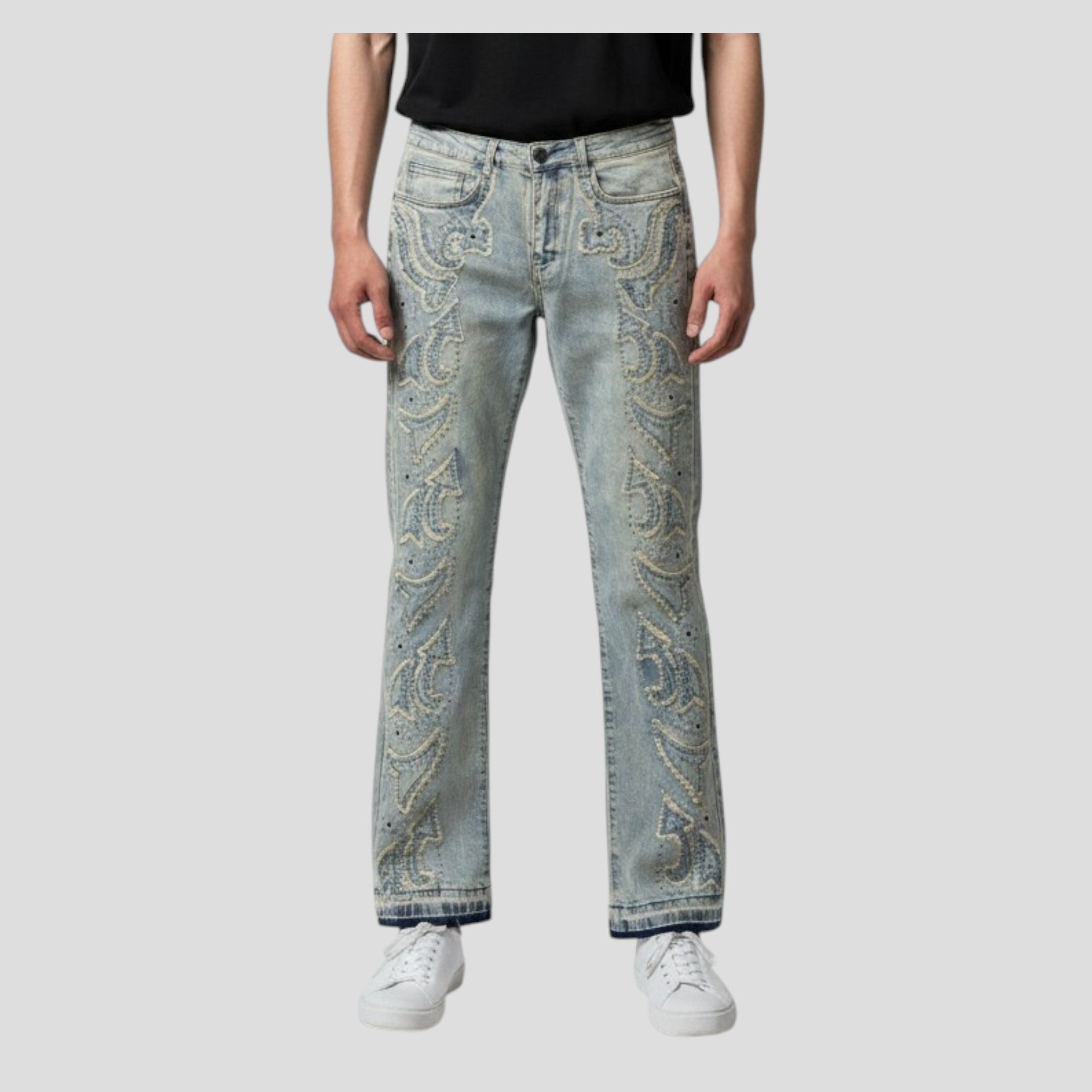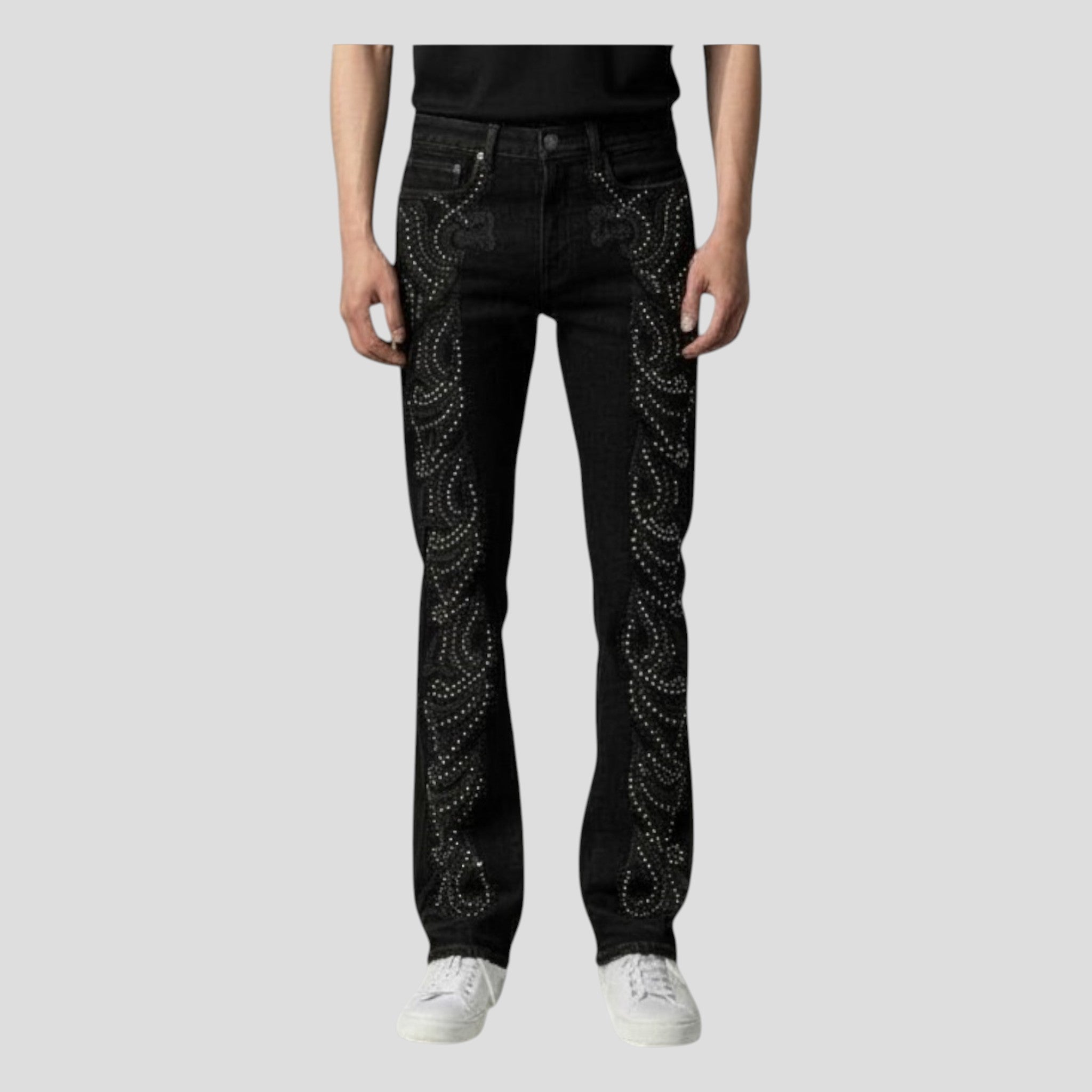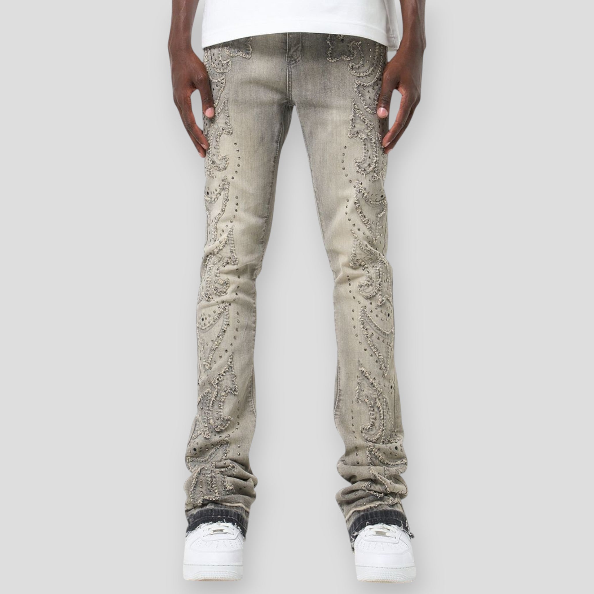 Intricate embroidered scrollwork detailing runs down each leg, accented with gunmetal stud embellishments for a refined yet bold look. The slim stacked fit creates a modern silhouette, while the unfinished flared ankle hem delivers a raw, fashion-forward edge. A classic 5-pocket design completes the look, making these jeans as functional as they are eye-catching.
