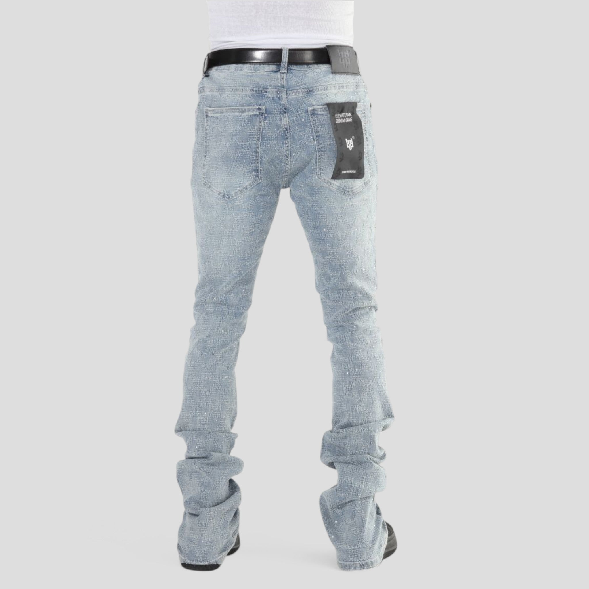 Step into the spotlight with the Hidden Treasures Rhinestone Embellished Stacked Flare Jeans. Designed to elevate any fit, these jeans feature an all-over rhinestone application that catches and reflects light with every movement — giving the denim a premium, high-impact shine. The diamond-textured detailing throughout adds depth and dimension, turning a classic jean silhouette into a bold statement piece.
