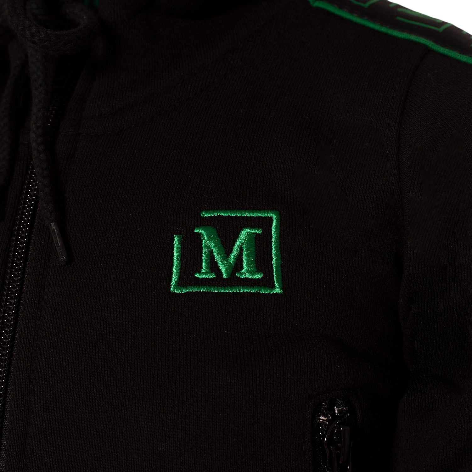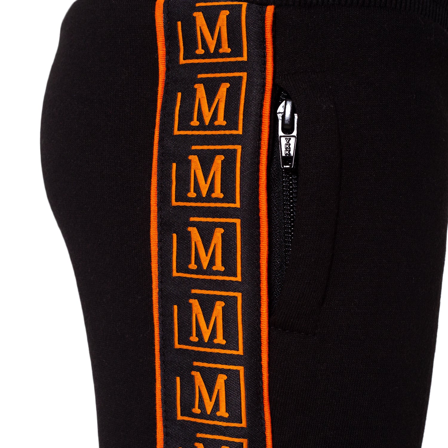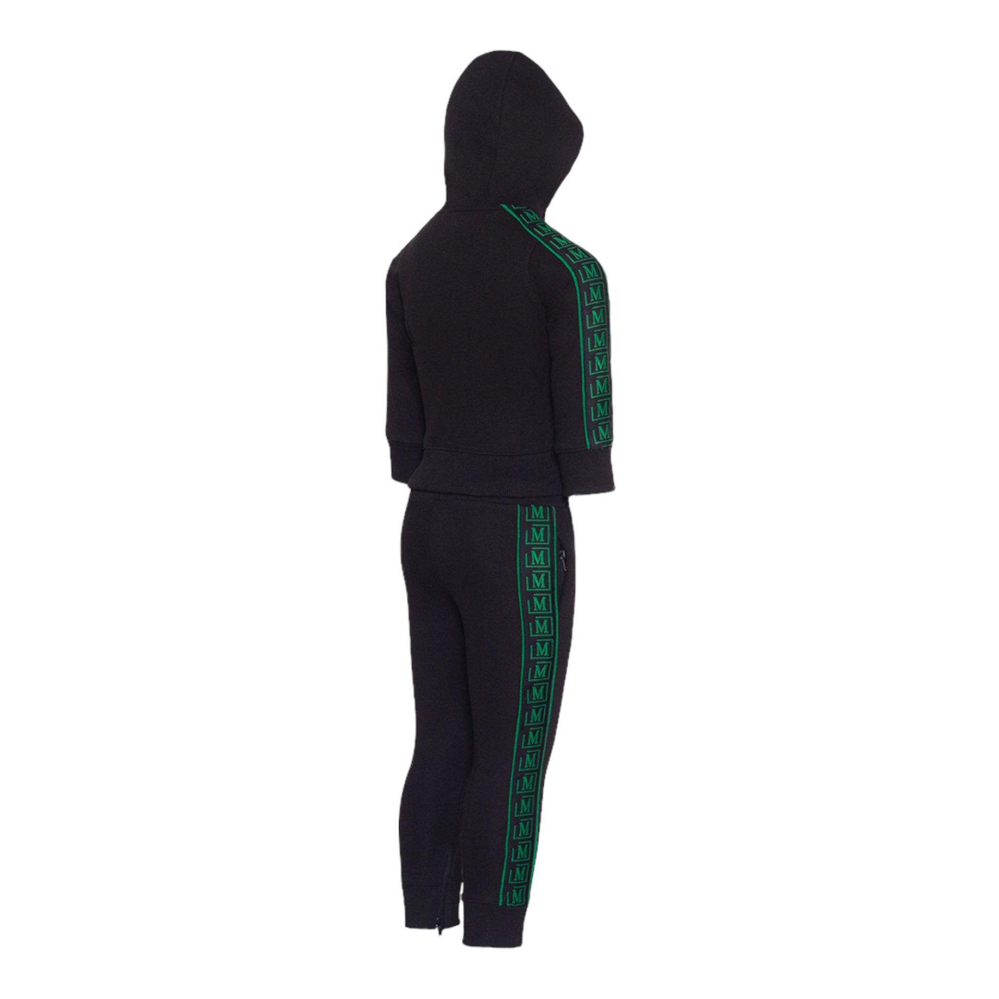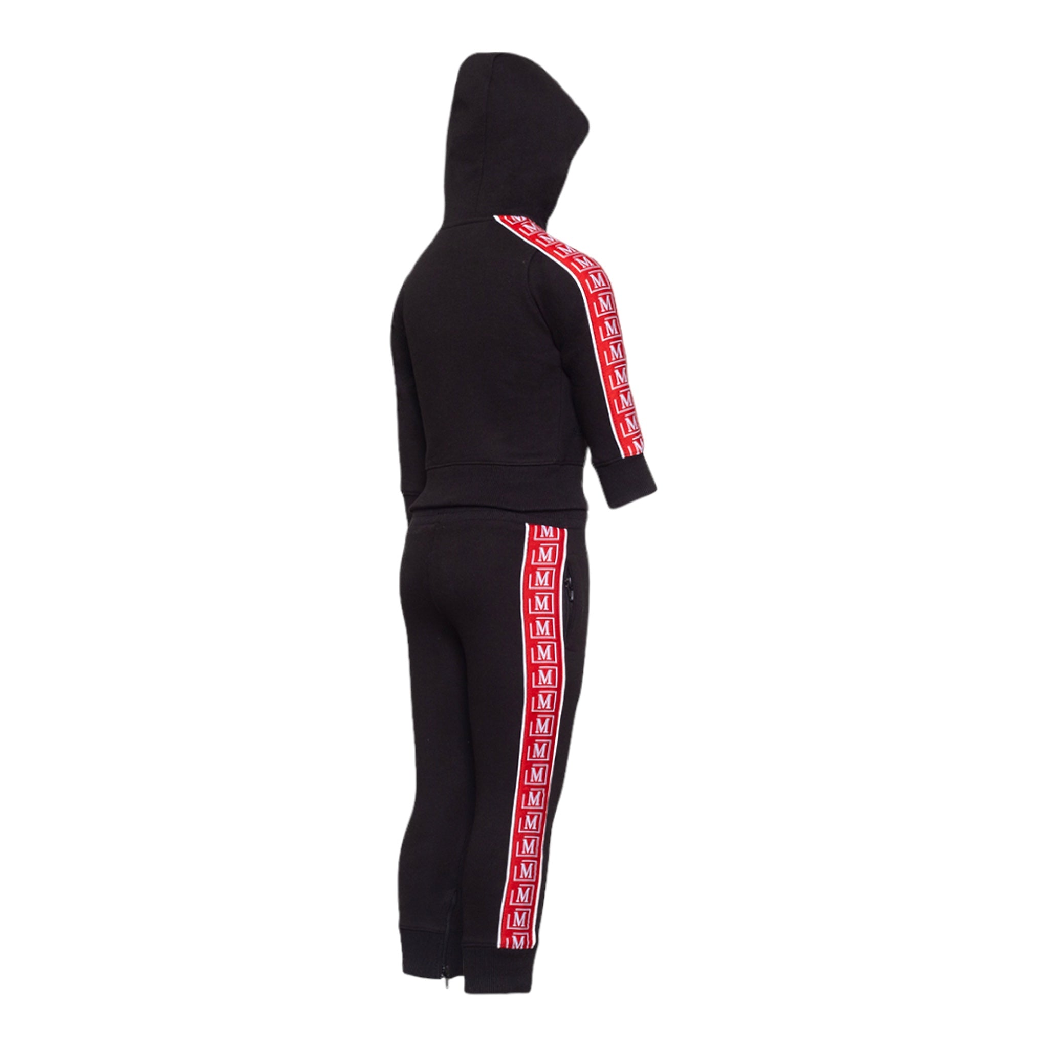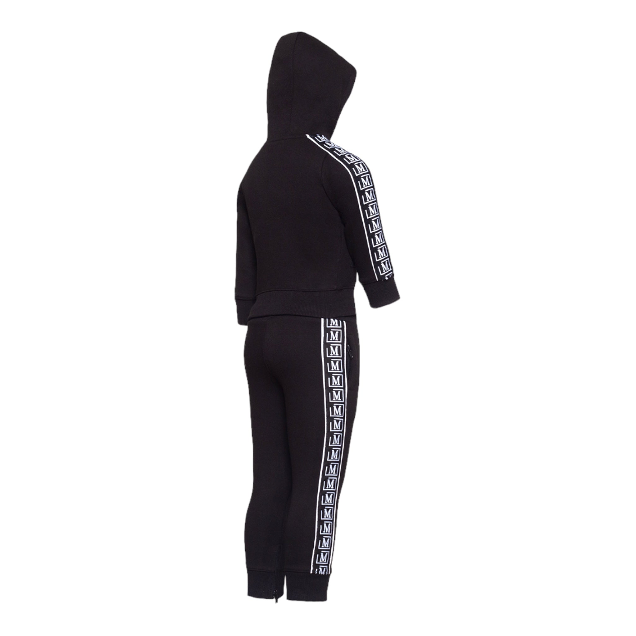 Zip-up hoodie with zipped pockets and ribbed hem and cuff. Logo tape along sleeves and all over M logo print lining in hoodie. Drawstring sweats with embroidered logo on left upper thigh and logo tape on sides. Zipped and ribbed hem.