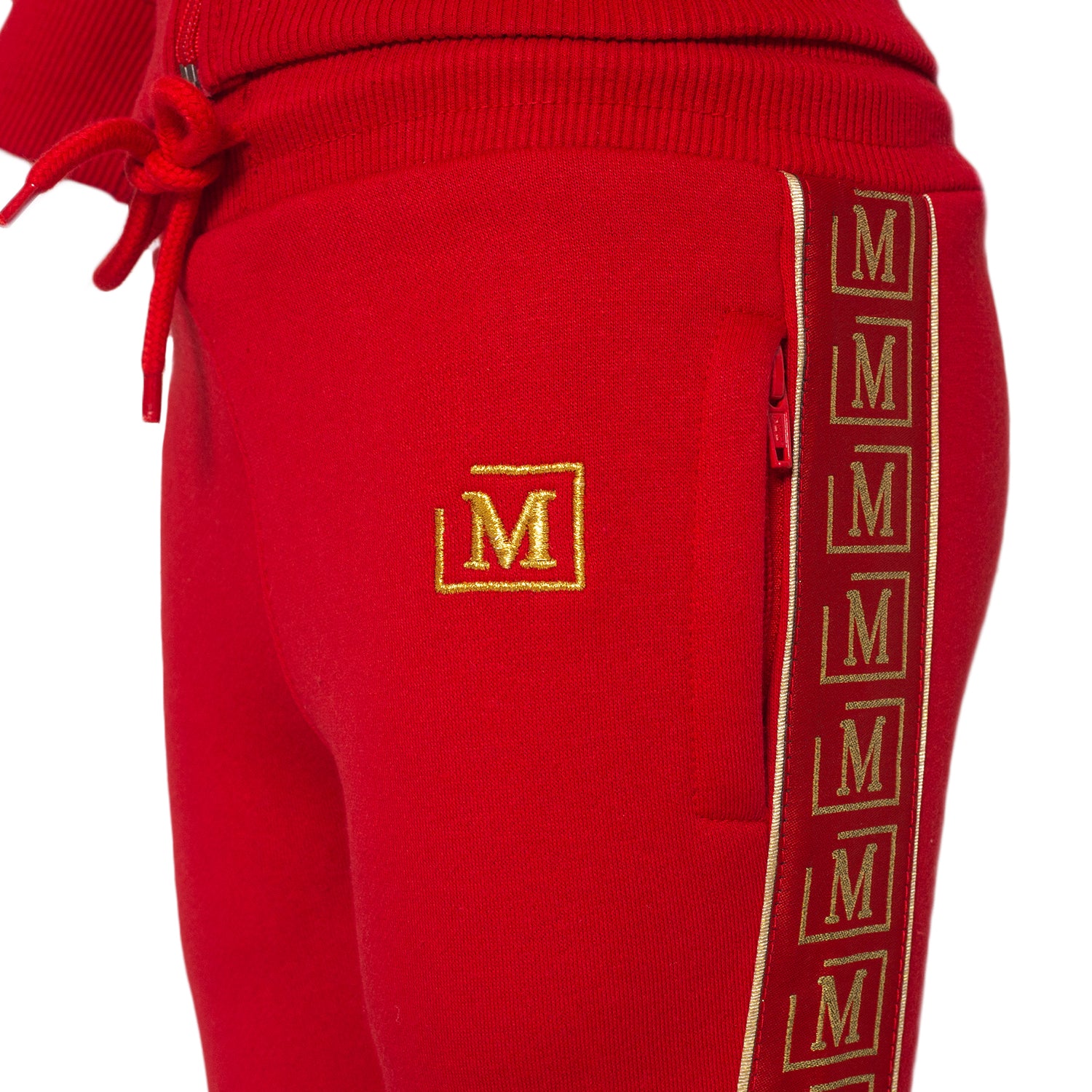 Zip-up hoodie with zipped pockets and ribbed hem and cuff. Logo tape along sleeves and all over M logo print lining in hoodie. Drawstring sweats with embroidered logo on left upper thigh and logo tape on sides. Zipped and ribbed hem.