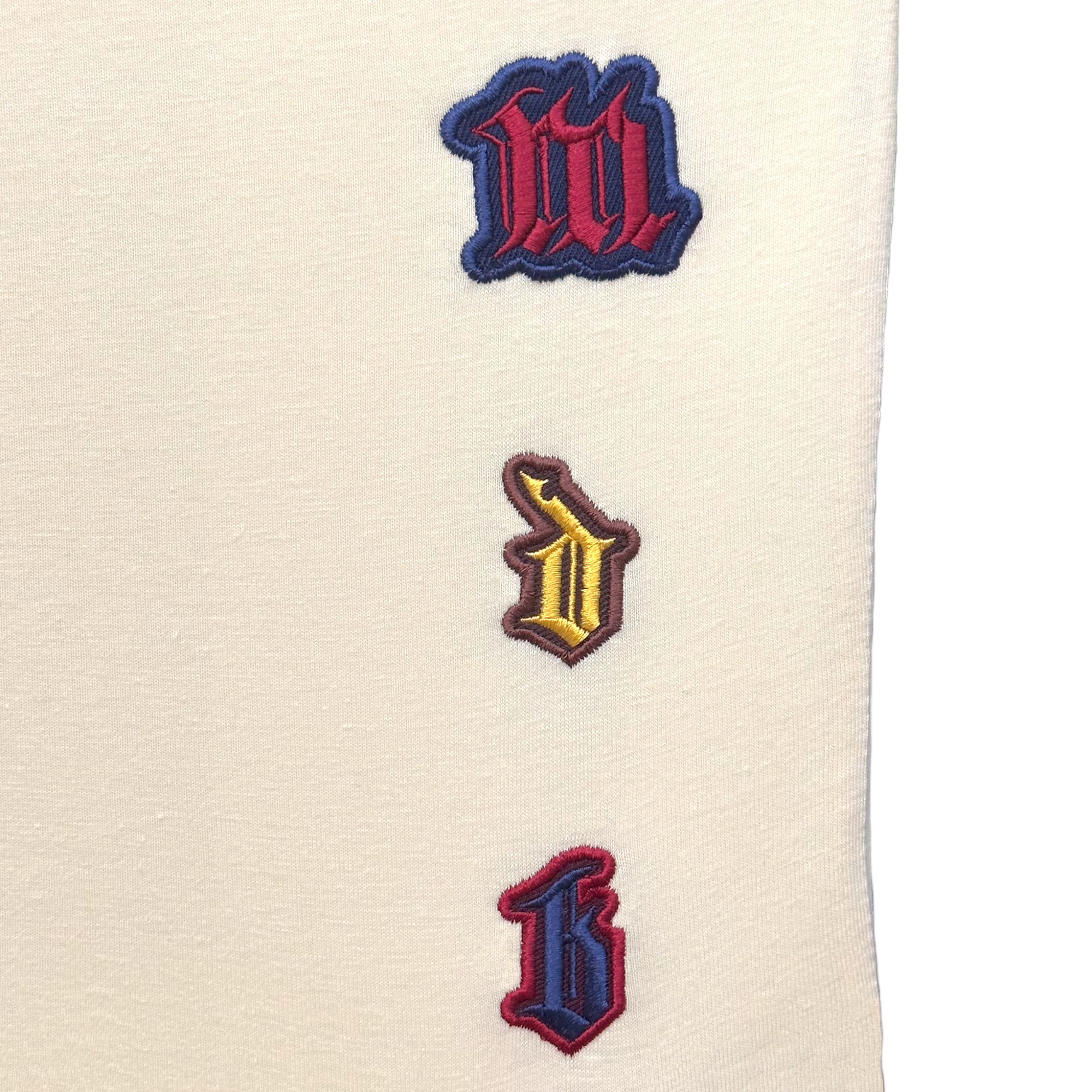 'M, D, B' embroidered on back