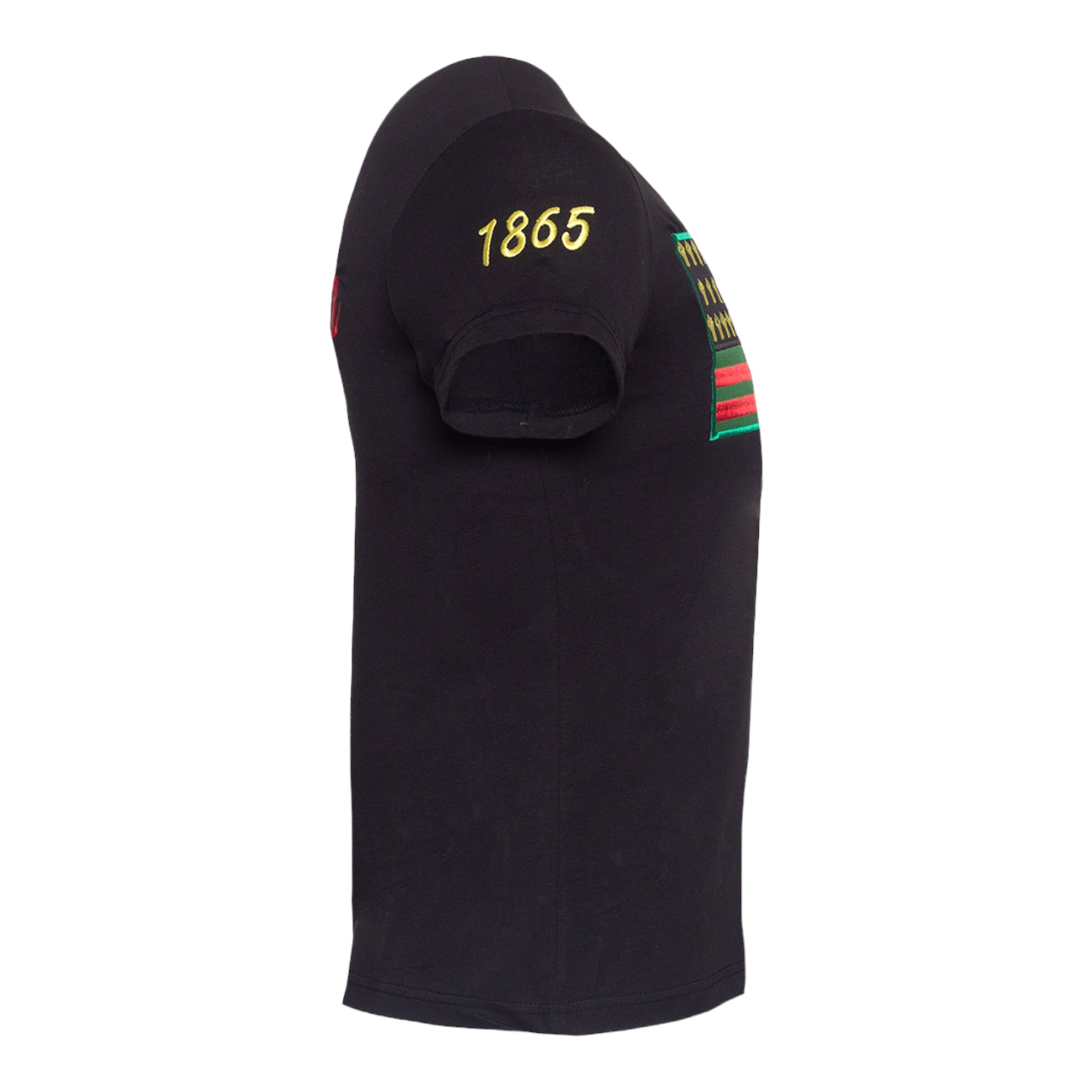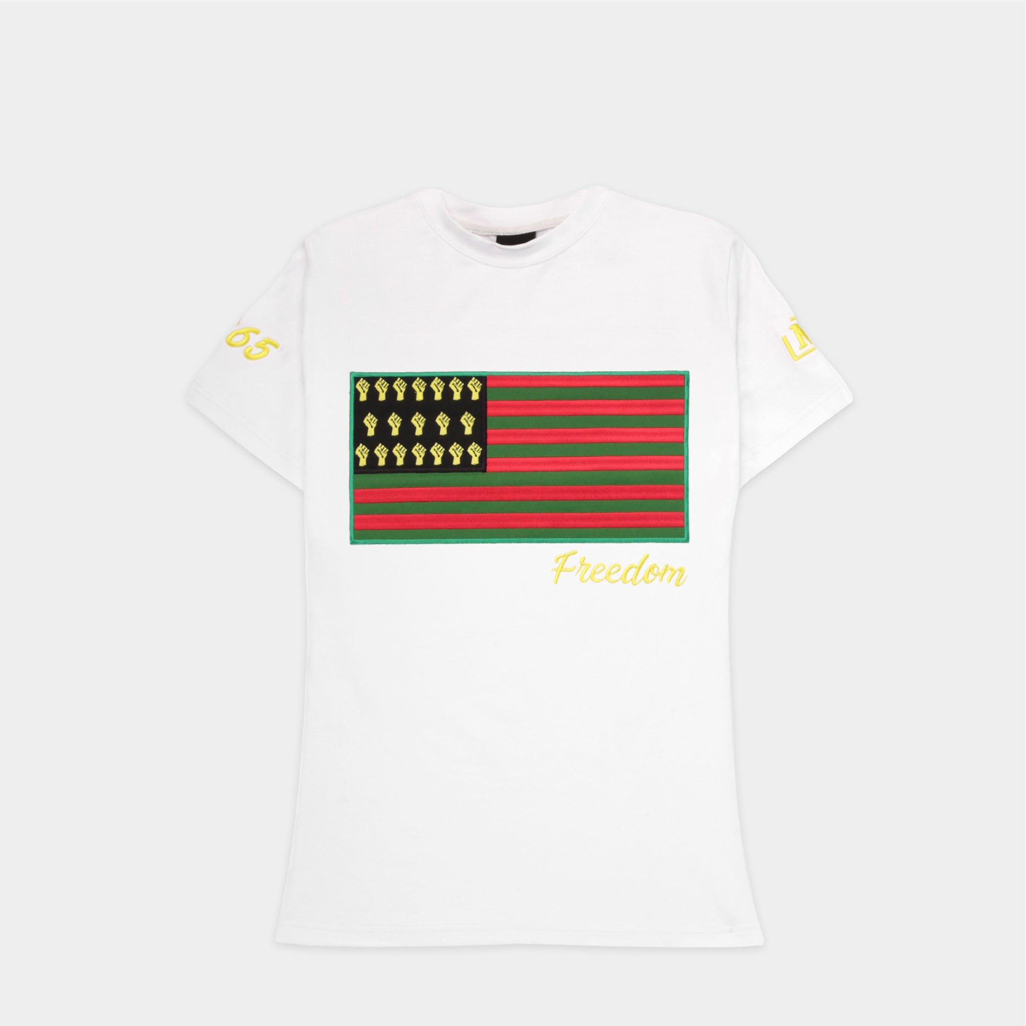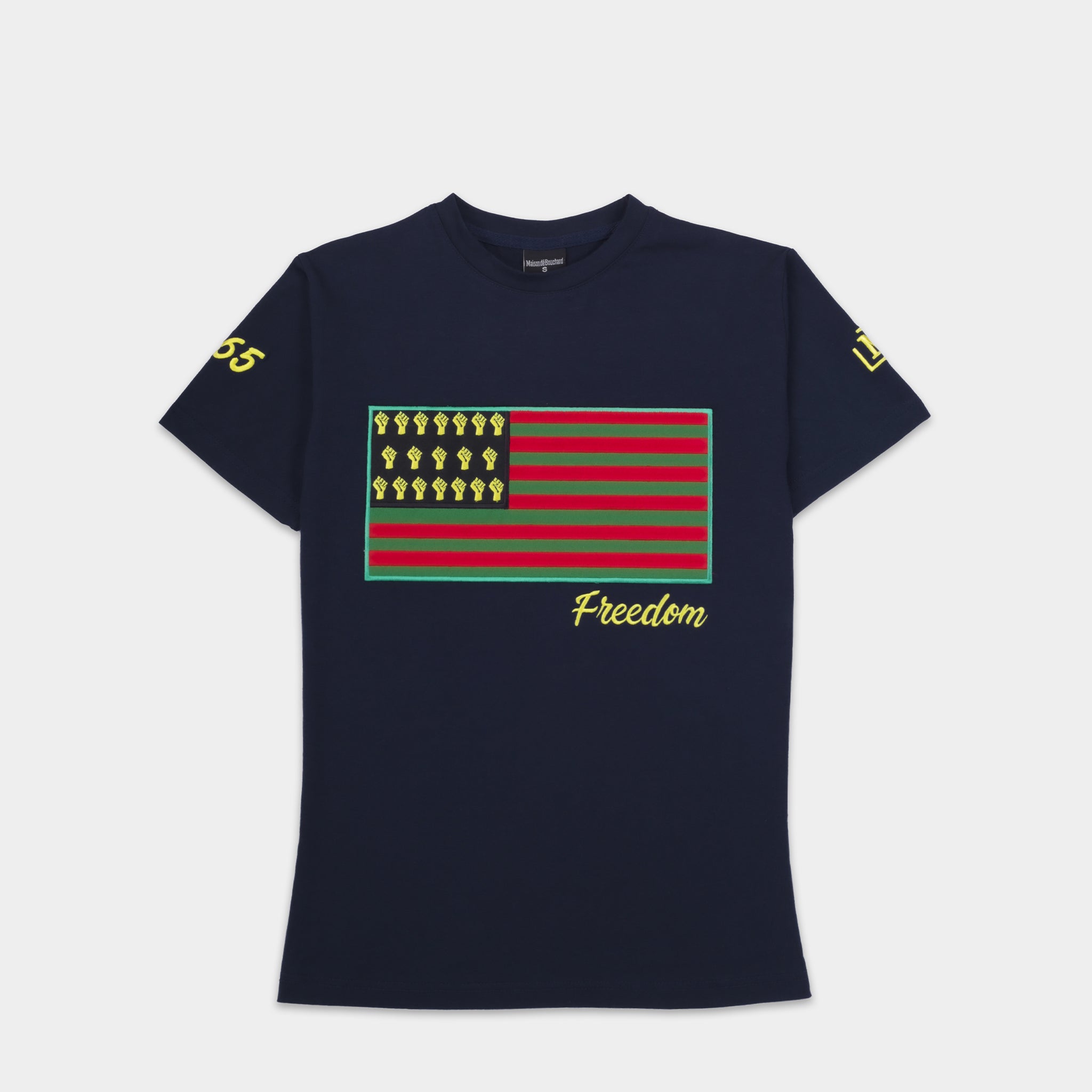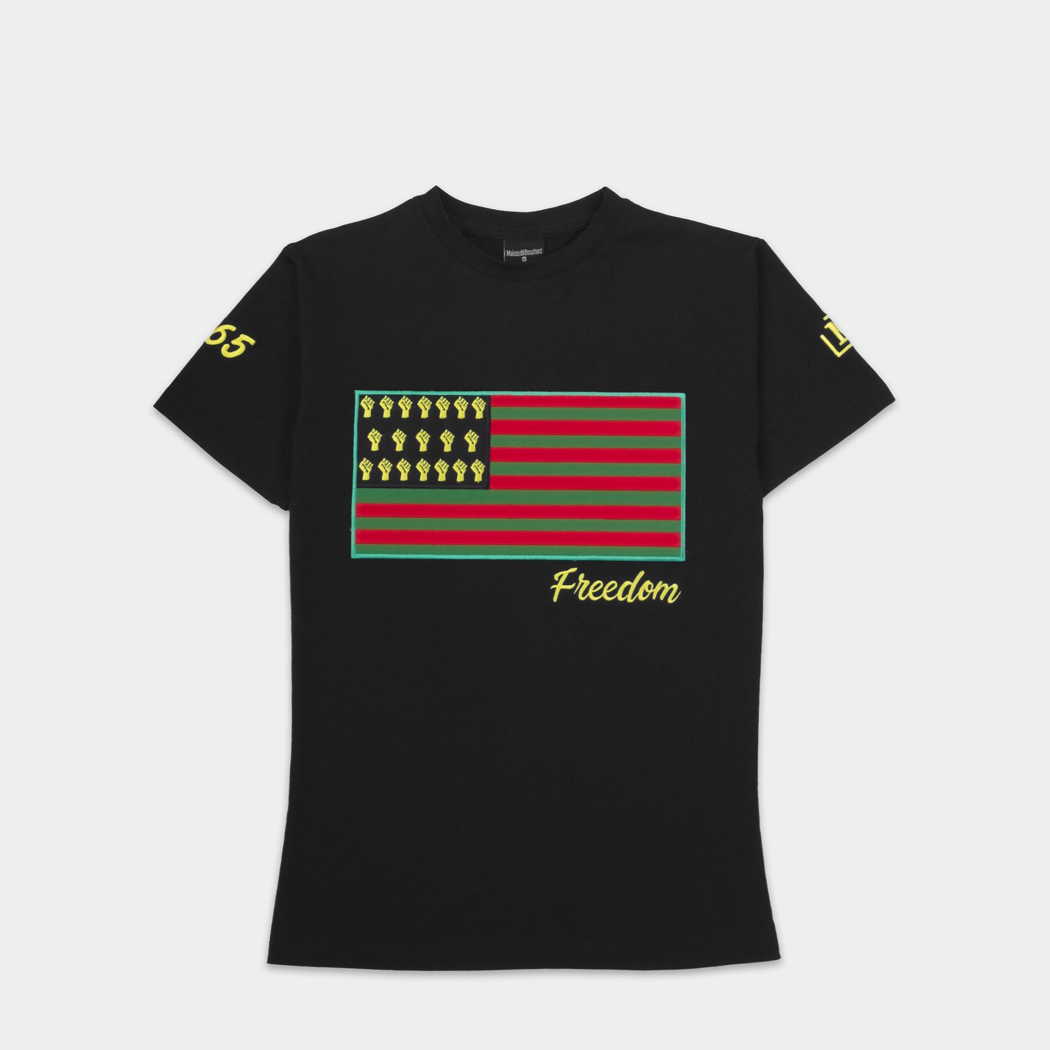 On June 19th, 1865 the last slaves in the state of Texas were declared free. This unique T-Shirt pays homage to the historic and impactful day with imagery inspired by its significance. This tribute features an embroidered flag with nineteen gold fists and six red and green stripes. Freedom is emboldy embroidered on the bottom and back.