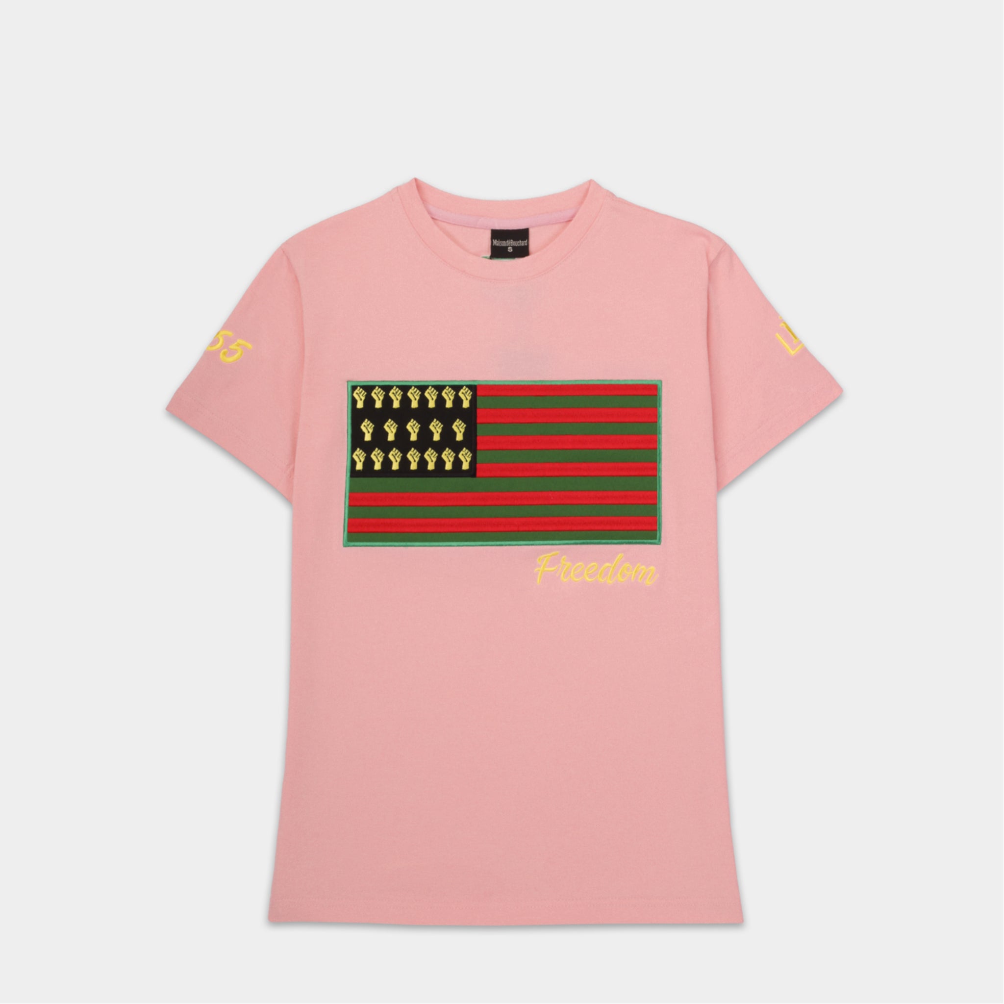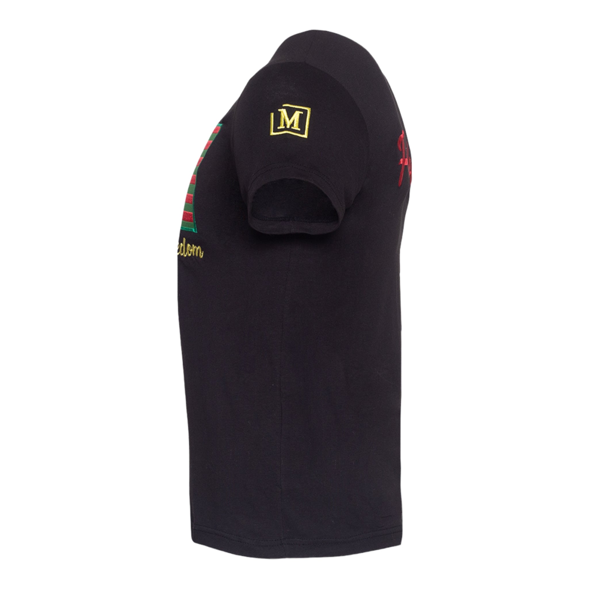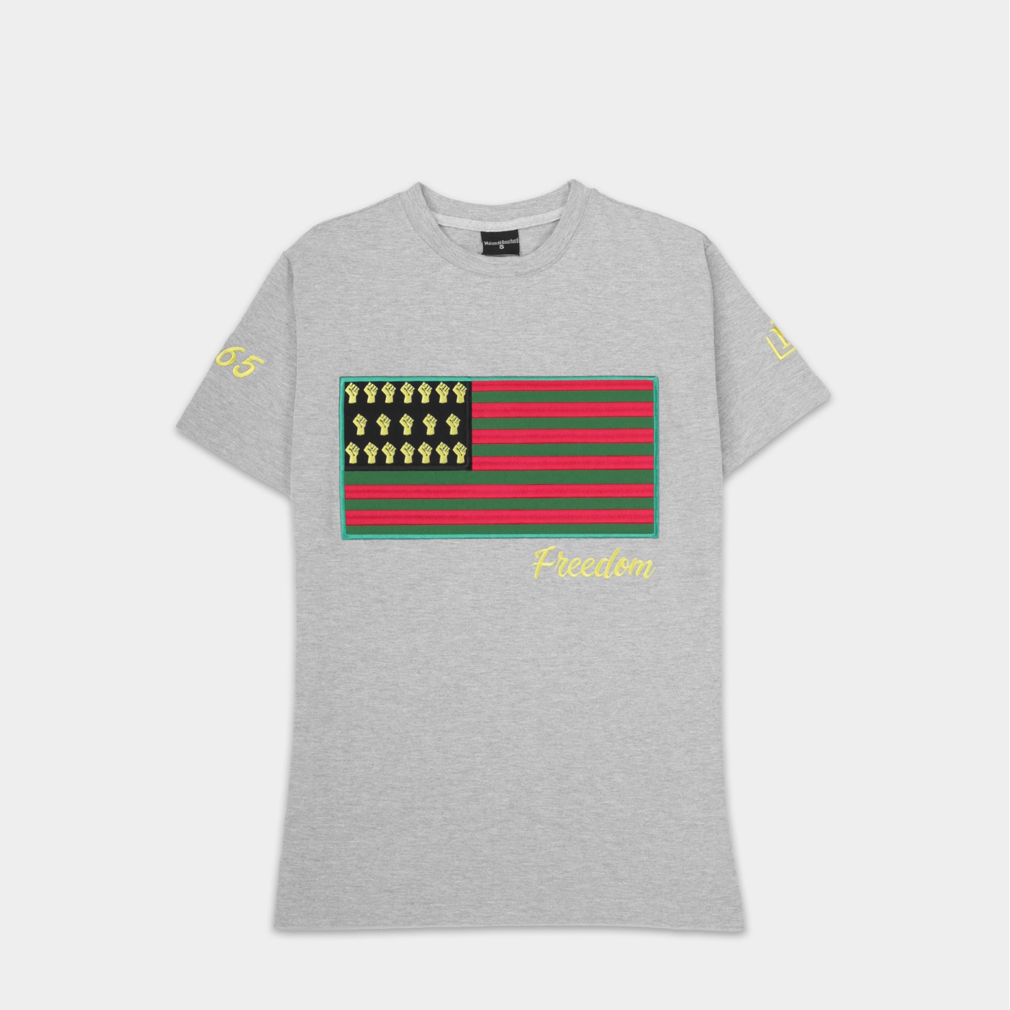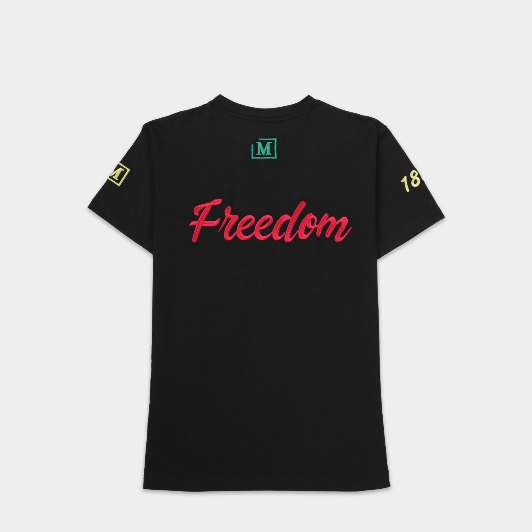 On June 19th, 1865 the last slaves in the state of Texas were declared free. This unique T-Shirt pays homage to the historic and impactful day with imagery inspired by its significance. This tribute features an embroidered flag with nineteen gold fists and six red and green stripes. Freedom is emboldy embroidered on the bottom and back.