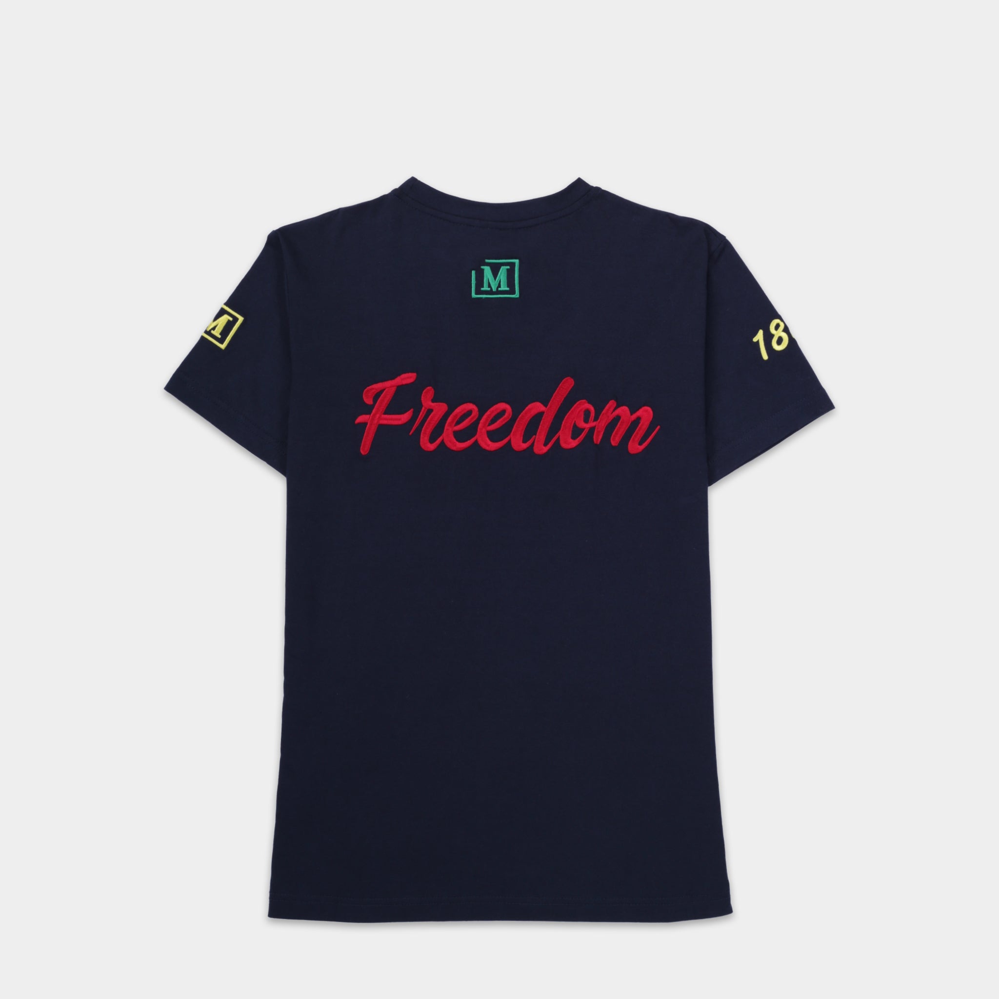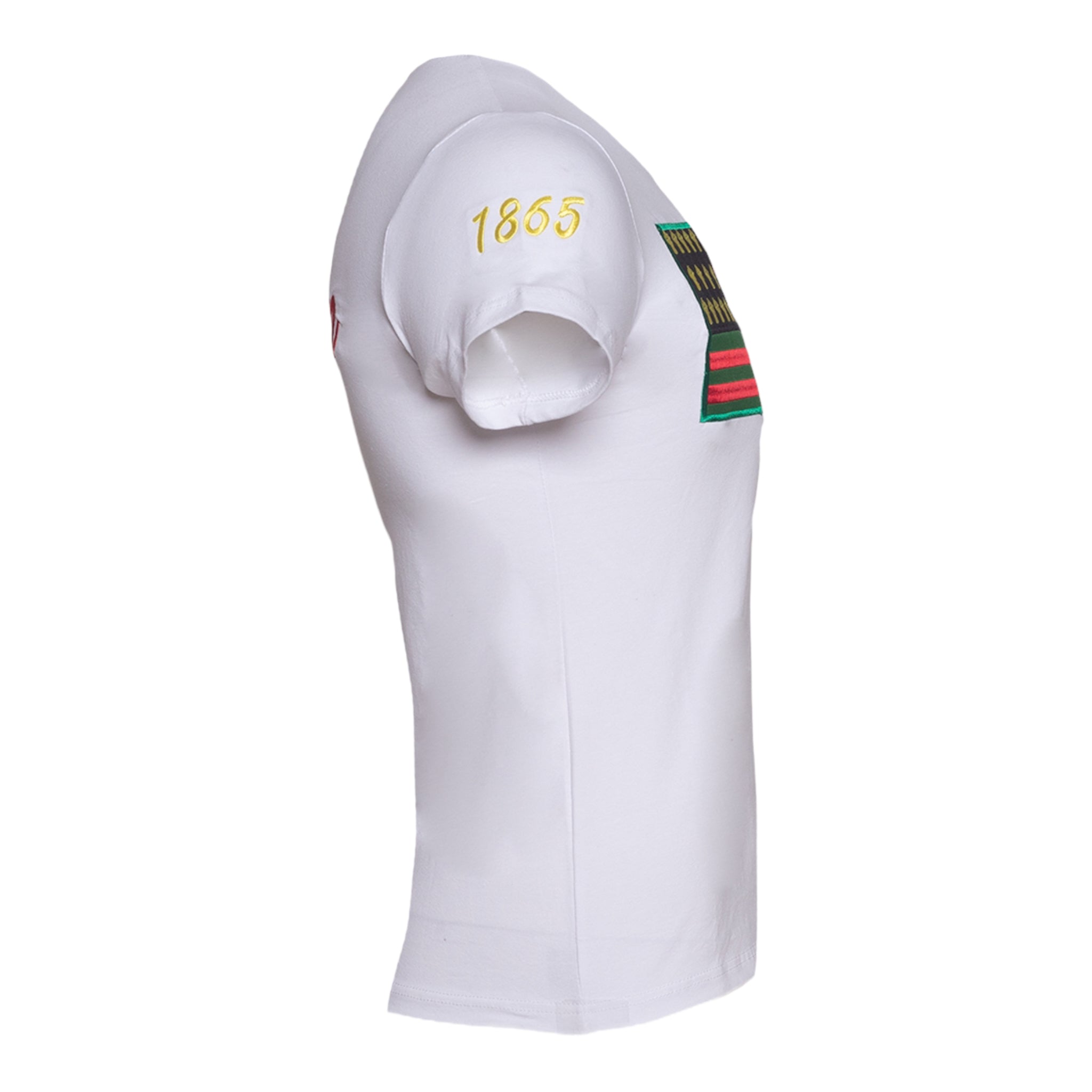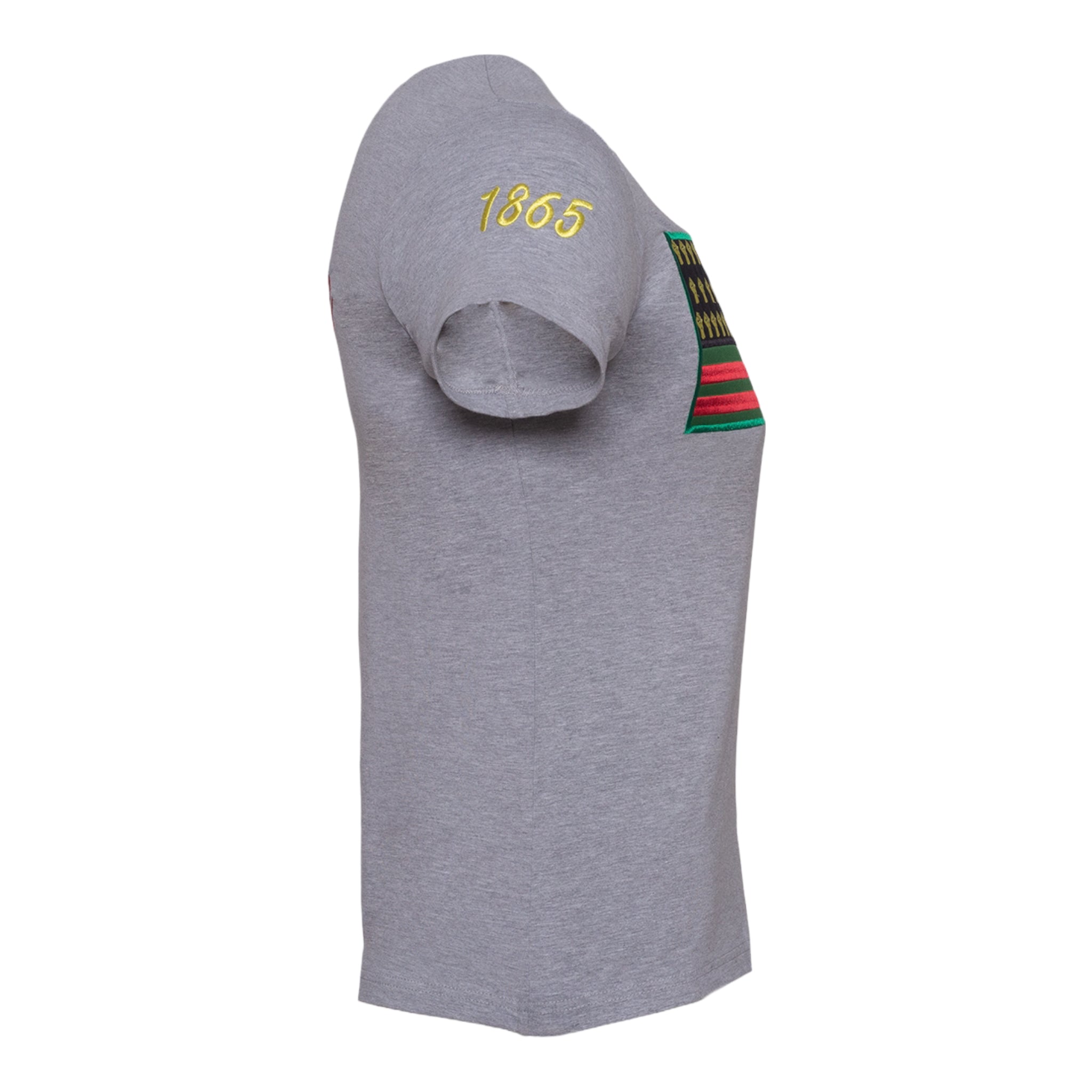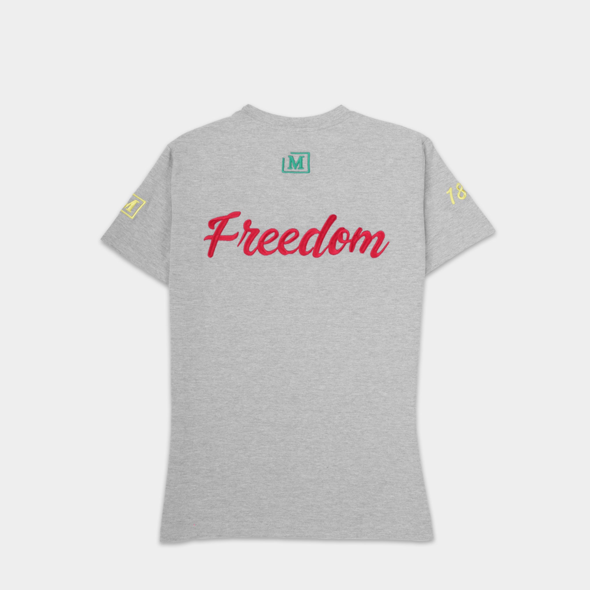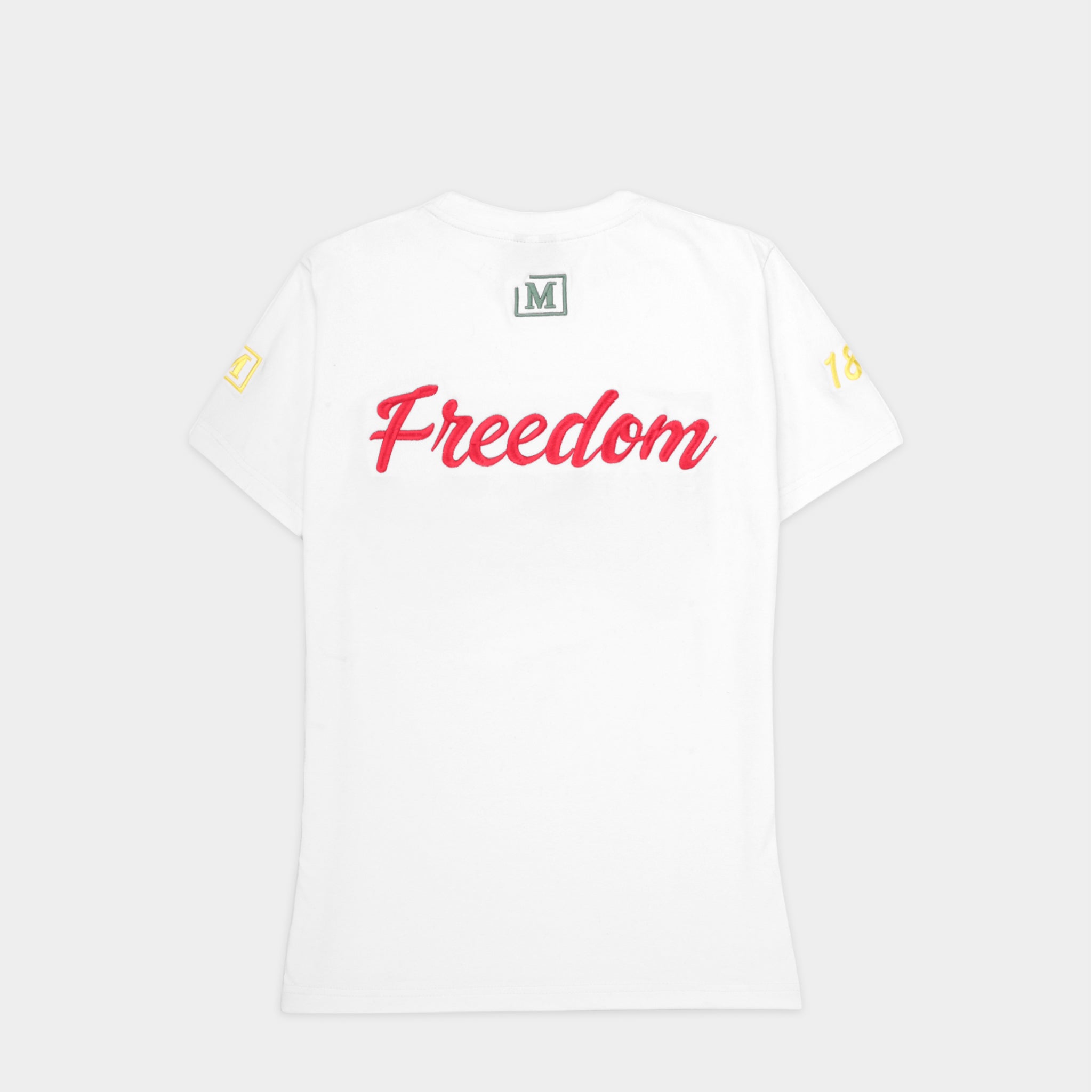On June 19th, 1865 the last slaves in the state of Texas were declared free. This unique T-Shirt pays homage to the historic and impactful day with imagery inspired by its significance. This tribute features an embroidered flag with nineteen gold fists and six red and green stripes. Freedom is emboldy embroidered on the bottom and back.