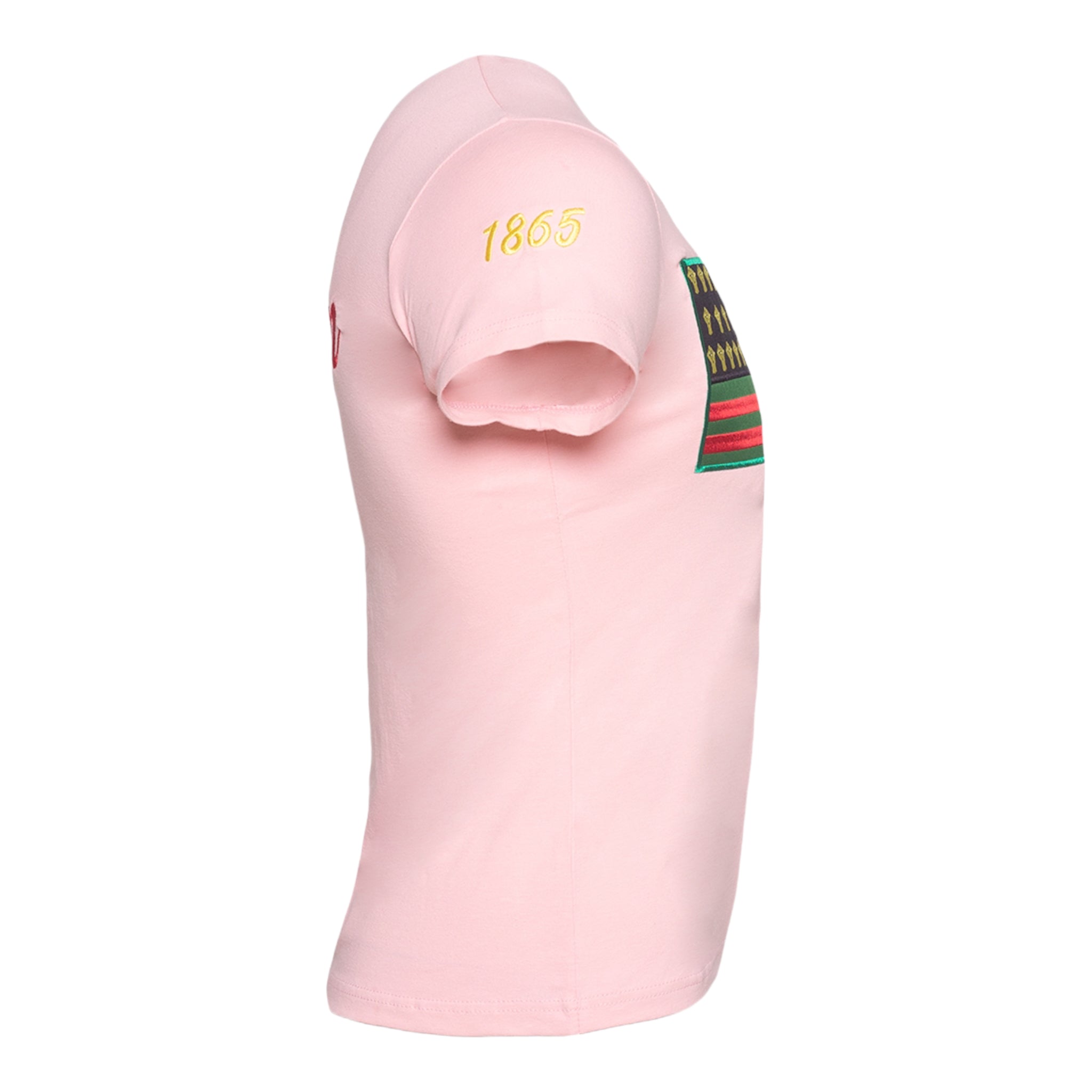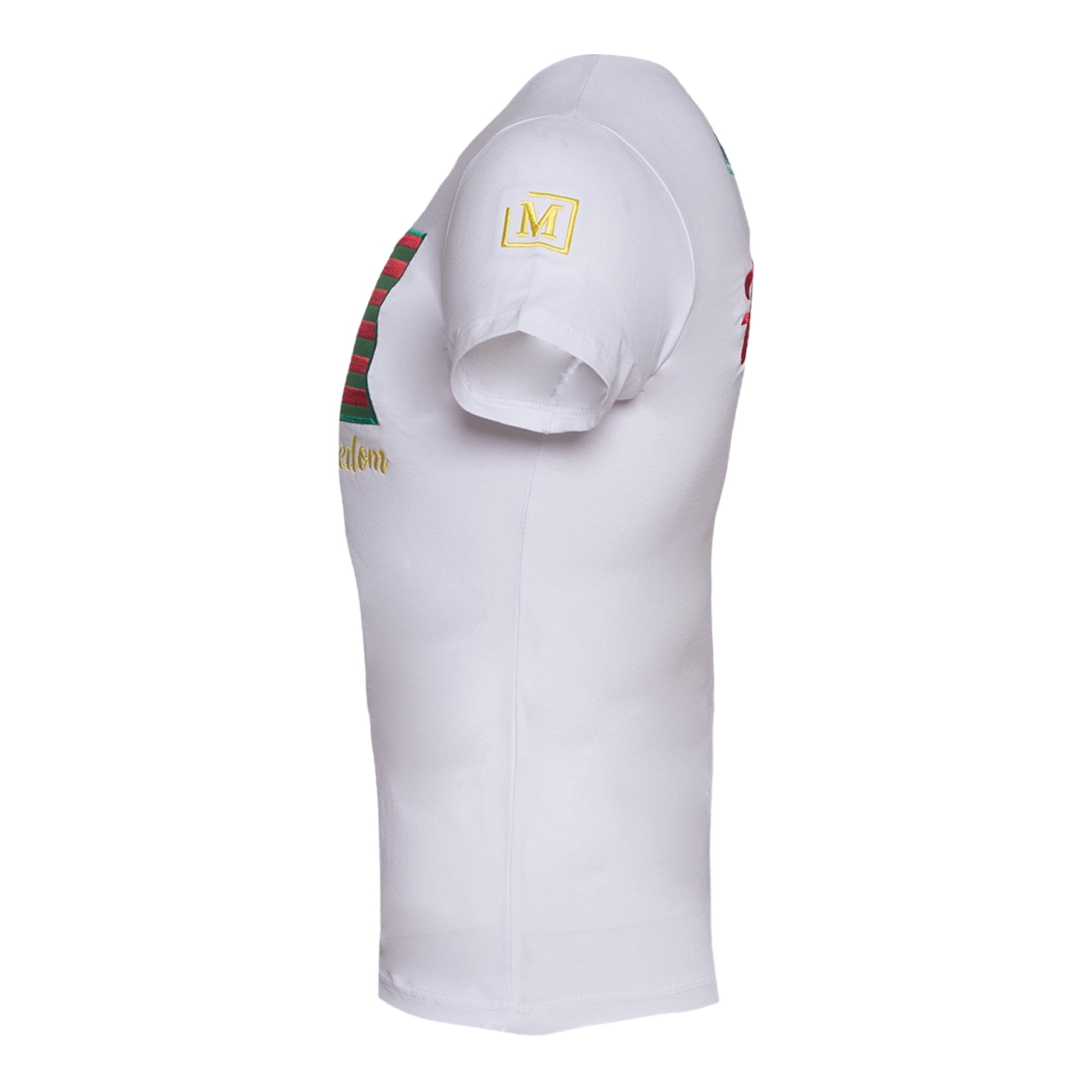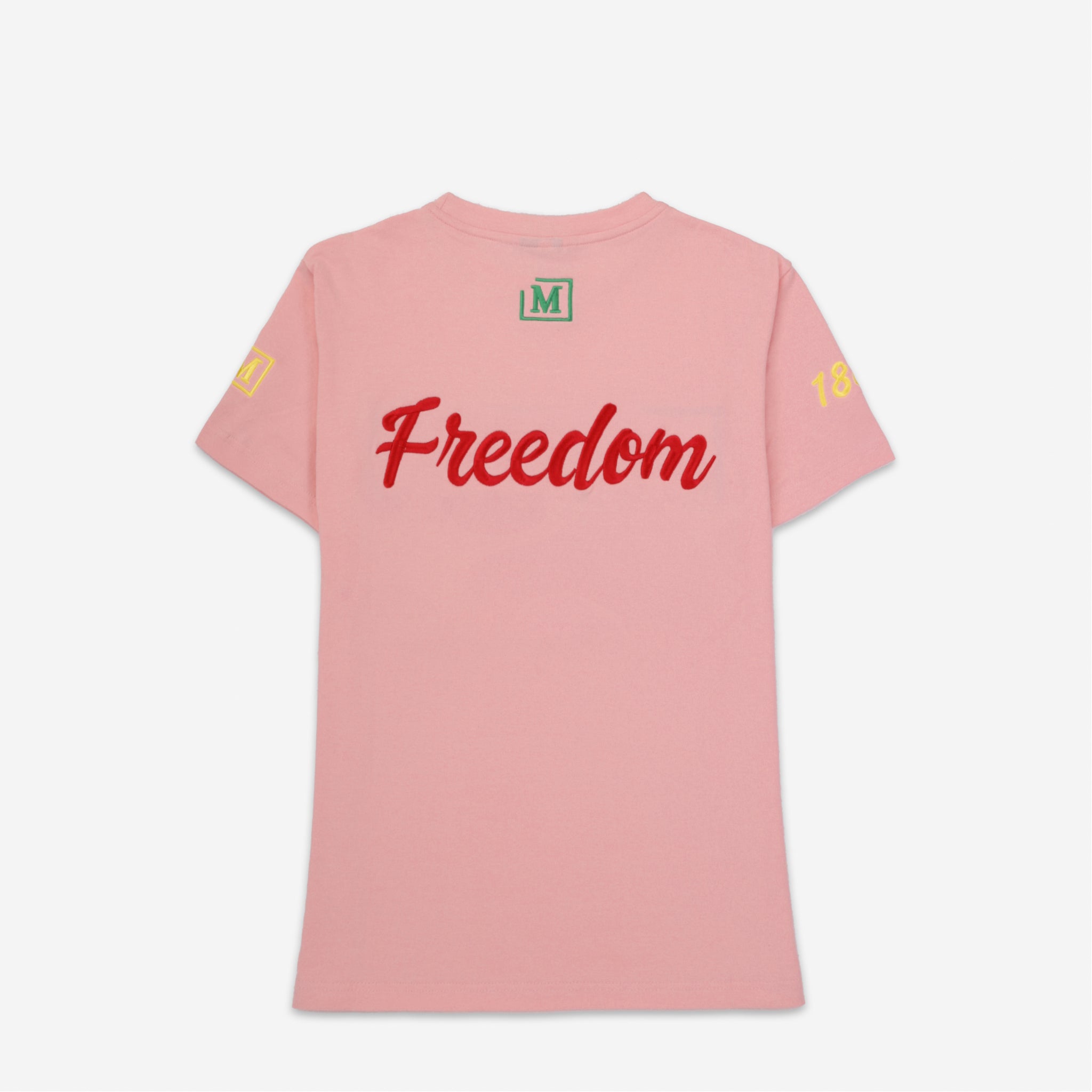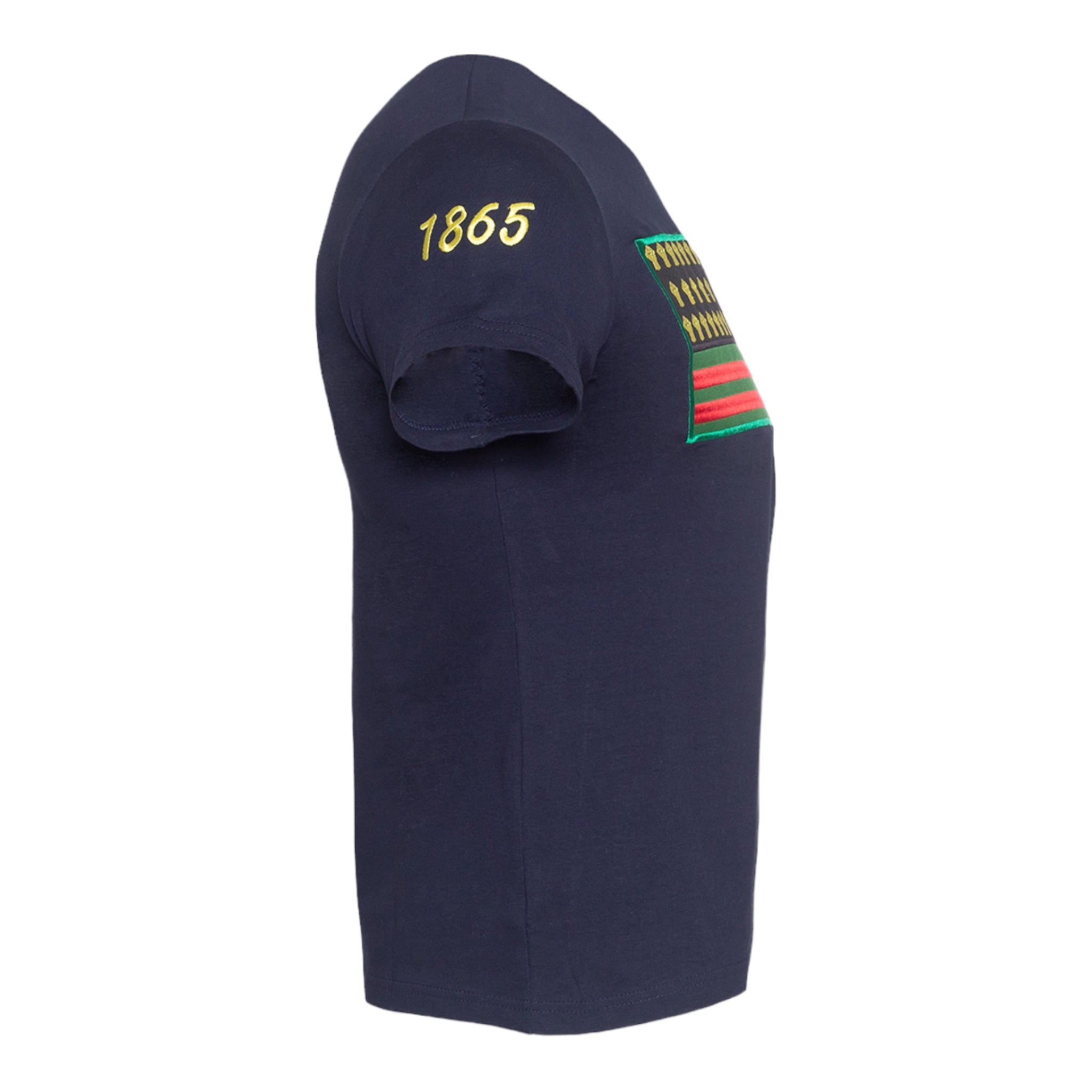 On June 19th, 1865 the last slaves in the state of Texas were declared free. This unique T-Shirt pays homage to the historic and impactful day with imagery inspired by its significance. This tribute features an embroidered flag with nineteen gold fists and six red and green stripes. Freedom is emboldy embroidered on the bottom and back.