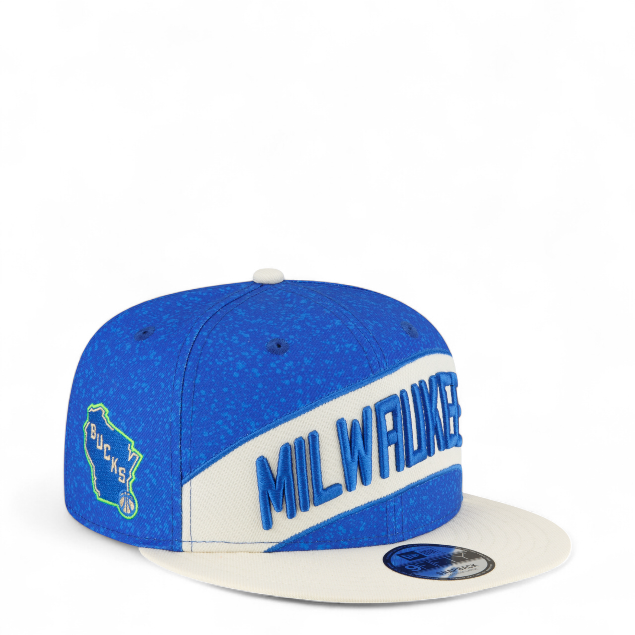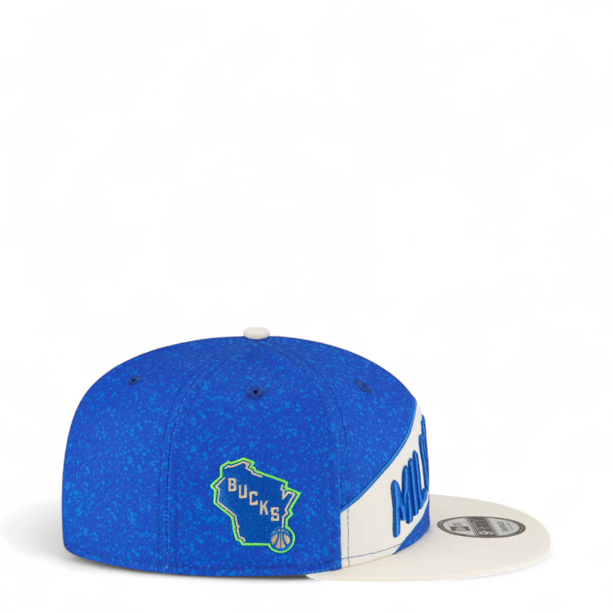 The Milwaukee Bucks City Edition 9FIFTY Snapback features an embroidered Bucks wordmark at the front panels with an official NBA Logoman at the rear. Additional details include a team logo at the right-wear side, a green undervisor, and a snapback closure at the rear.
