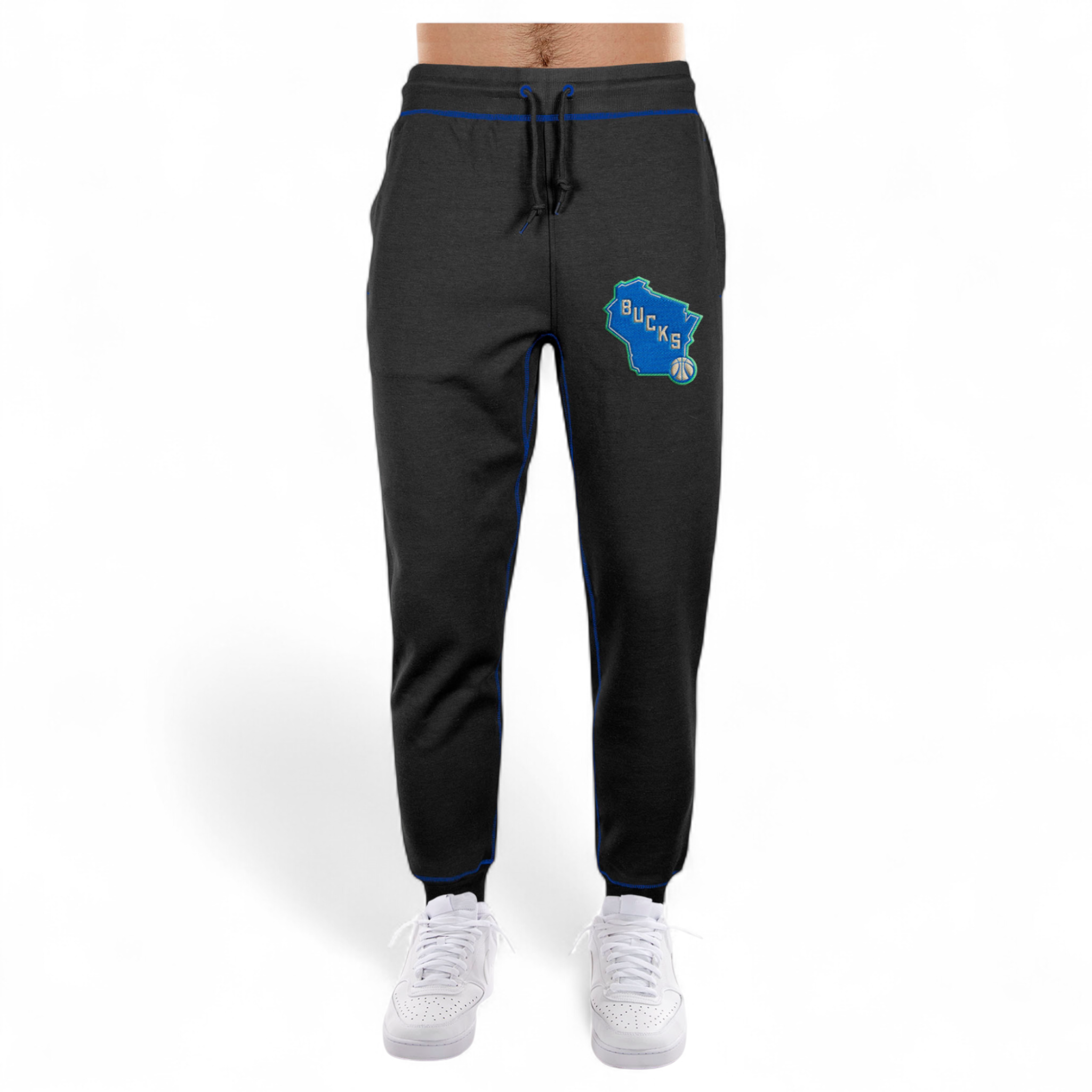 The Milwaukee Bucks City Edition Black Jogger features an embroidered Bucks logo at the left leg and a team jock tag at the rear.