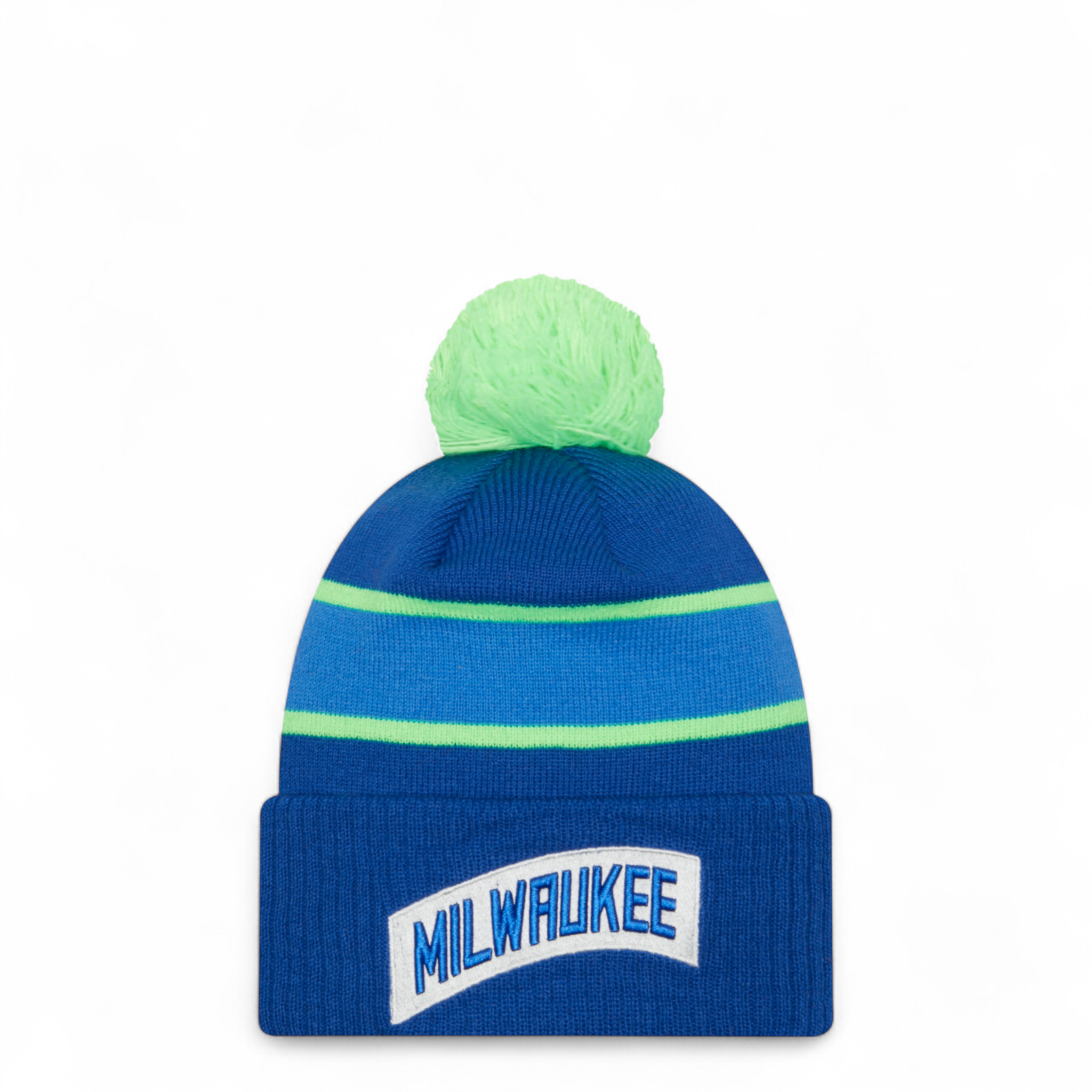 The Milwaukee Bucks City Edition Pom Knit features an embroidered Milwaukee wordmark at the front with an official NBA Logoman at the rear, contrast color racing stripe and a one-time removable pom.