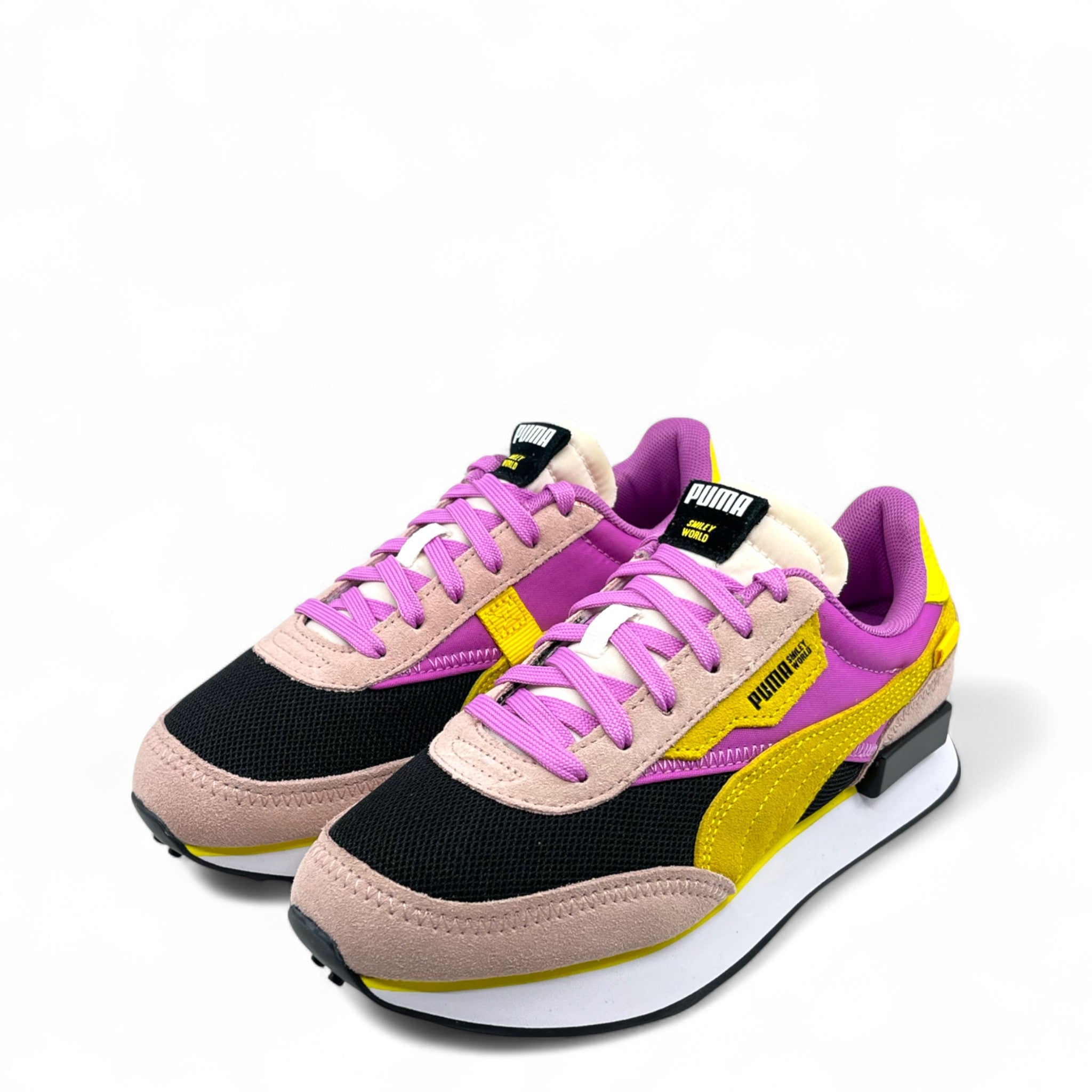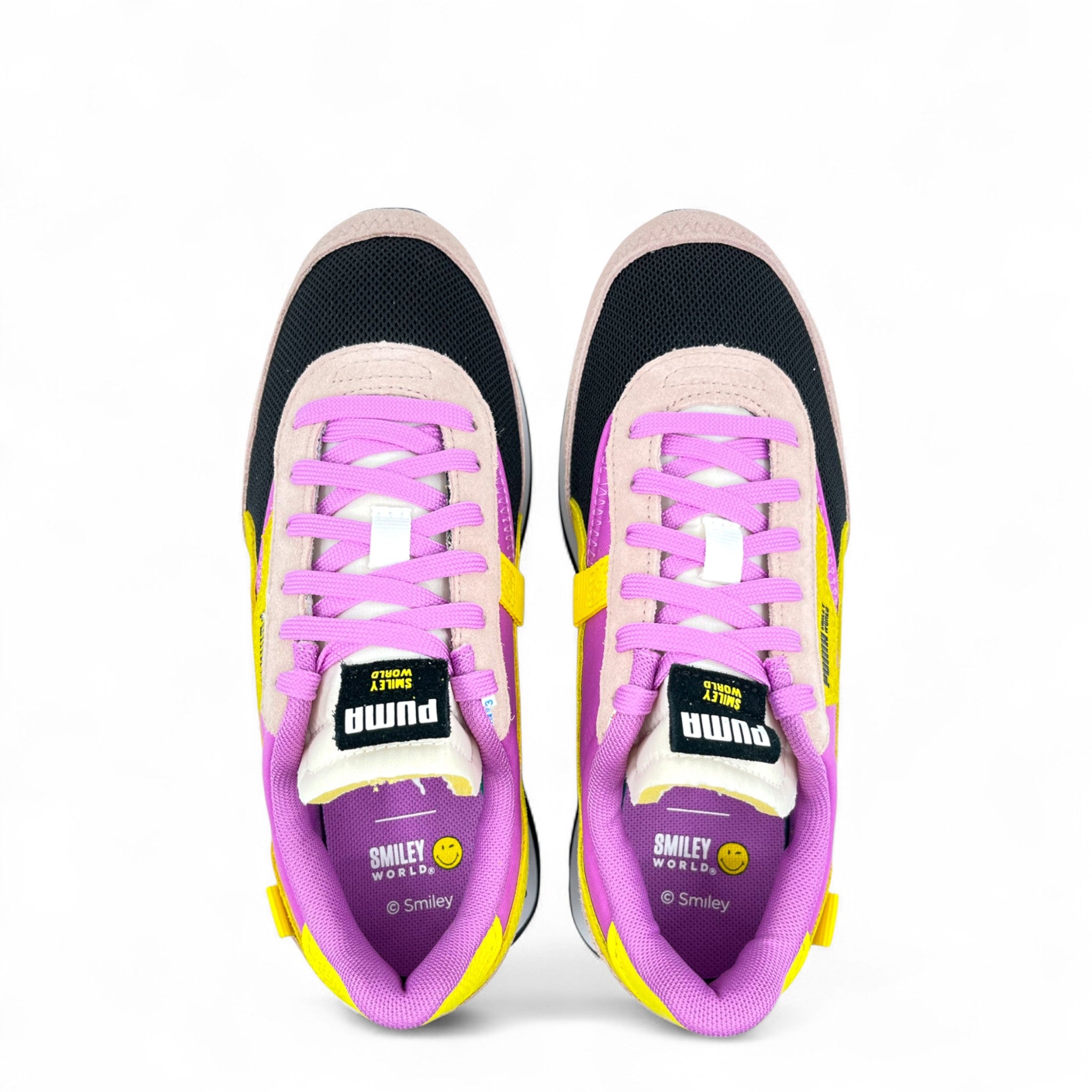 The iconic image of counter-culture for nearly five decades, Smiley is now collaborating with PUMA to bring you trendsetters. The PUMA x SMILEY WORLD Future Rider Kids' Sneakers is a combination of PUMA's technology and Smiley World's vibe. It comes with a slimmed-down, shock-absorbing Federbein outsole and super-comfortable Rider Foam midsole, elevated by the Smiley World's fun prints.