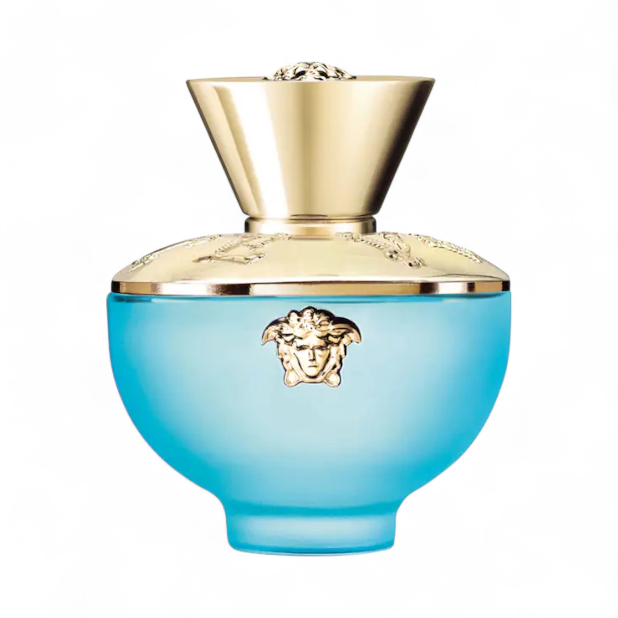 The elegantly designed bottle reflects the essence of the fragrance—modern, refined, and feminine. With its soft turquoise hue and classic gold accents, it embodies the spirit of Versace's timeless style.