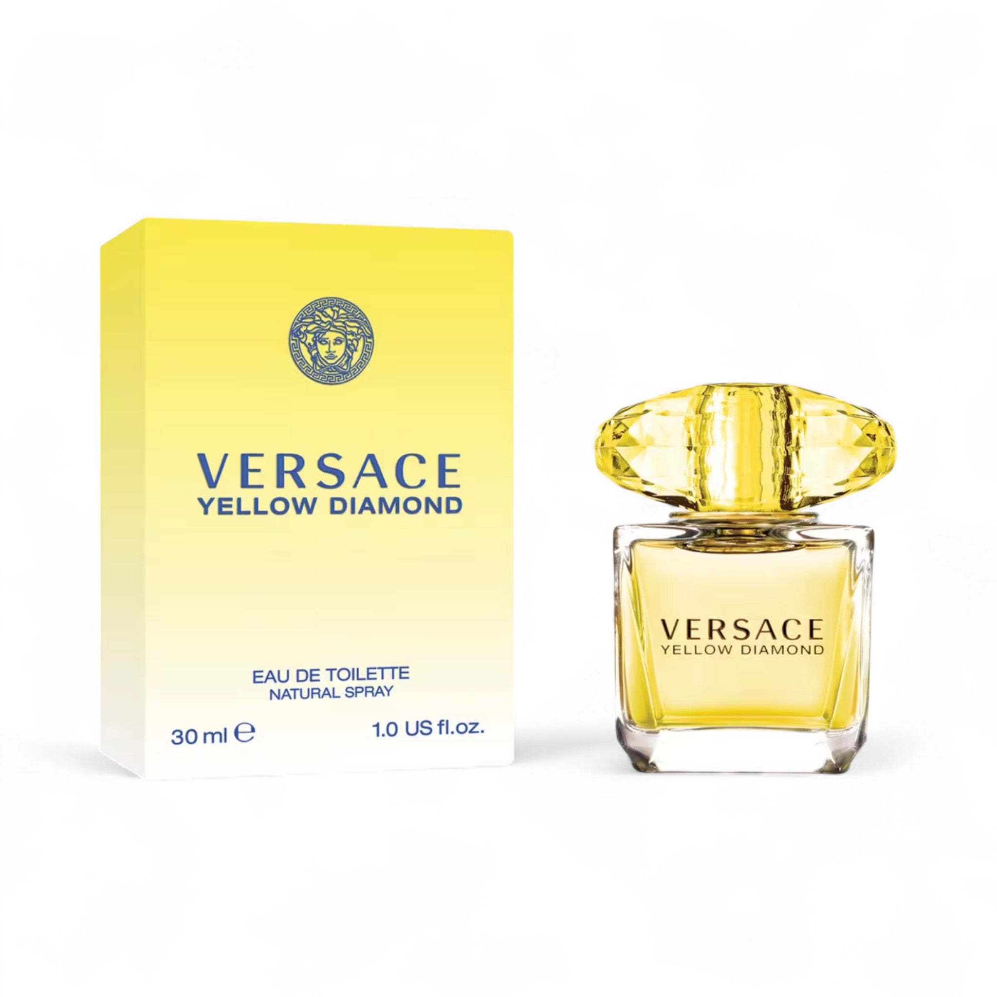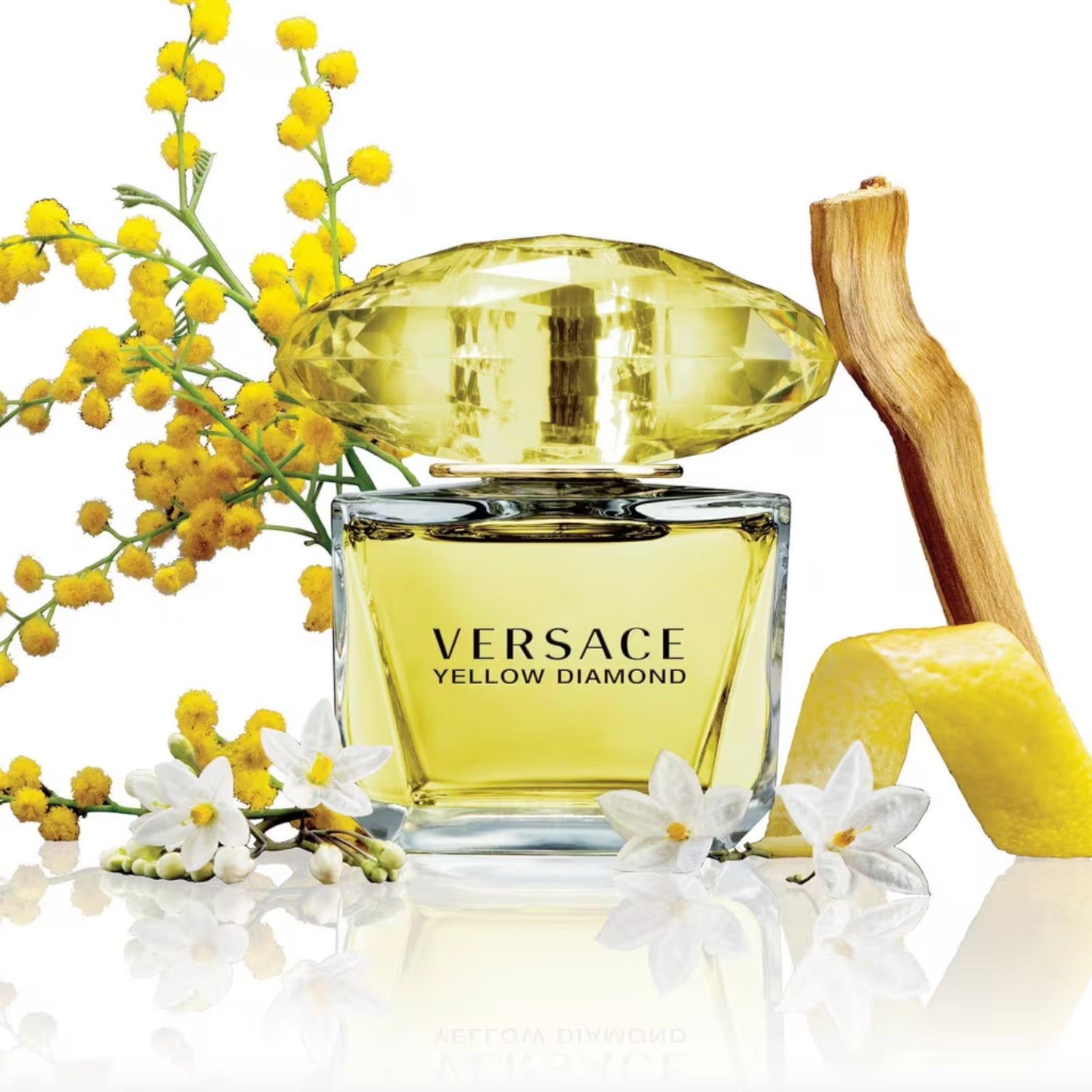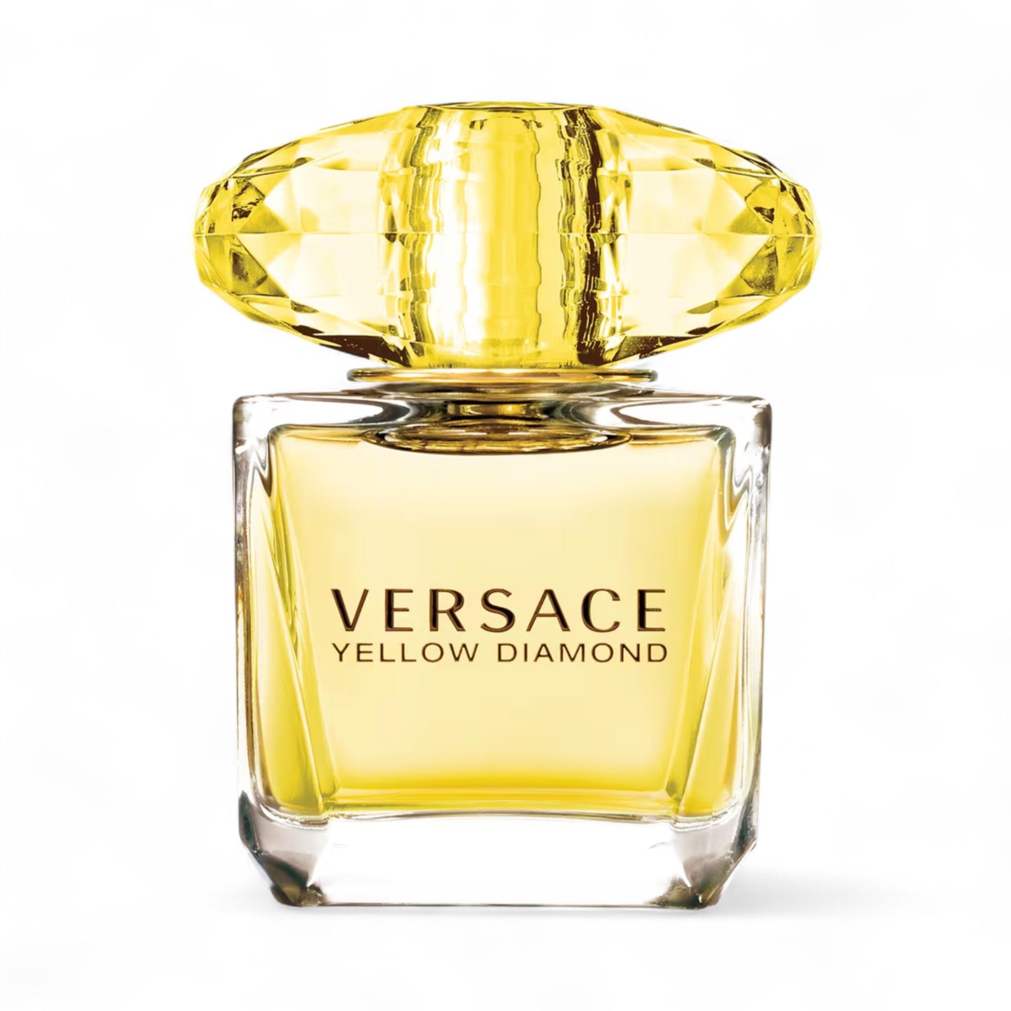 The beautifully designed bottle reflects the essence of the fragrance—elegant, sophisticated, and timeless. With its yellow hue and diamond-like cap, it embodies the spirit of Versace's signature style.