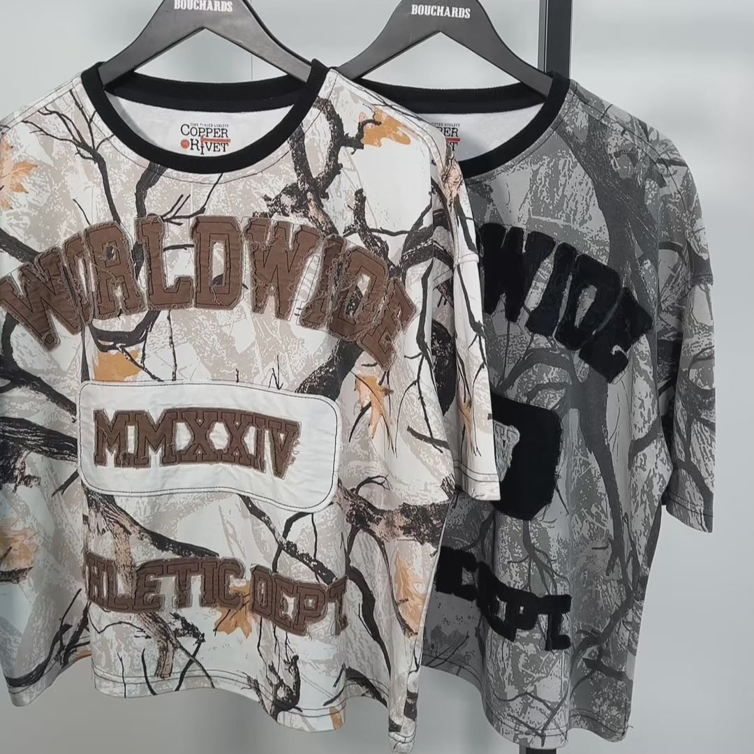 Blend athletic energy with bold streetwear style in the Hidden Treasures Worldwide Athletic Department Crop Tee. This statement piece showcases an all-over graphic print with rugged, textured cut-and-sew patch logos that highlight its varsity-inspired attitude.