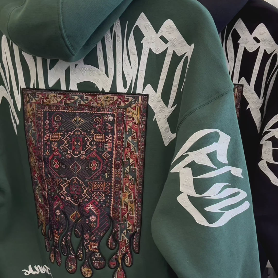 Featuring a range of print styles and embroidery techniques that make up a visually stunning oversized back graphic combined with a small and simple text graphic on the front.