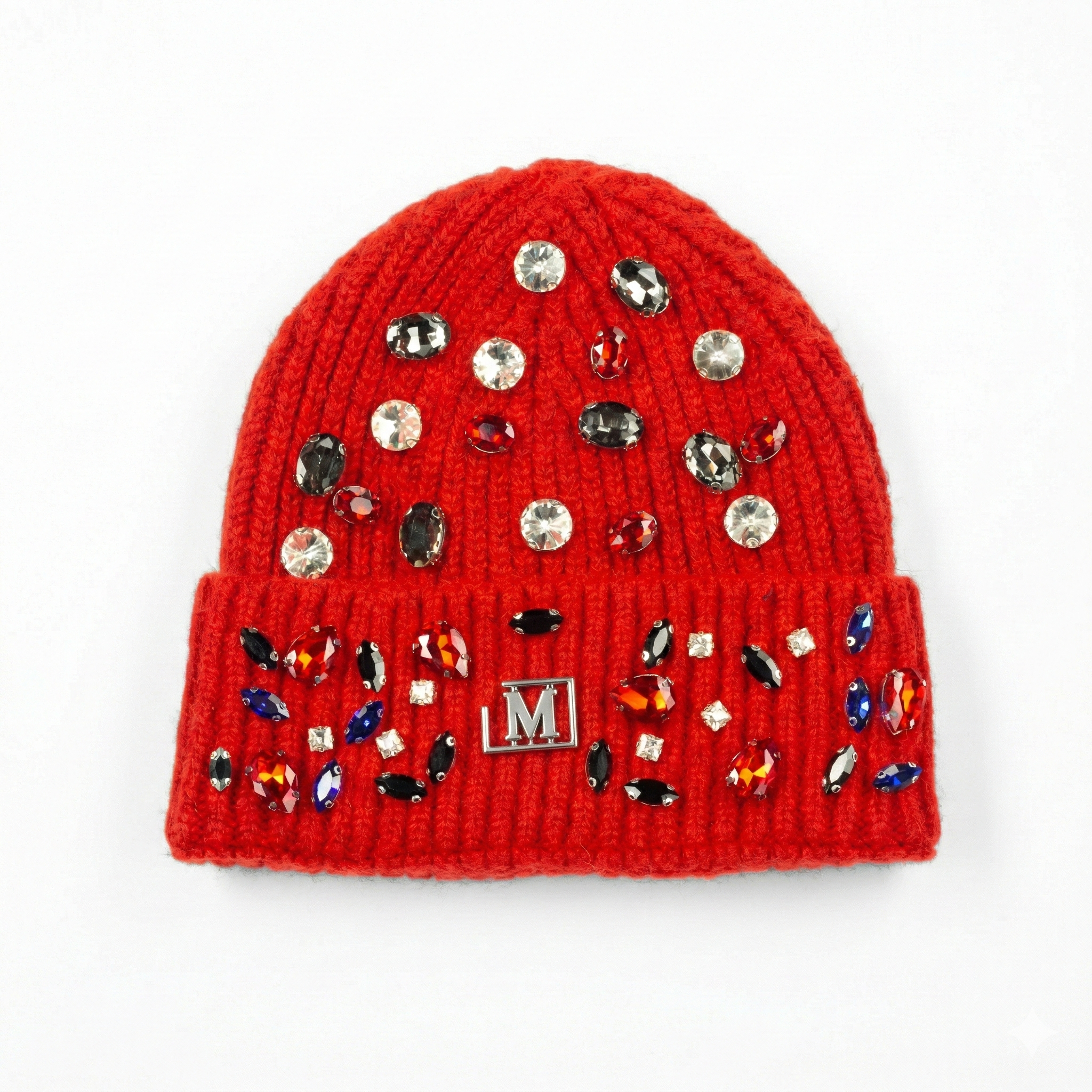 Each beanie is meticulously embellished with 100+ handsewn gemstones, creating a vibrant, luxurious sparkle that sets it apart from ordinary winter wear. The look is completed with the signature metal “M” medallion logo on the front cuff—an iconic symbol of MDB Brand craftsmanship.
