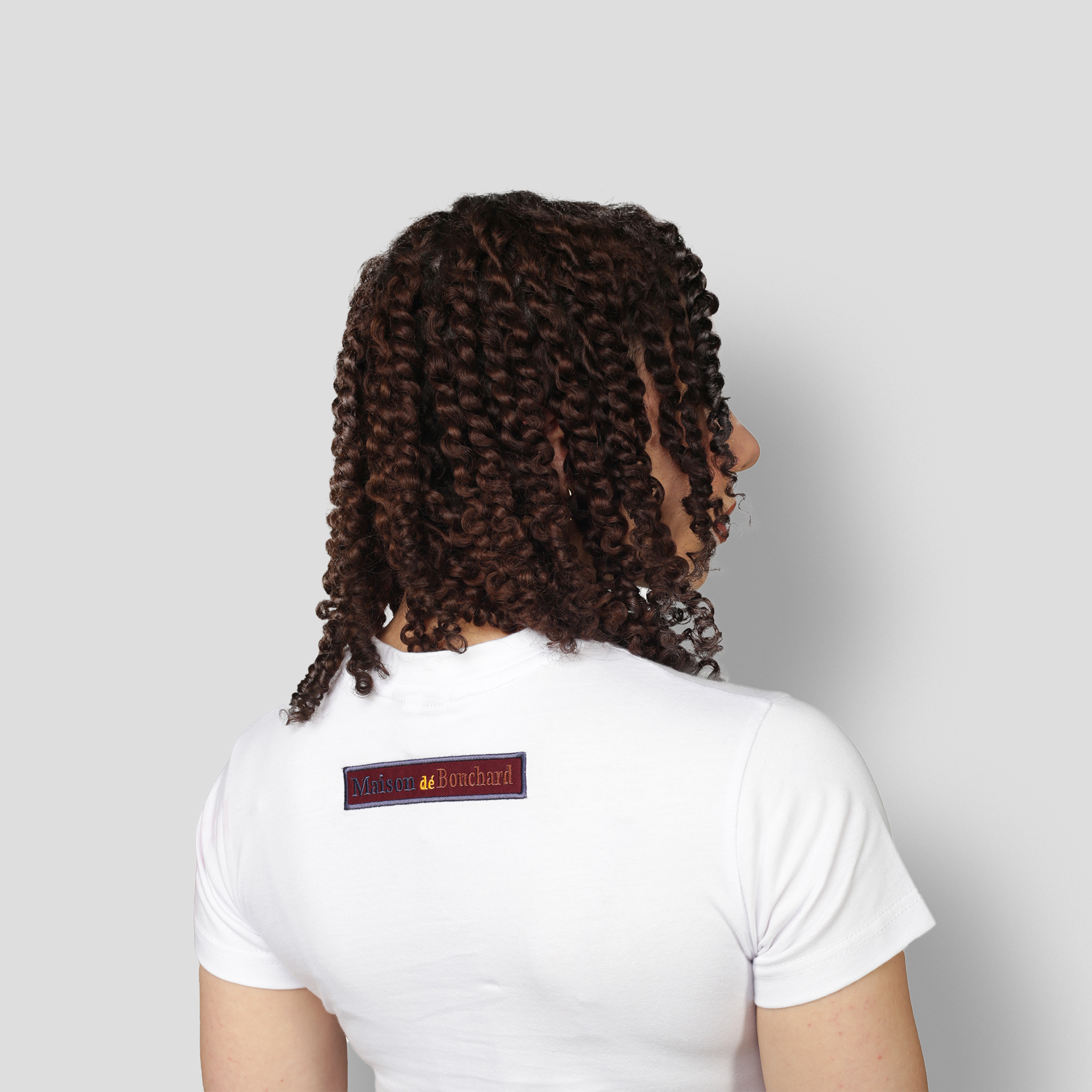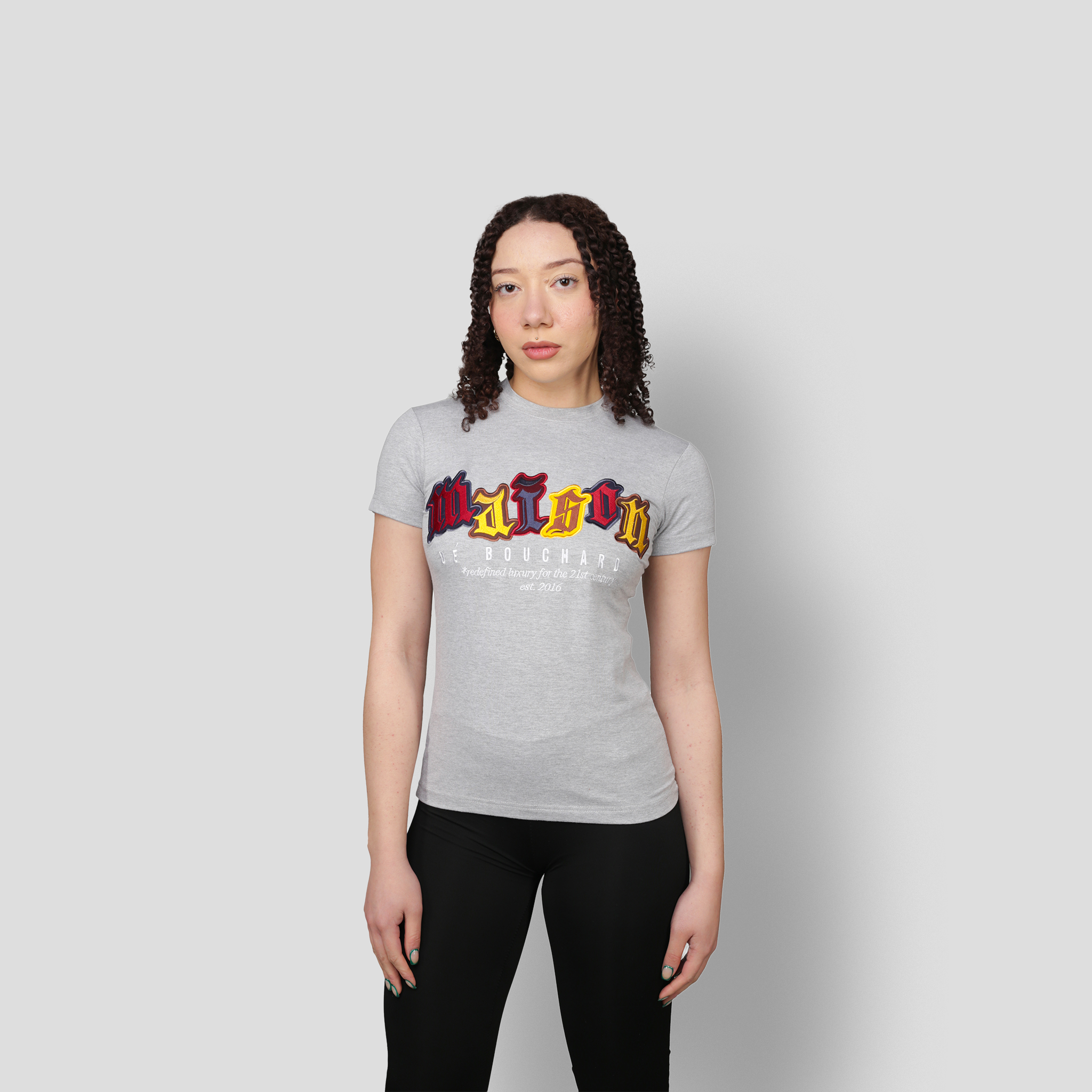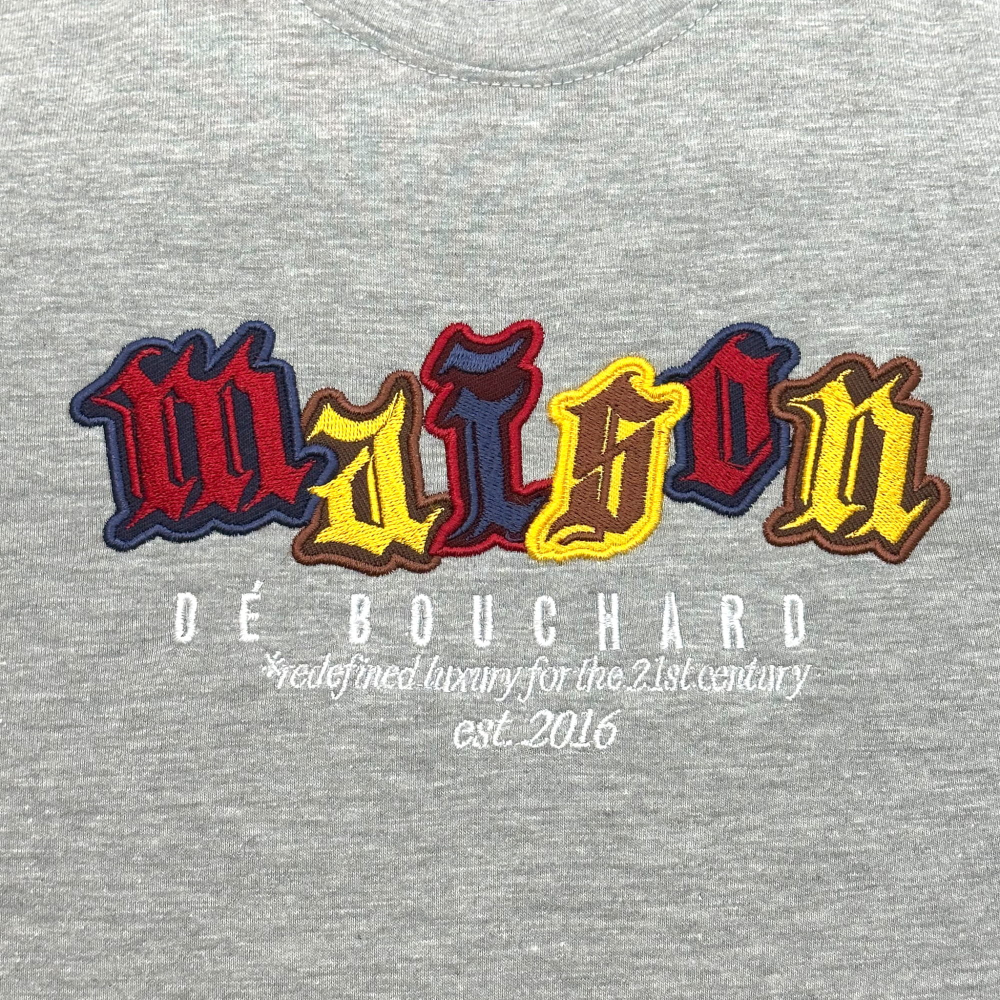The front features a bold multi-color embroidered “Maison” patch logo, delivering standout visual appeal and premium craftsmanship. Complementing the front design, the back includes subtle “M, D, B” embroidery, adding a refined touch from every angle. Finished with straight cuffs and a clean hem, this tee pairs effortlessly with leggings, denim, or layered looks.
