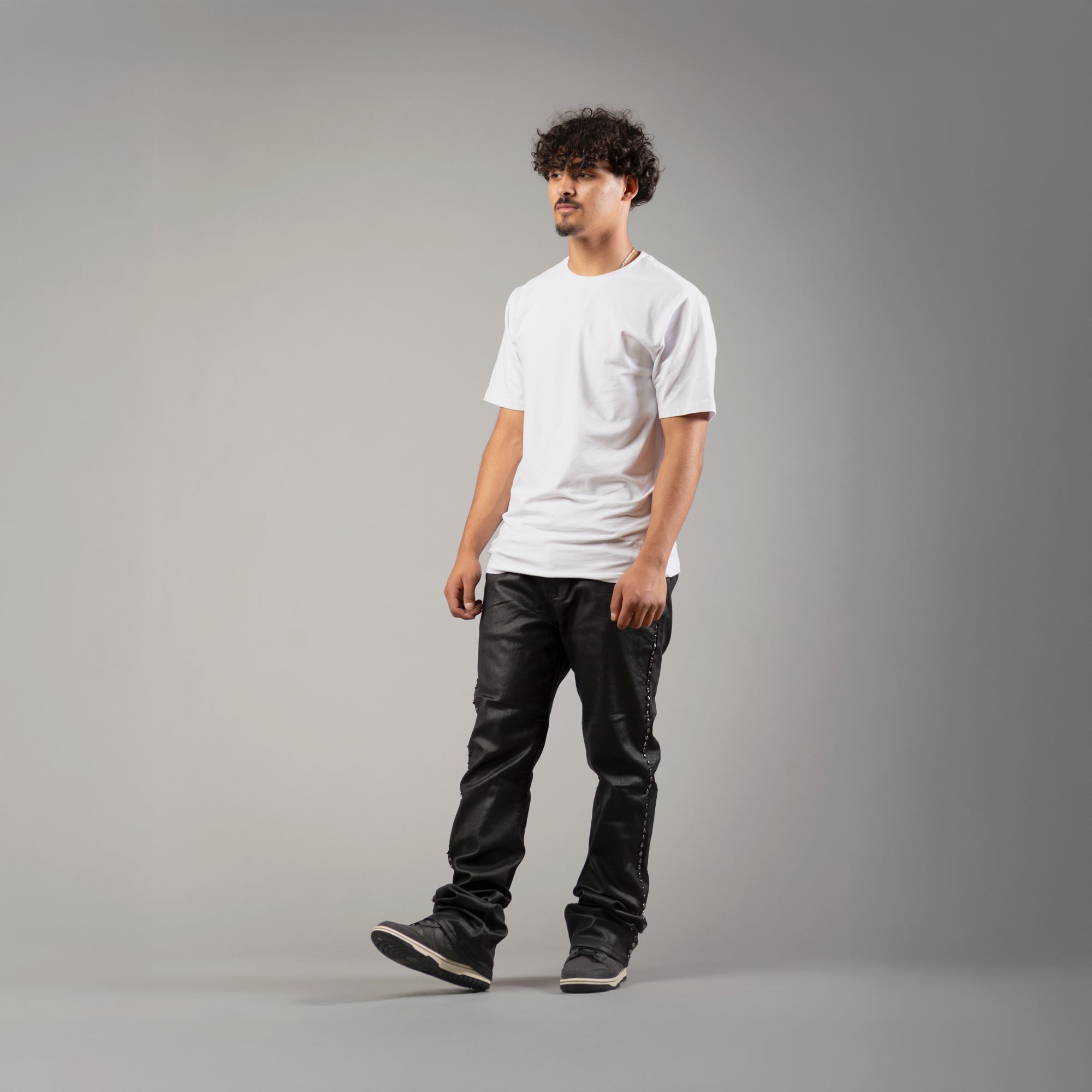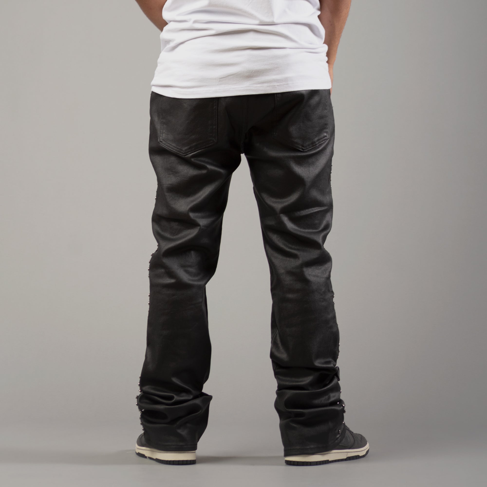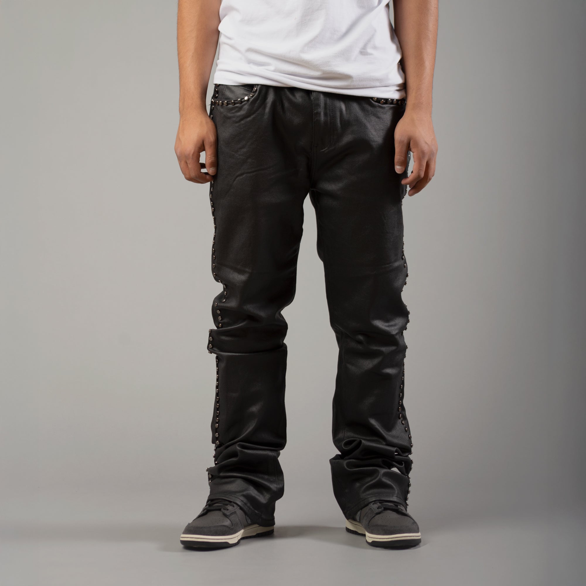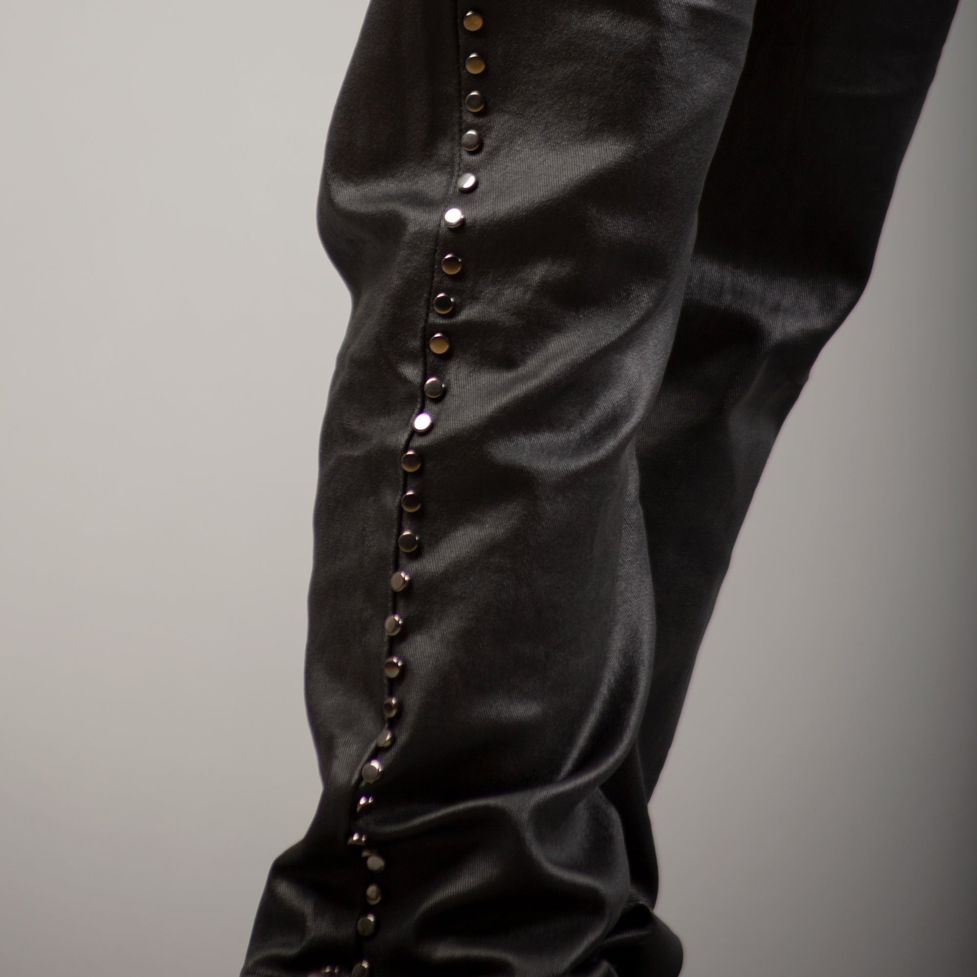 Crafted from a flexible 97% cotton / 3% spandex blend, they deliver both comfort and structure, enhanced with a premium wax-coated finish for a leather-like sheen. The standout embellished circle trim running along the pockets and outer seams adds a statement touch, giving these jeans a distinct elevated look.