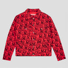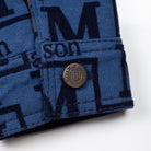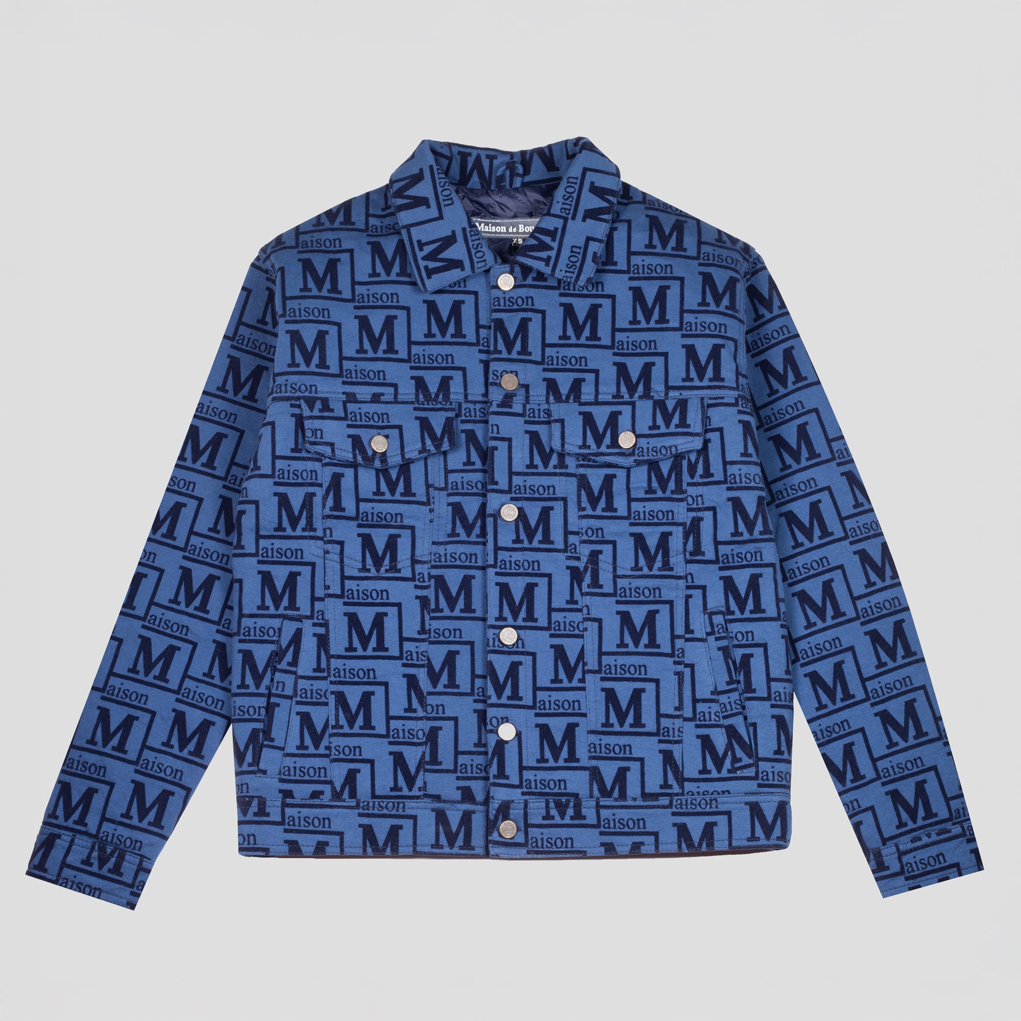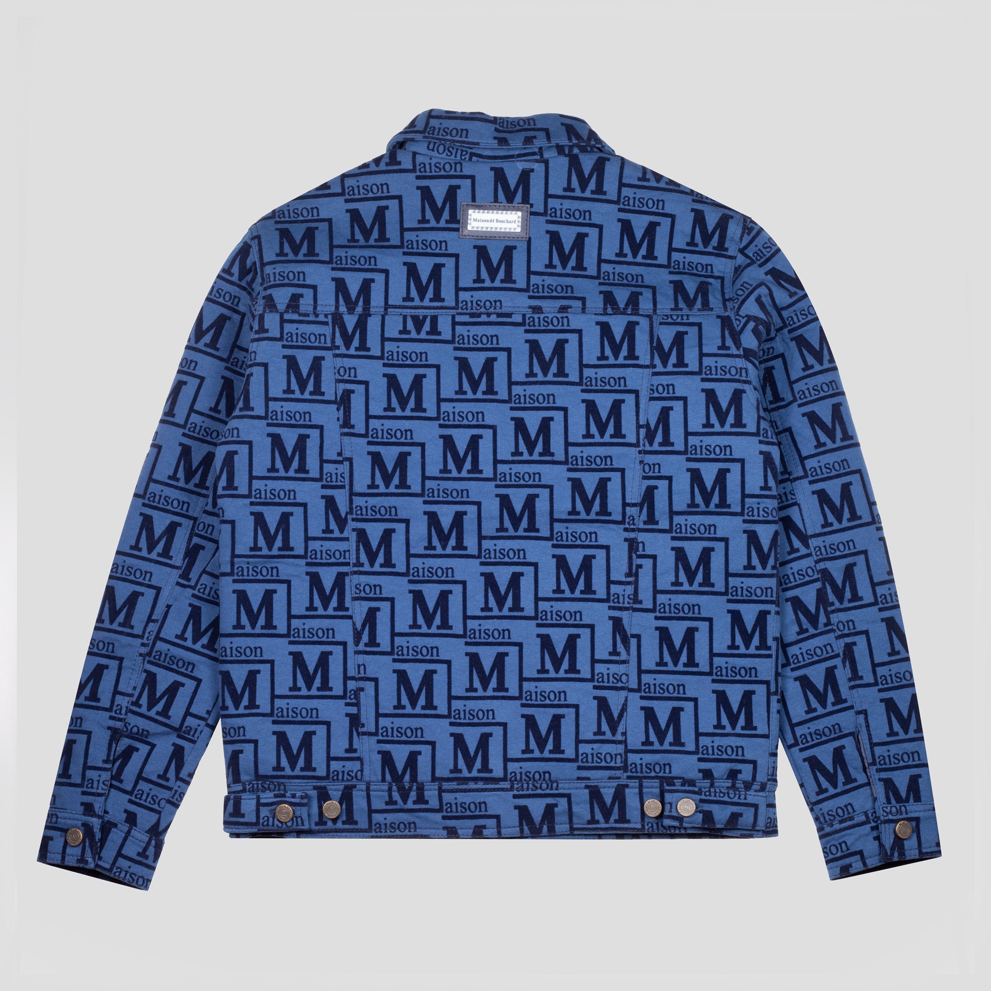Make a bold statement with this signature denim jacket featuring an all-over Maison de Bouchard monogram pattern. Designed with a classic structured fit, it includes a pointed collar, full button-down front, and multiple flap pockets for a timeless yet modern look. Crafted for versatility, this jacket pairs effortlessly with both casual and elevated outfits. A standout piece that blends contemporary branding with everyday wearability.