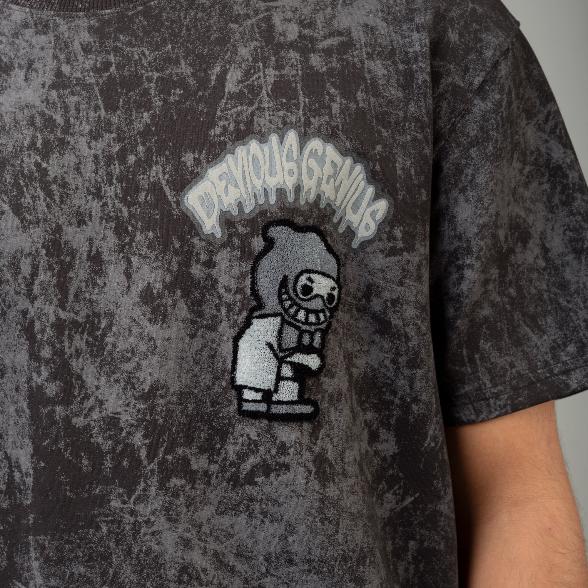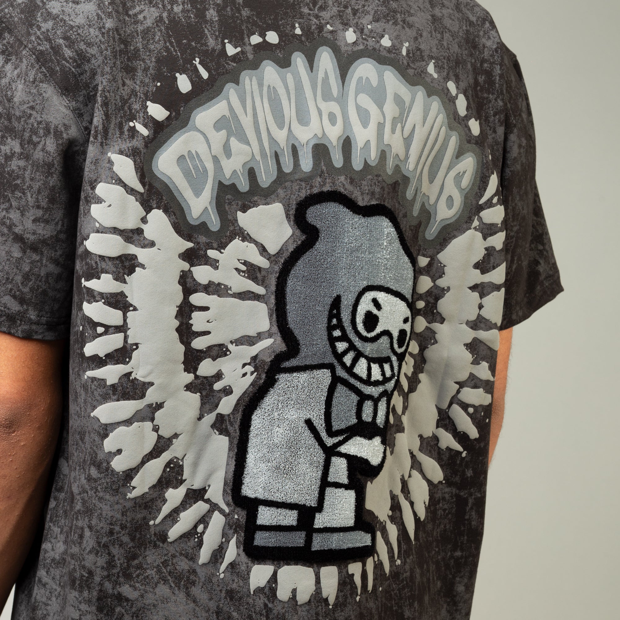 The front features a standout raised velour character logo full of dimension and personality. On the back, a large raised velour graphic delivers even bigger impact, while the puff print Devious Genius “Drip” logo adds extra texture and visual punch. Finished in a washed black colorway, this tee brings a rugged, vintage-inspired edge that pairs effortlessly with denim, cargos, or shorts.