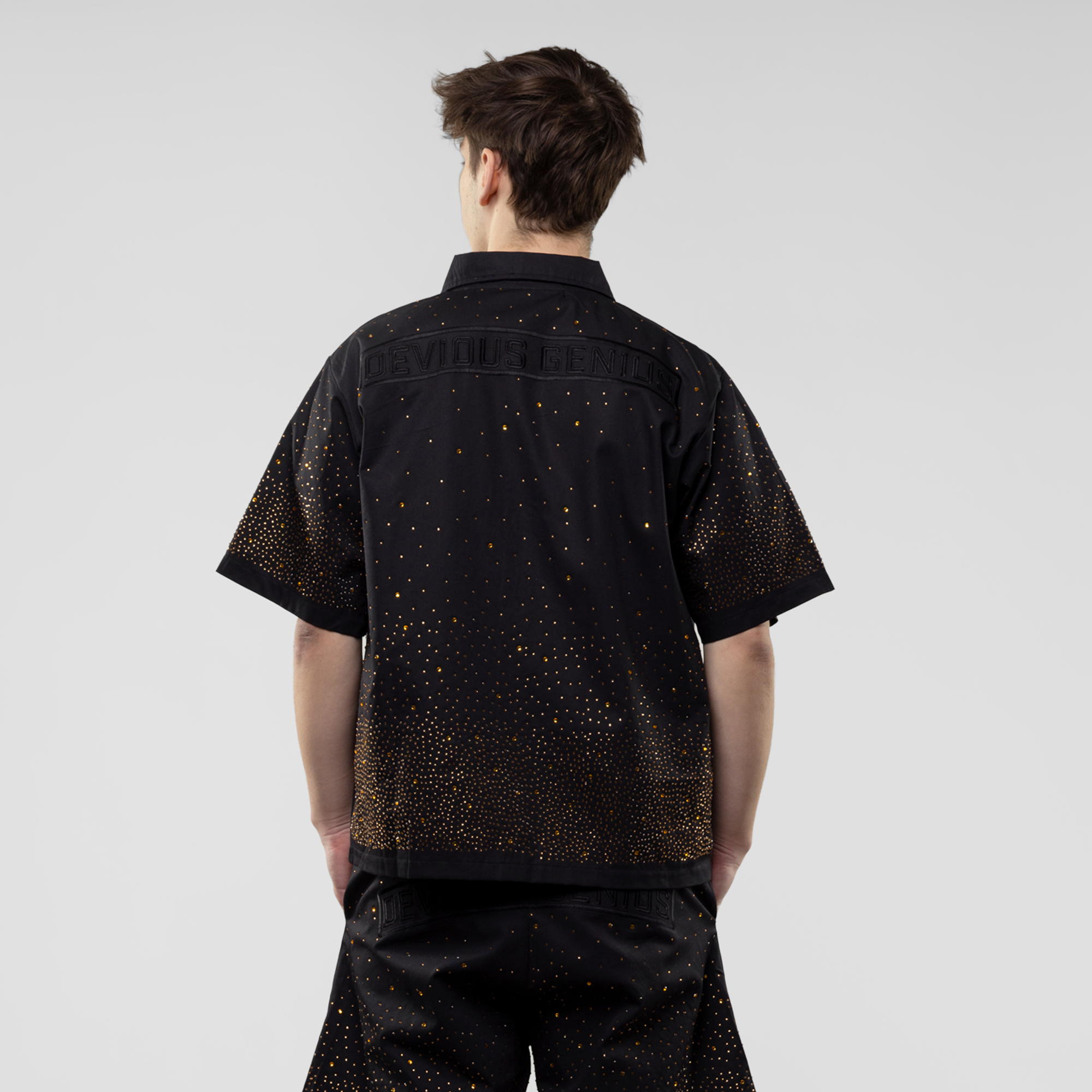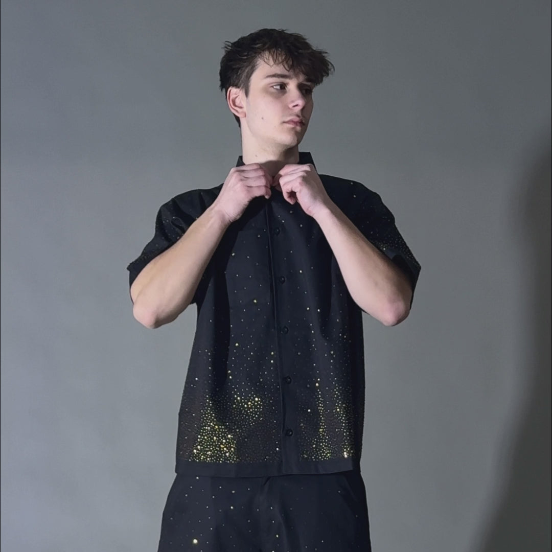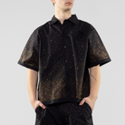 Make a bold entrance with this high-end Devious Genius Star Studded Short Sleeve Woven Shirt, designed to elevate your casual and nightlife wardrobe. Featuring a unique gradient pattern of shimmering silver rhinestones against a deep black base, this shirt is perfect for festivals, stage performances, concerts, and any night out.