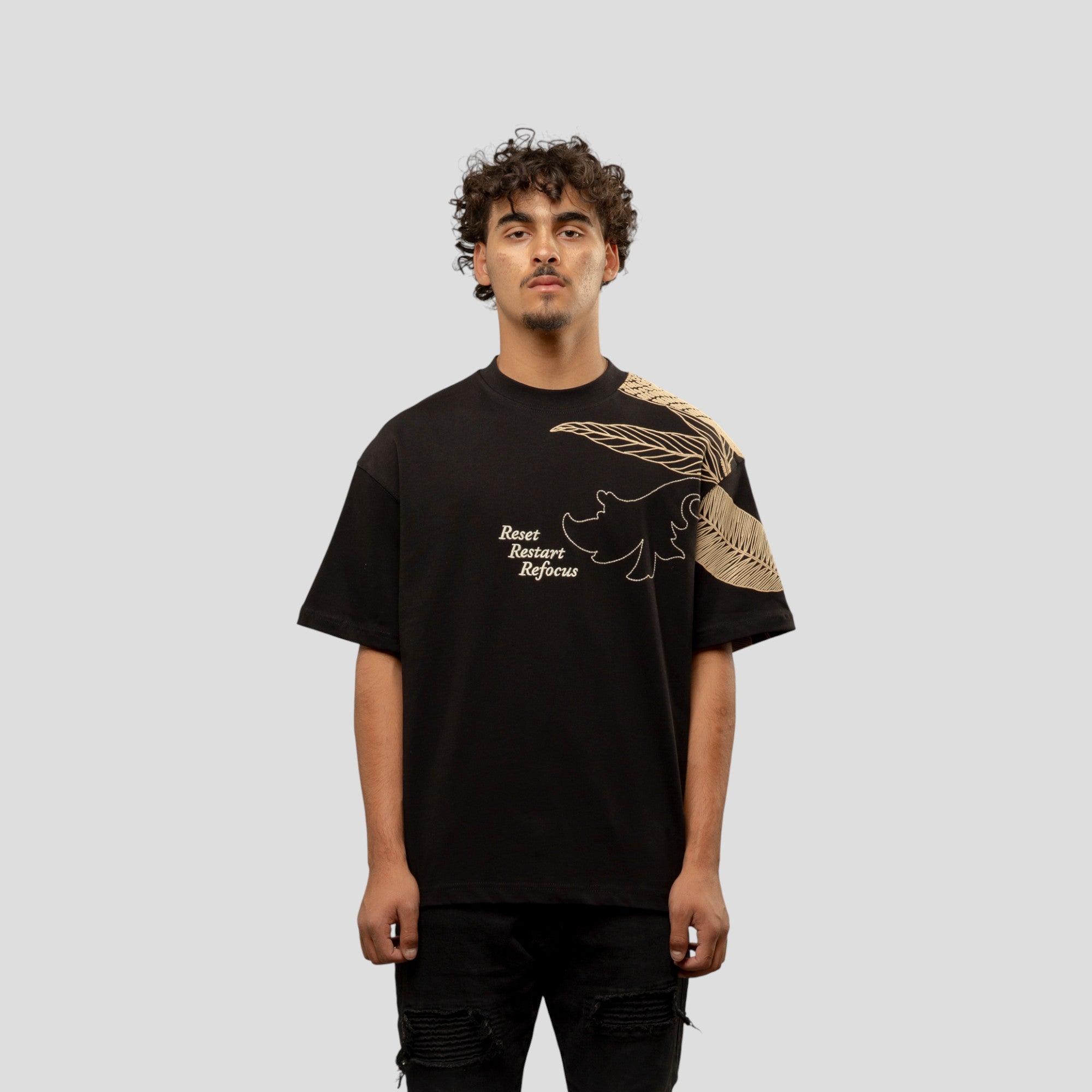 The front showcases layered rubberized, embroidered, and flat print designs, creating a striking multidimensional look. The motivational phrase “Reset, Restart, Refocus” is paired with large flowing botanical linework that continues across the shoulder, giving the piece a dynamic, elevated aesthetic.