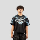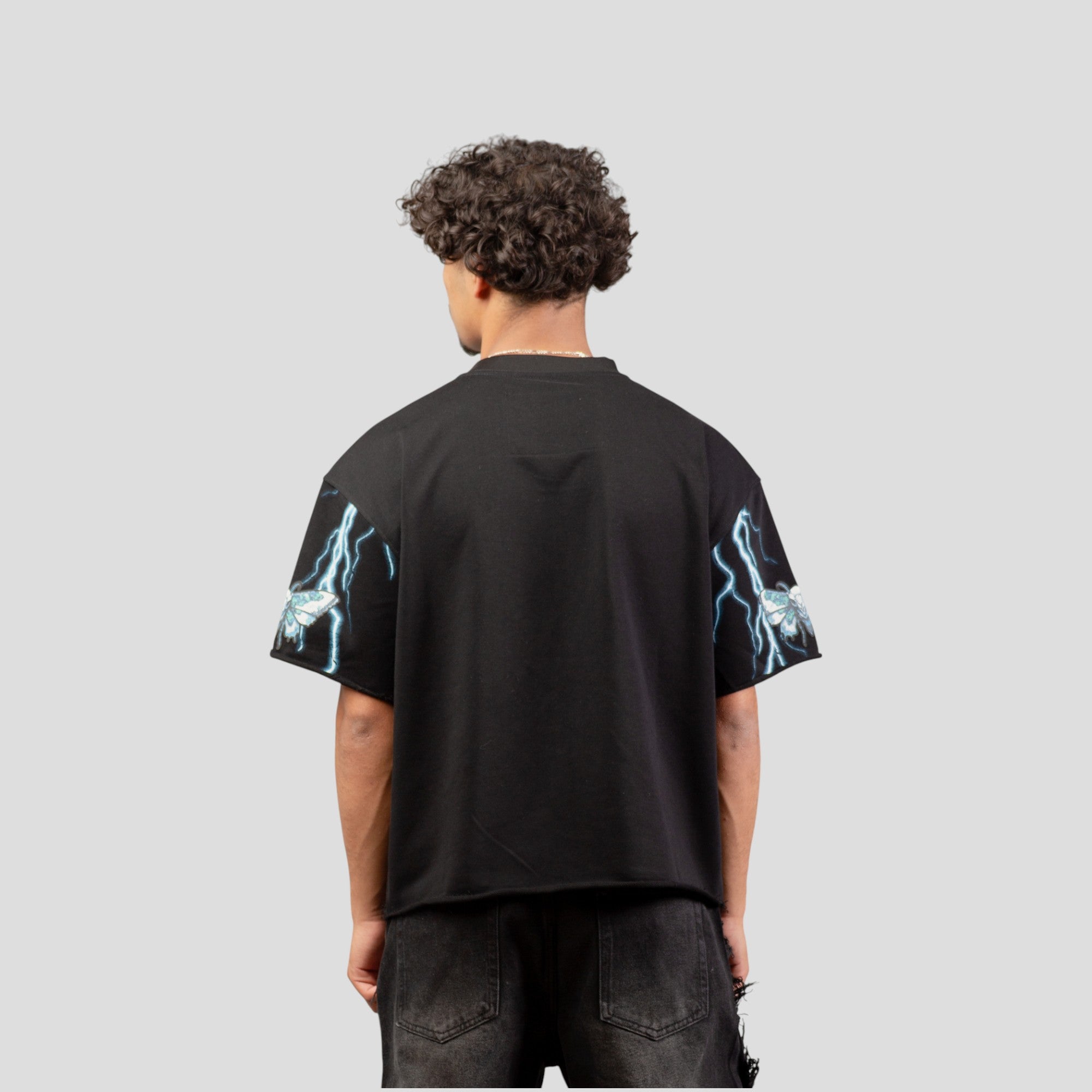 Turn up the statement energy with the Hidden Treasures Studded Gem Graphic T-Shirt, a bold fusion of electric artwork and shimmering embellishment. This tee features a powerful electric print graphic design with lightning elements and a detailed gem-inspired moth motif, amplified by rhinestone-studded accents that add dimension and shine.