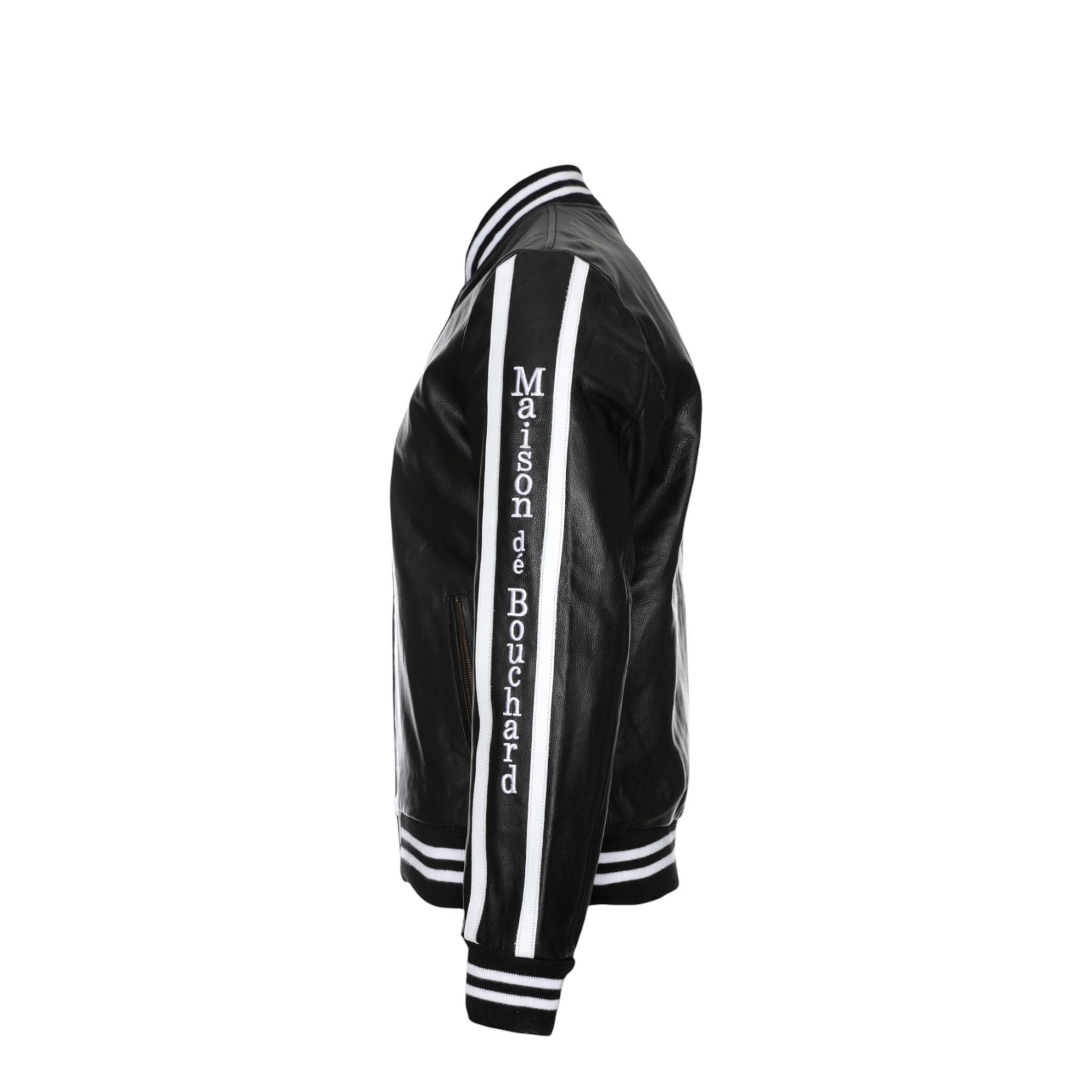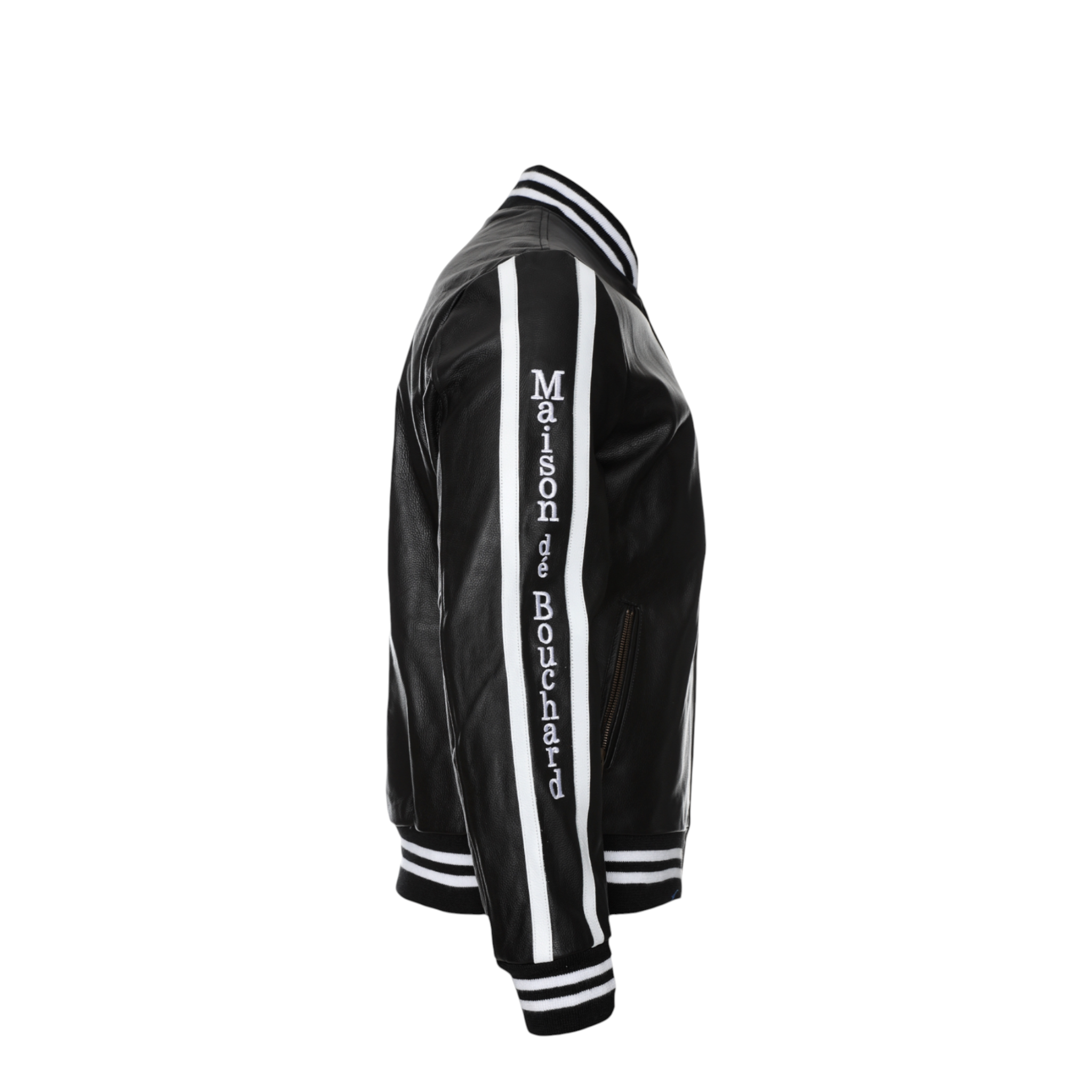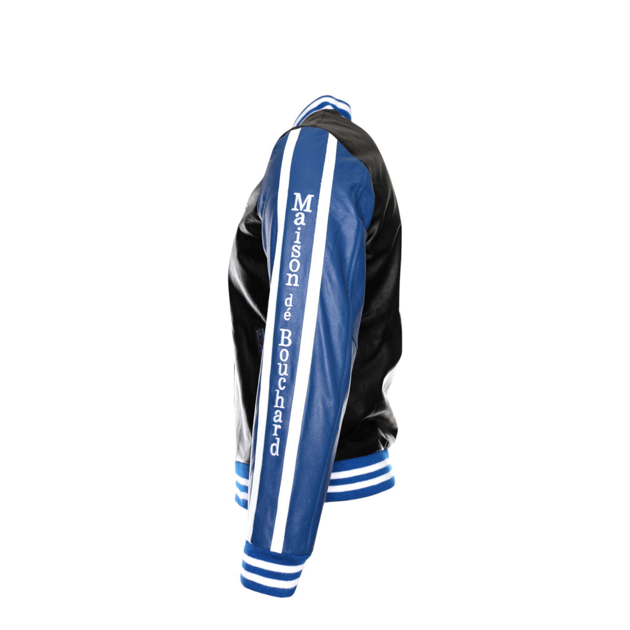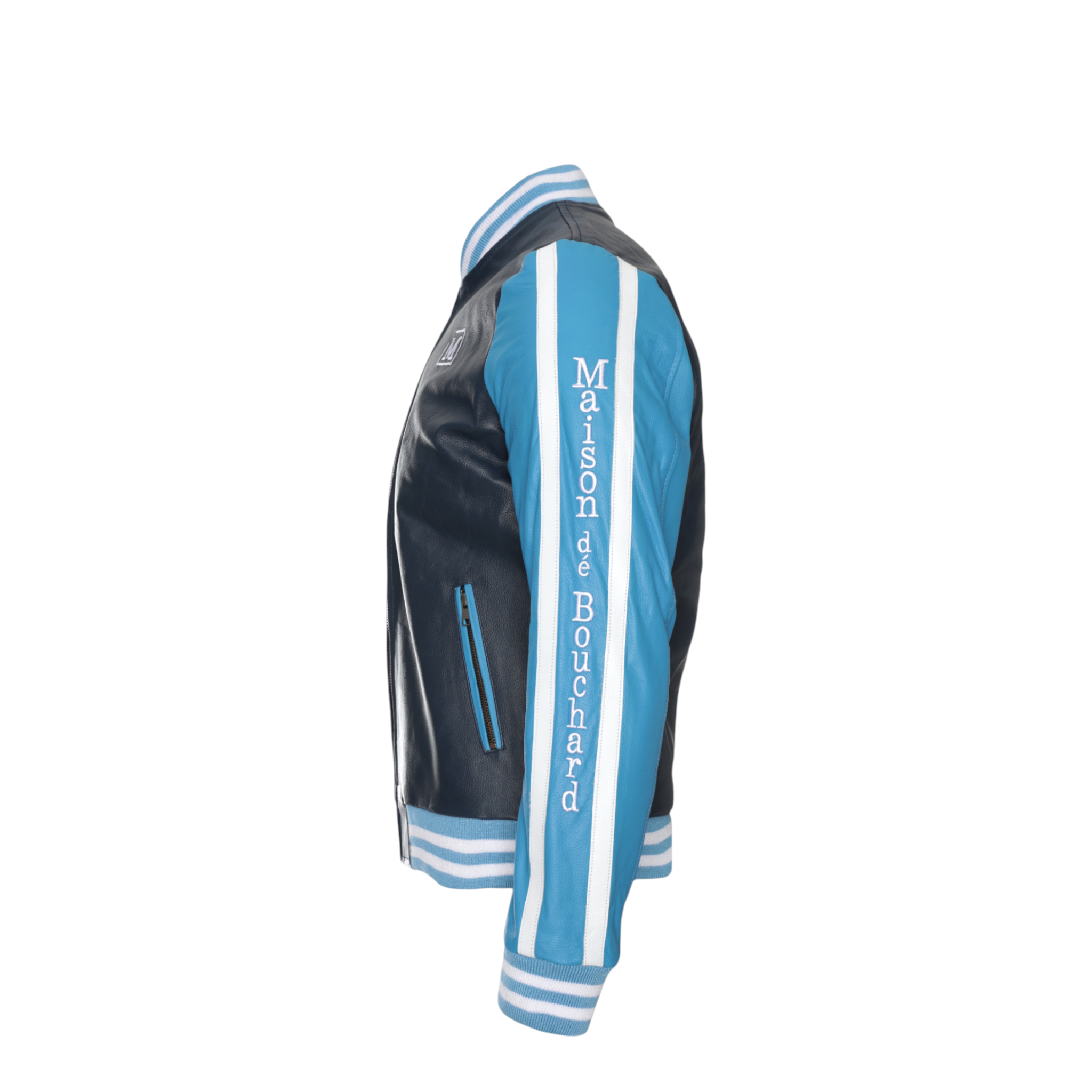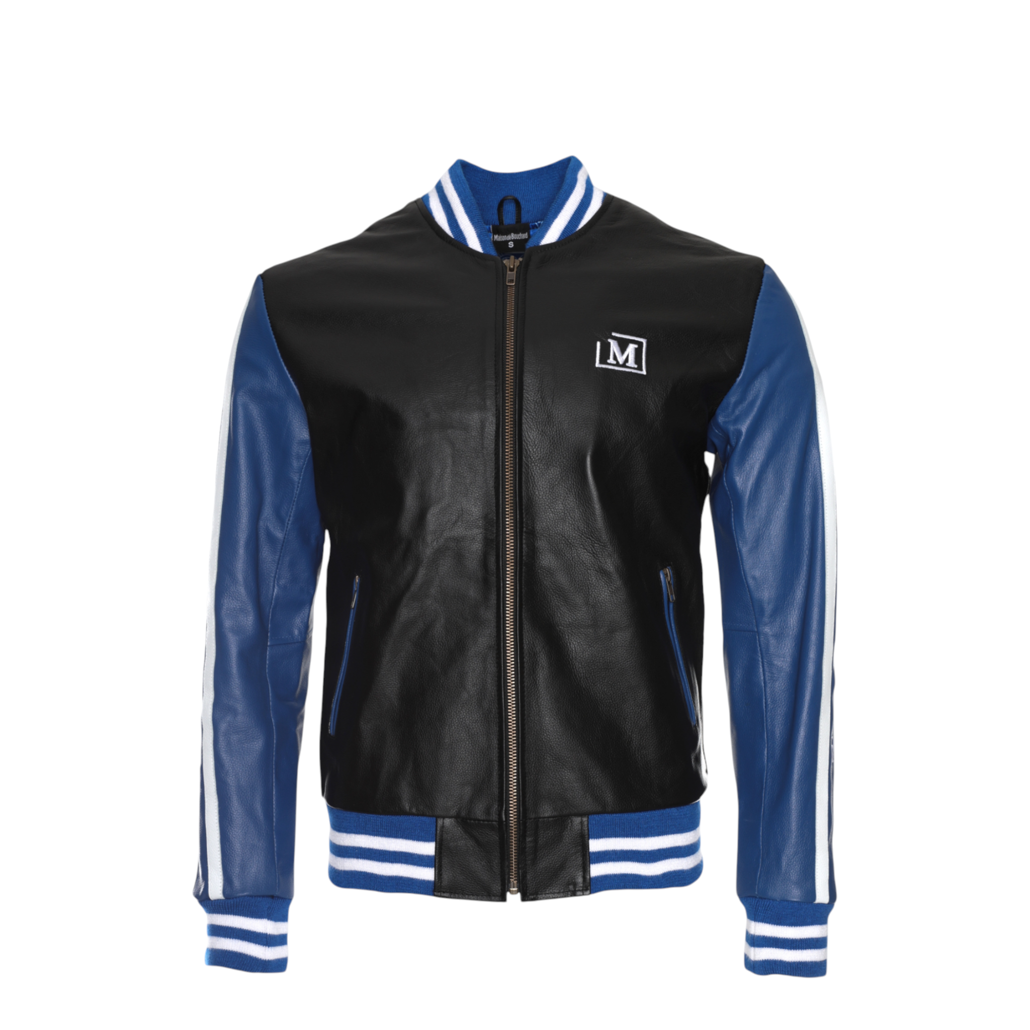 The front features a clean silhouette accented by an embroidered Maison dé Bouchard “M” chest patch, while the sleeves showcase bold logo tape detailing for a modern edge. Ribbed cuffs and hem provide a classic bomber fit, ensuring comfort and shape retention.