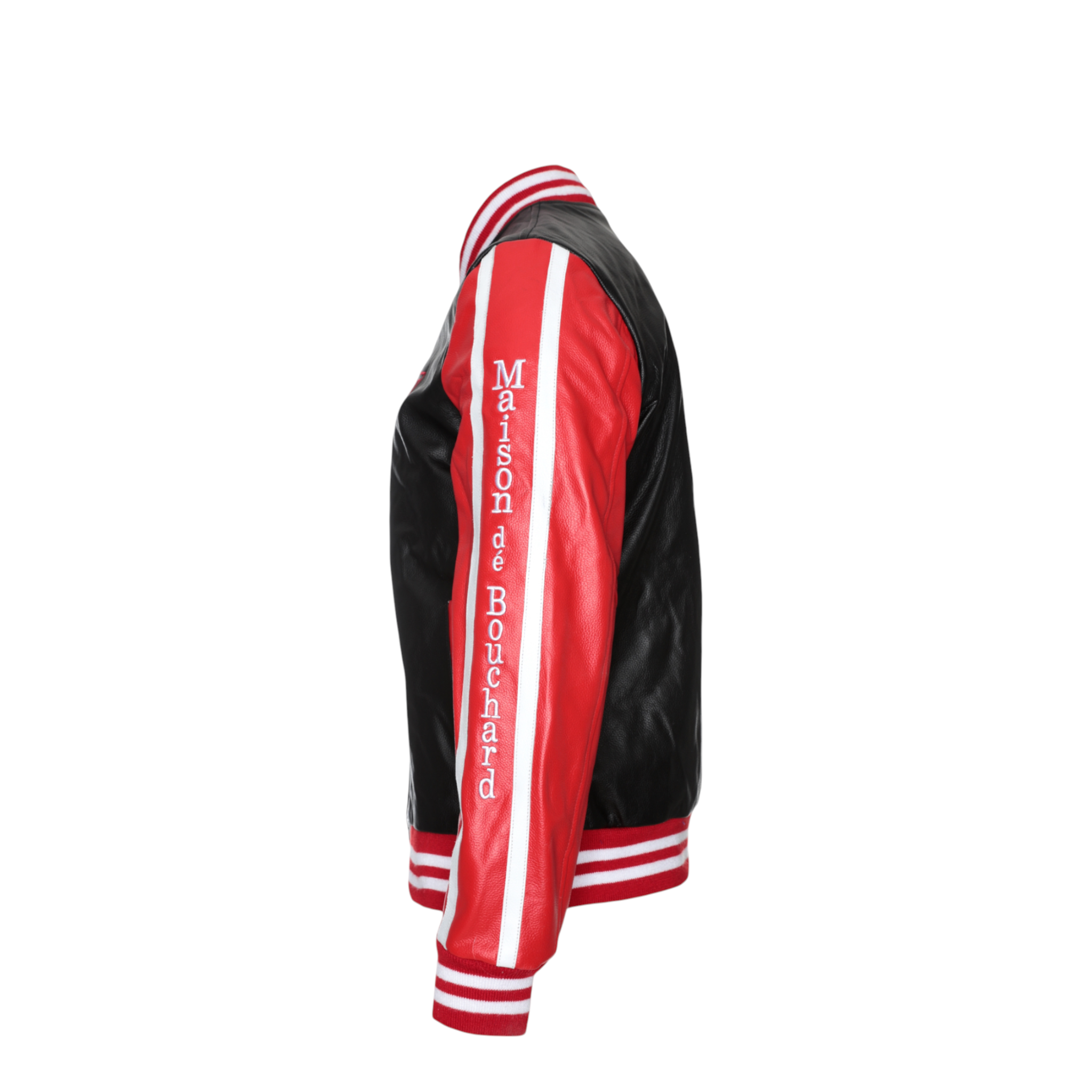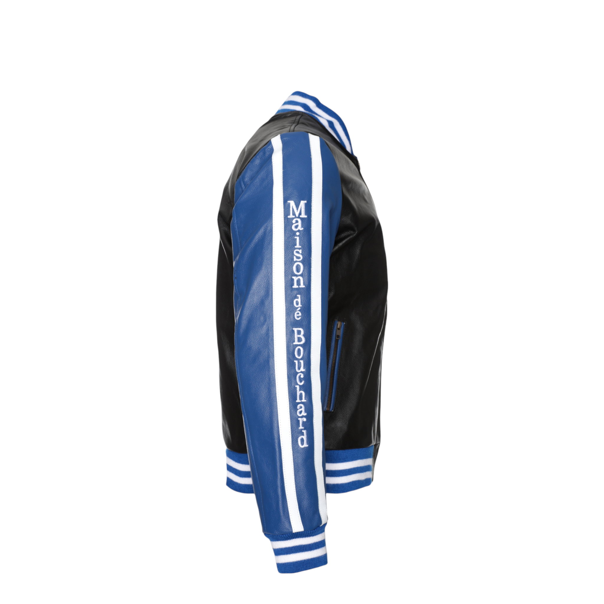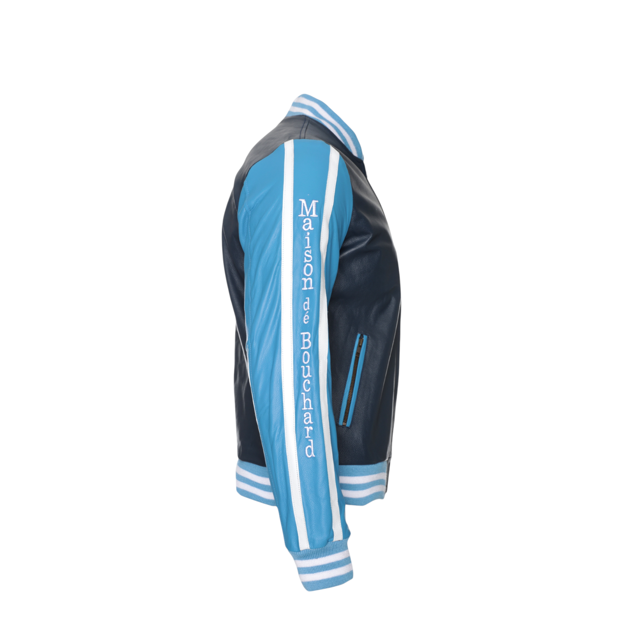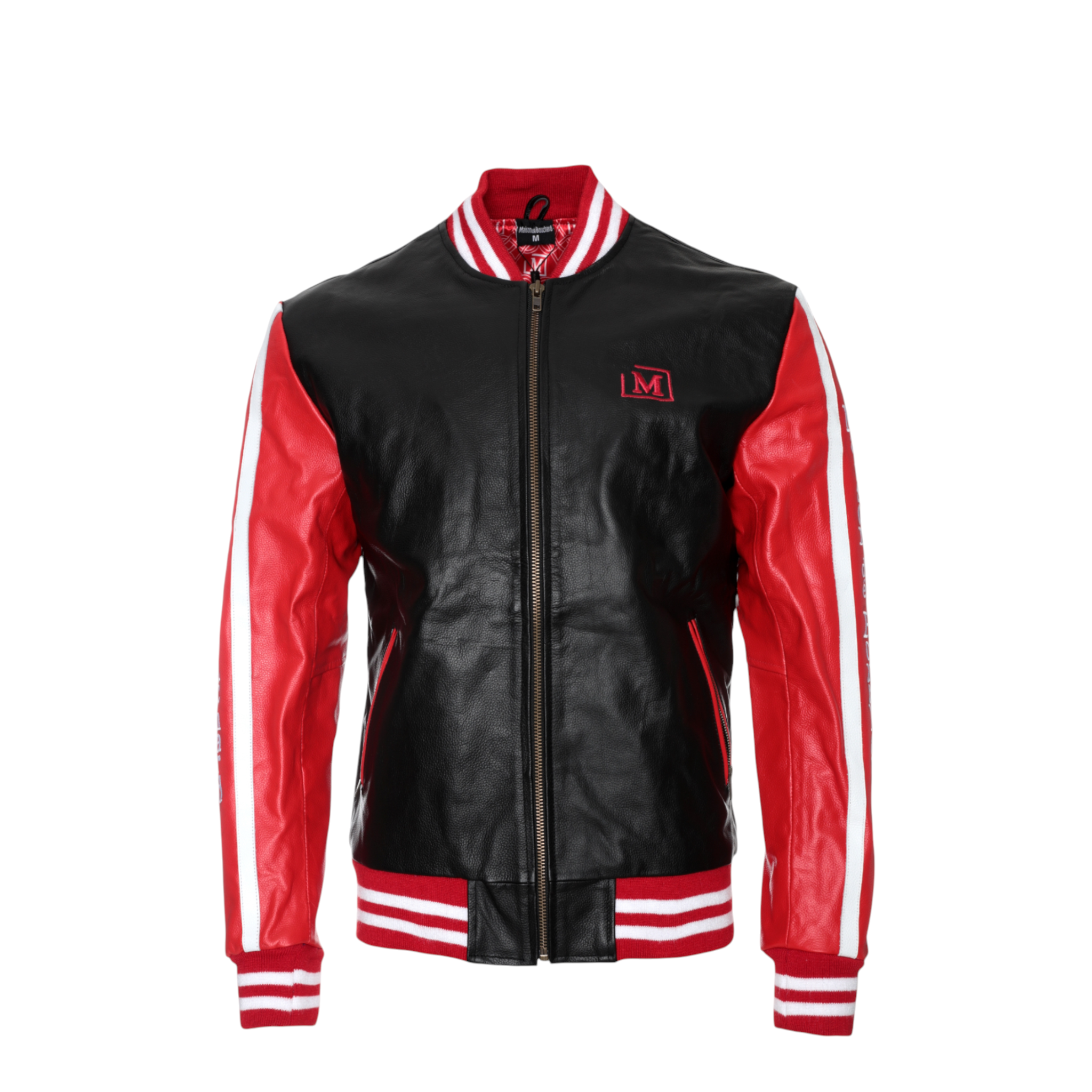 The front features a clean silhouette accented by an embroidered Maison dé Bouchard “M” chest patch, while the sleeves showcase bold logo tape detailing for a modern edge. Ribbed cuffs and hem provide a classic bomber fit, ensuring comfort and shape retention.
