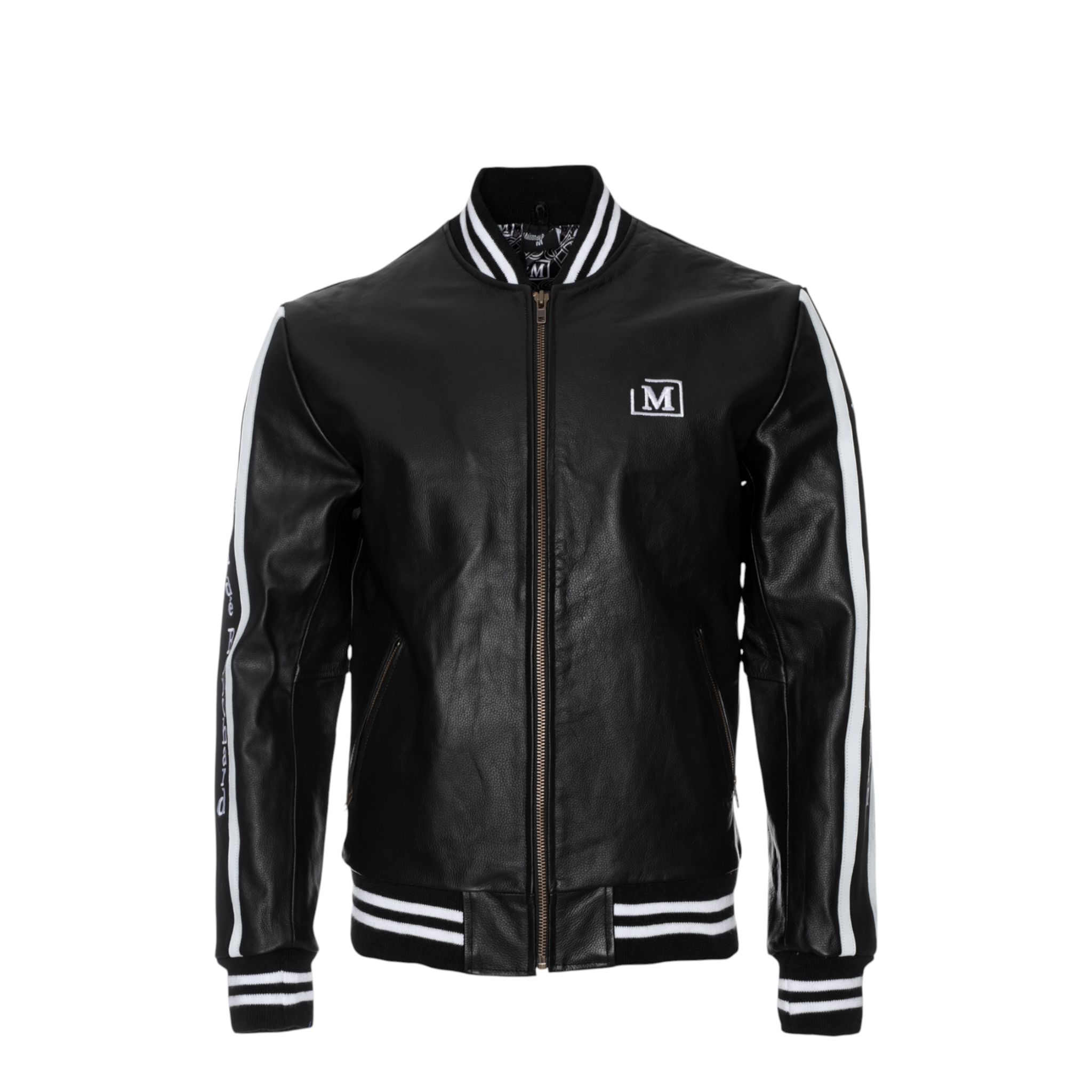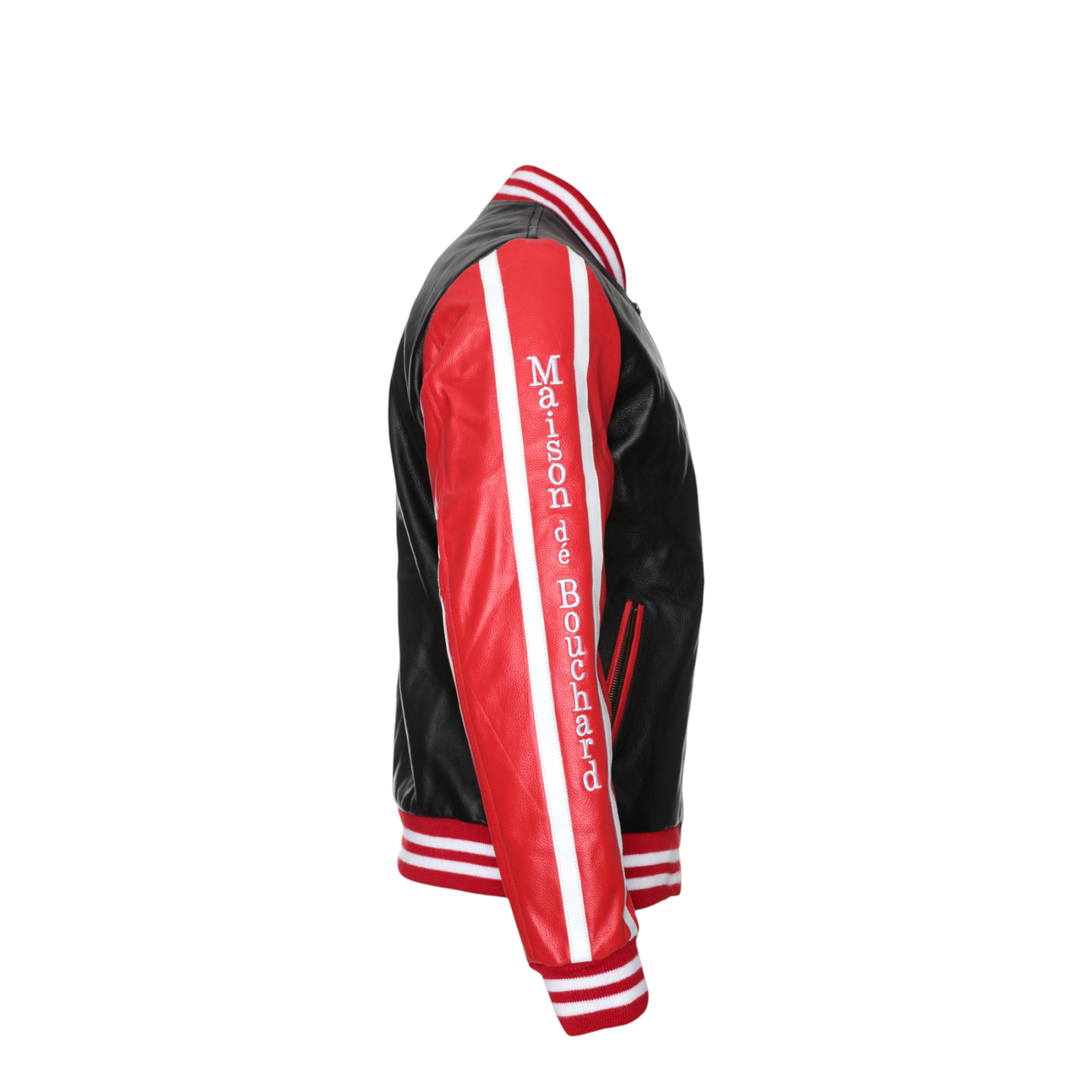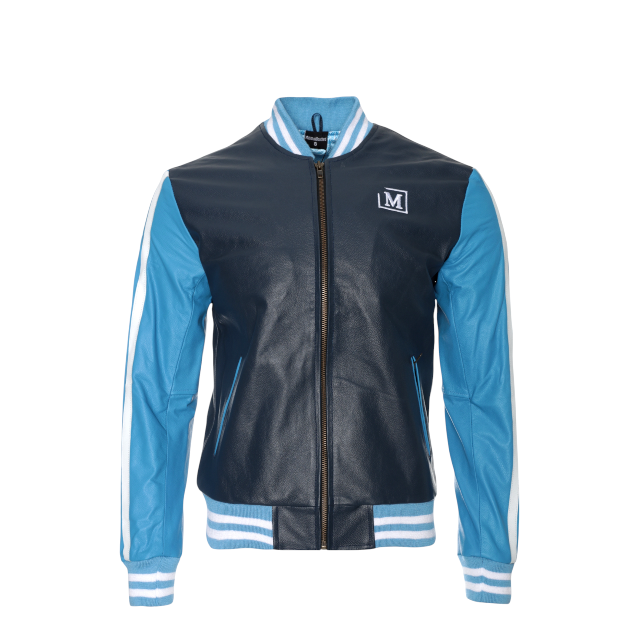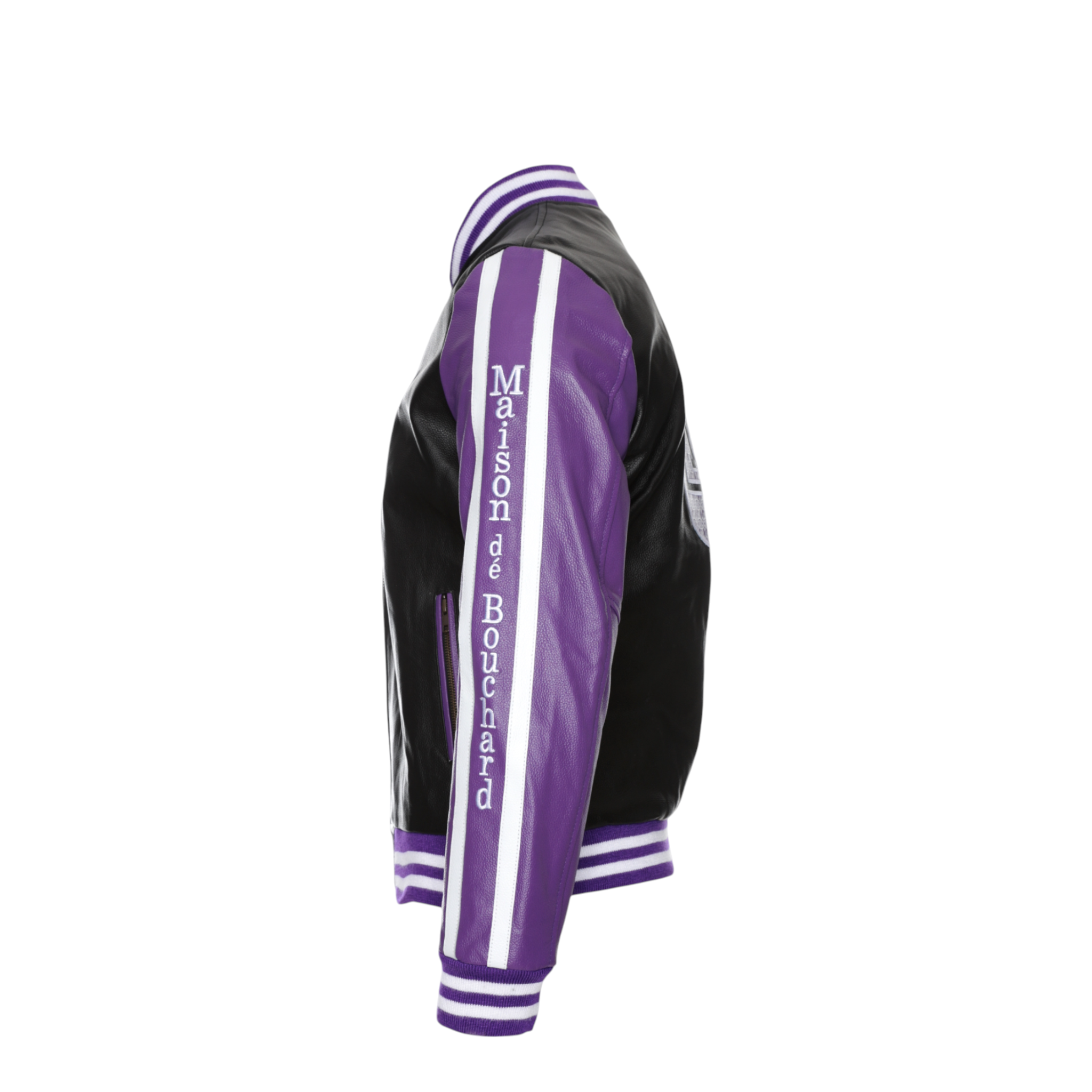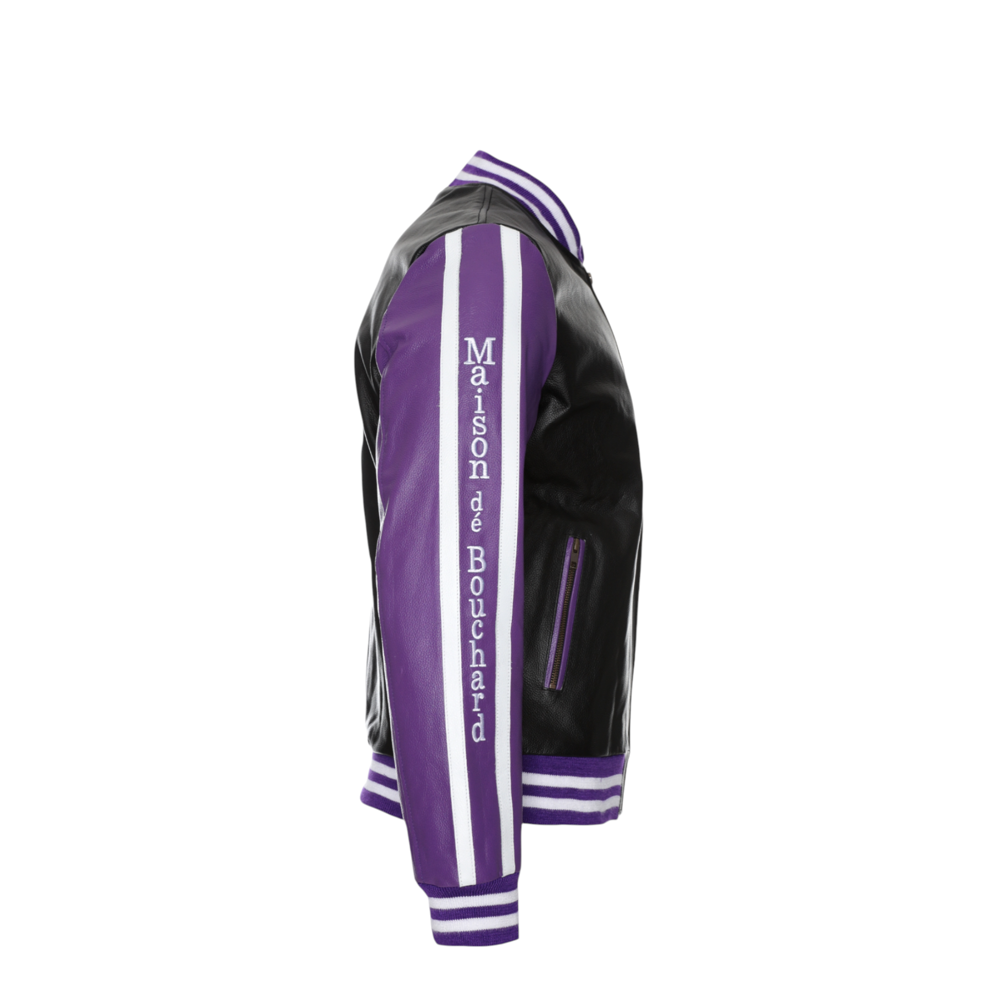 The front features a clean silhouette accented by an embroidered Maison dé Bouchard “M” chest patch, while the sleeves showcase bold logo tape detailing for a modern edge. Ribbed cuffs and hem provide a classic bomber fit, ensuring comfort and shape retention.