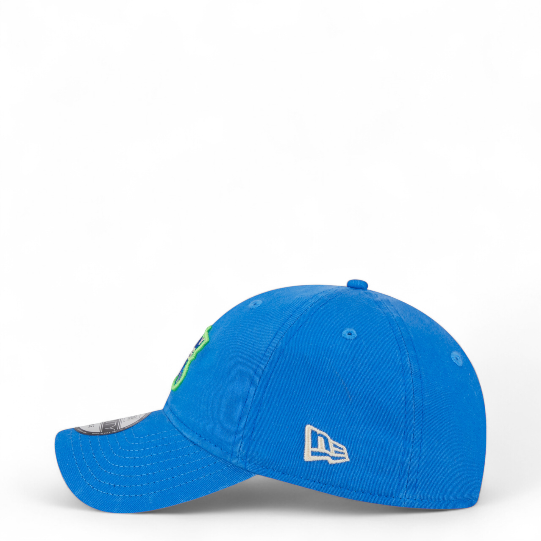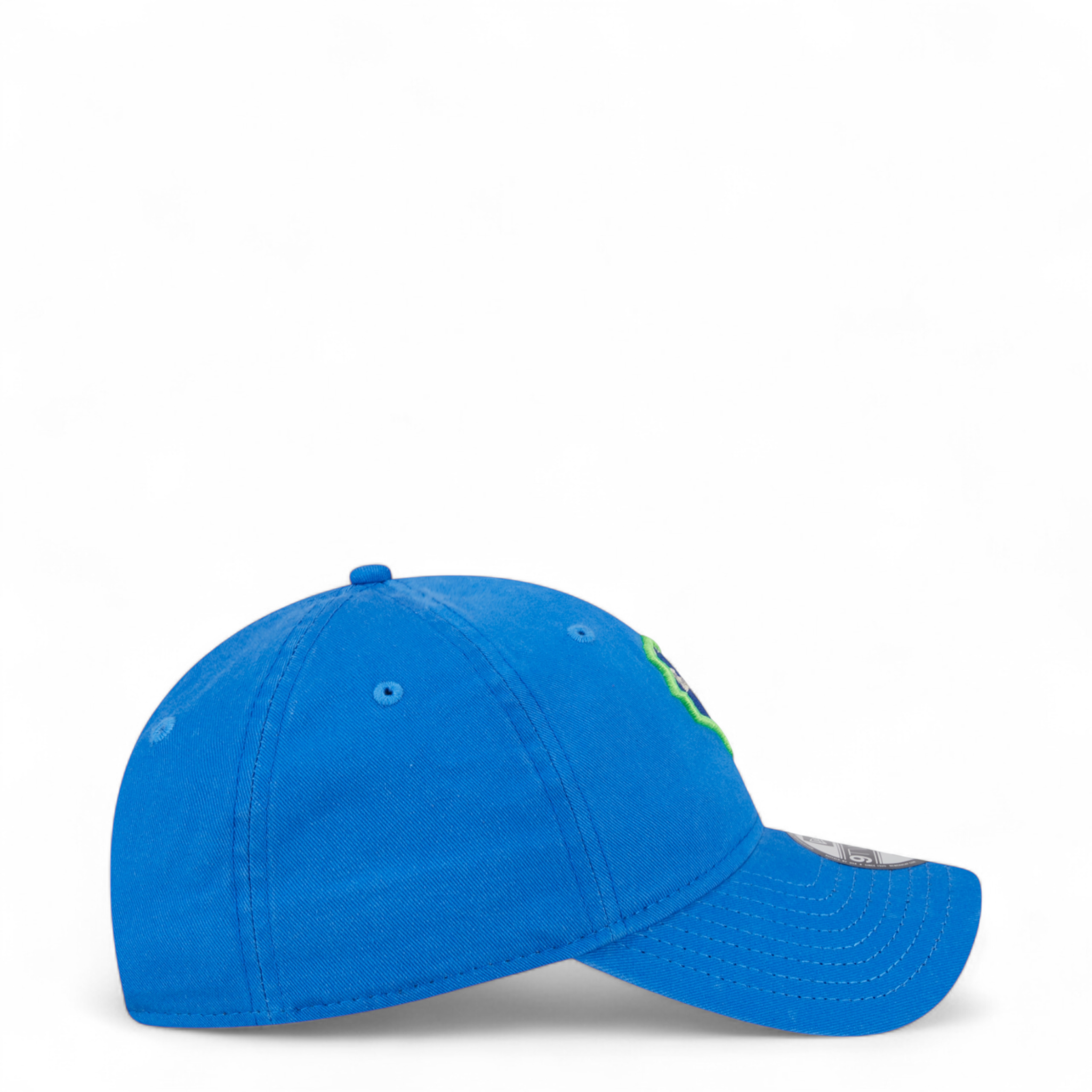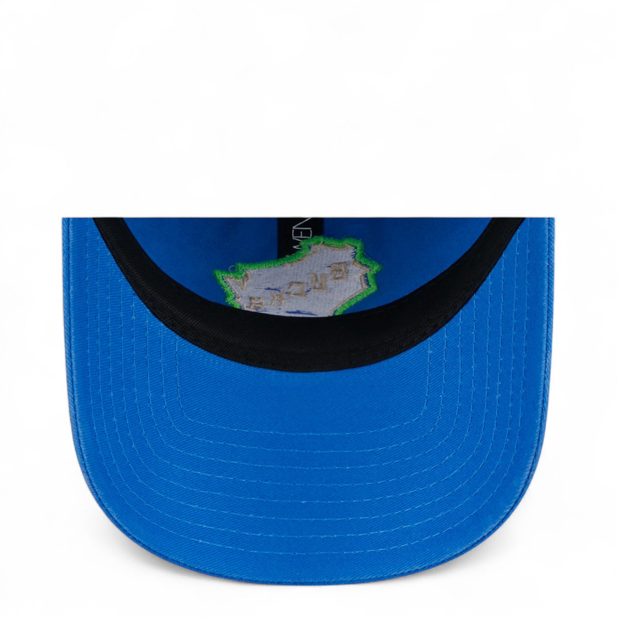 The Milwaukee Bucks City Edition 9TWENTY Adjustable Twill Cap features an embroidered Bucks logo at the front panels with an official NBA Logoman tag at the rear. Additional details include a blue undervisor and an adjustable D-ring strap closure at the rear.
