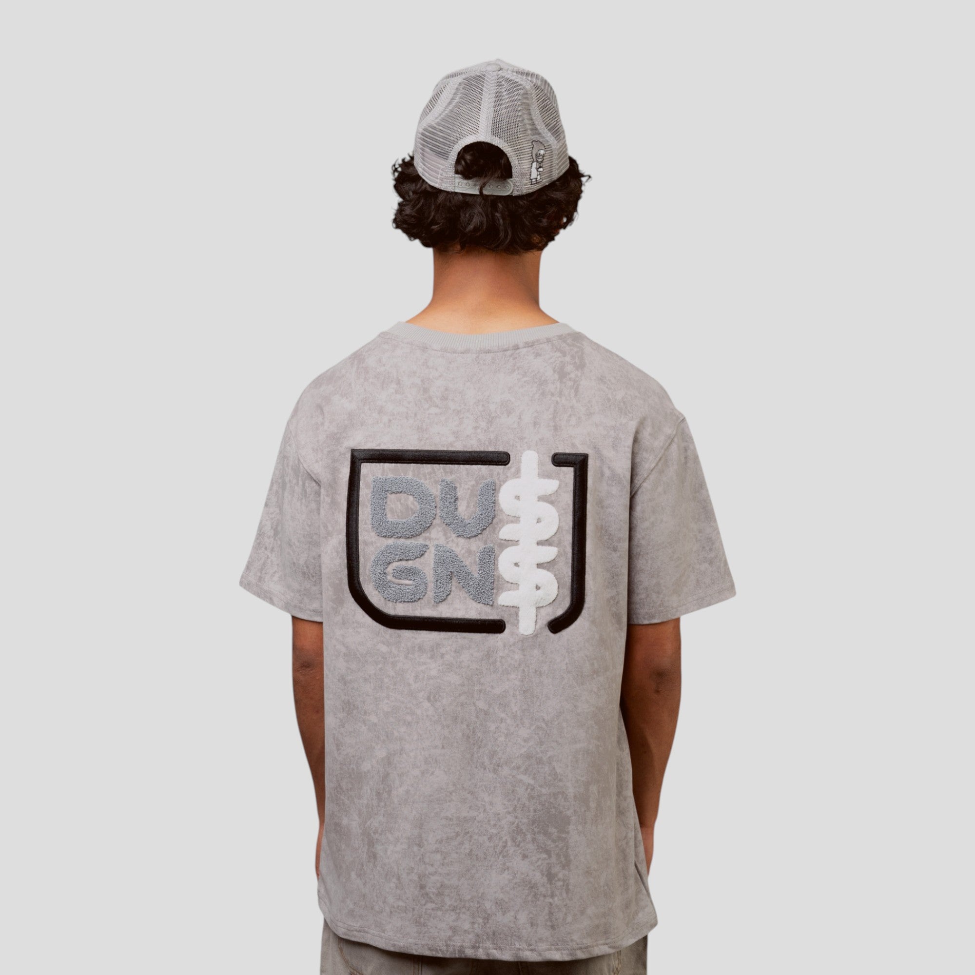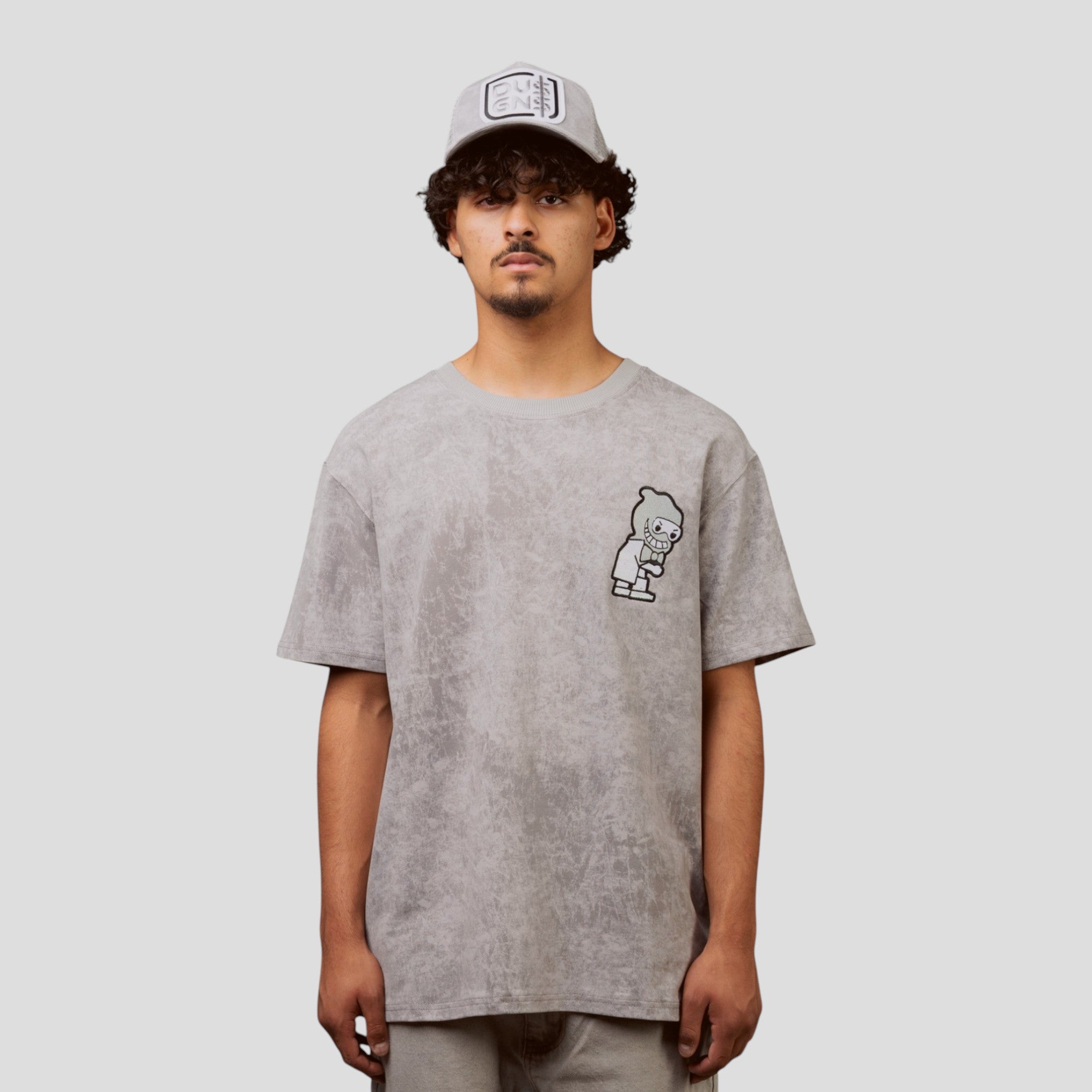 The front displays a detailed embroidered DG character logo, offering personality and premium craftsmanship. On the back, a bold chenille and embroidered logo brings elevated texture and unmistakable branding. The washed grey finish adds a rugged, vintage-inspired edge that pairs perfectly with cargos, denim, or shorts.