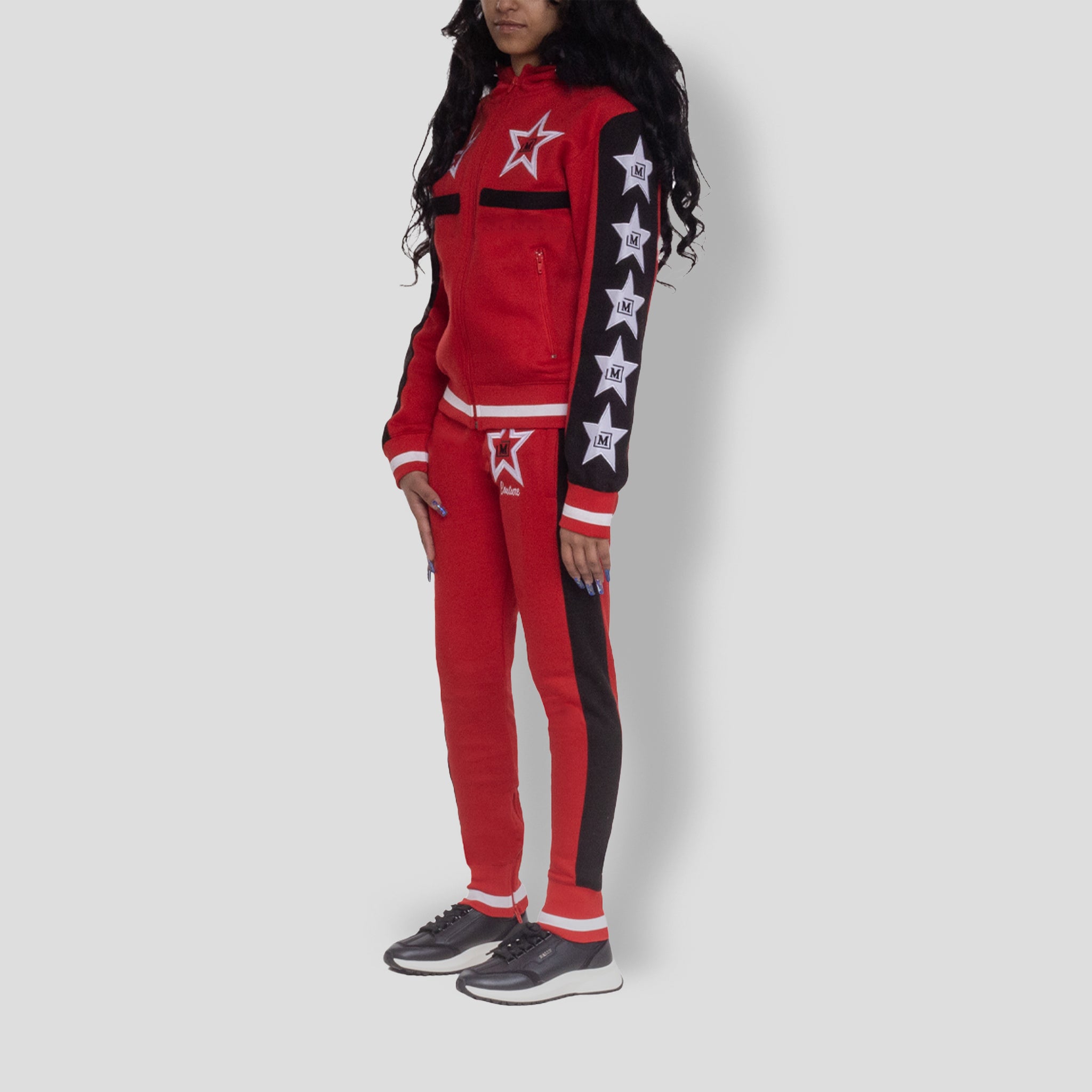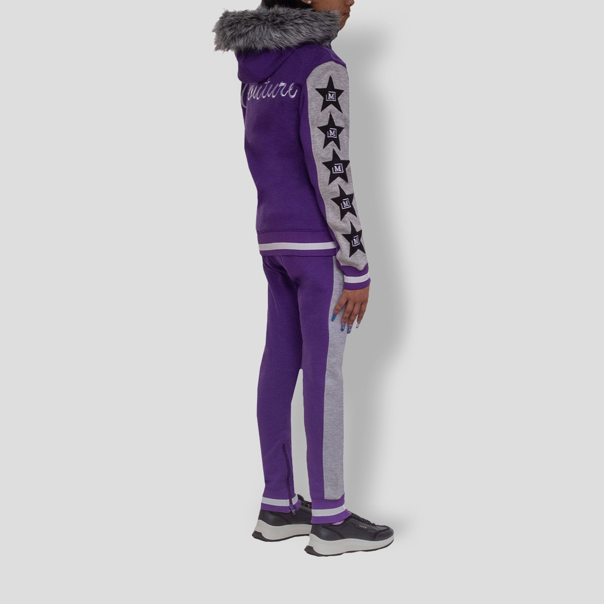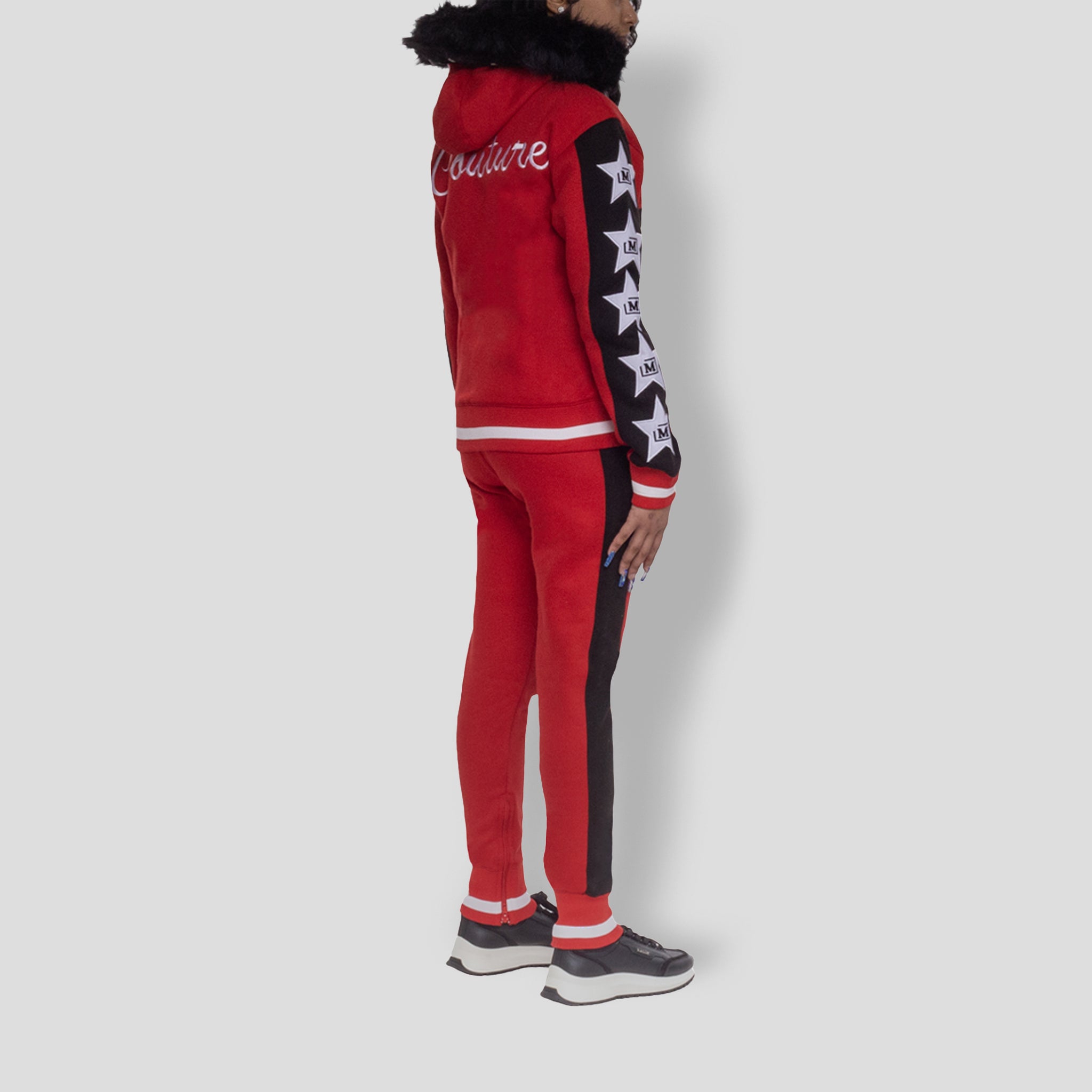 New for Spring '22, the MDB Couture Women's M-Star Fleece Suit combines comfort and style.  Made with a soft cotton fleece, it features a removable fur trim around the hood with embroidered stars on the front chest as well as on the pant.